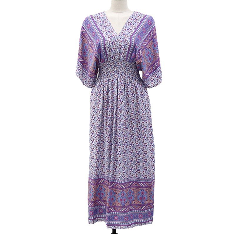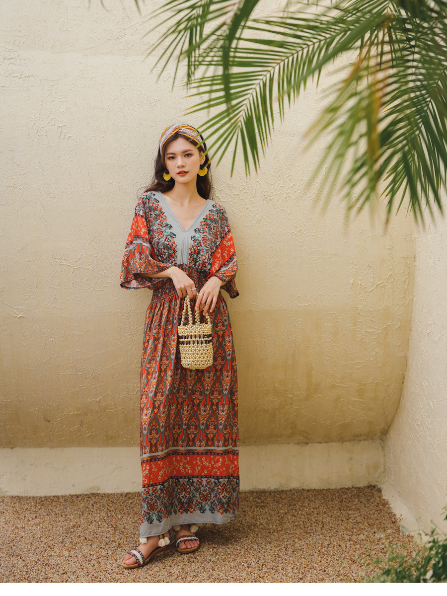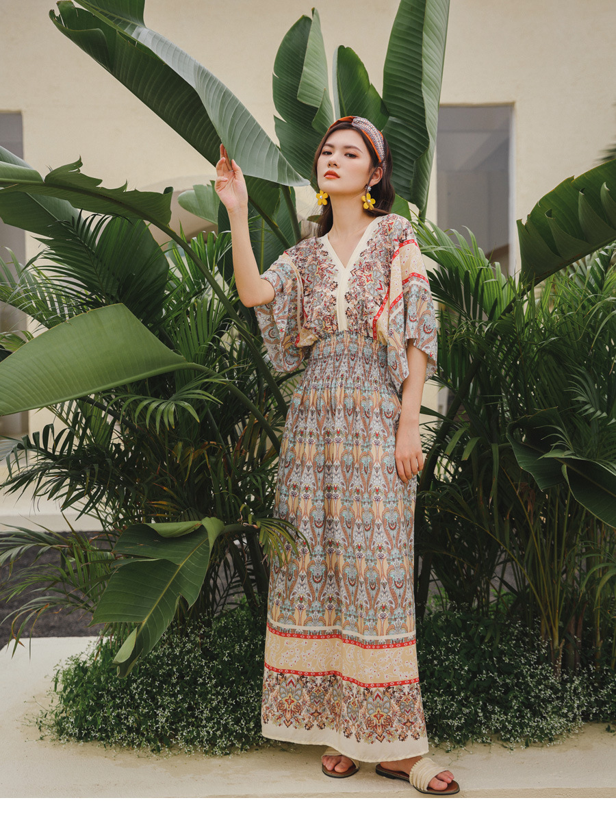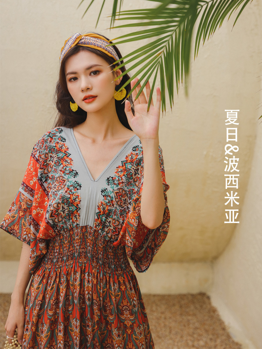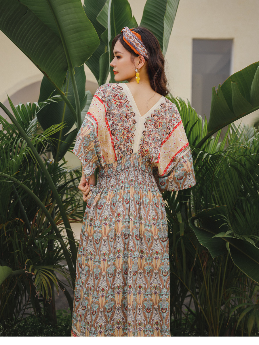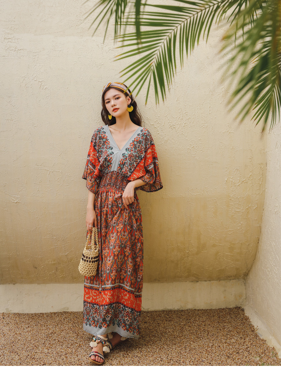 국경 간 민족 스타일 V-목면 실크 반팔 비치 스커트 태국 여행 원피스 여름 인쇄 휴일 꽃 스커트