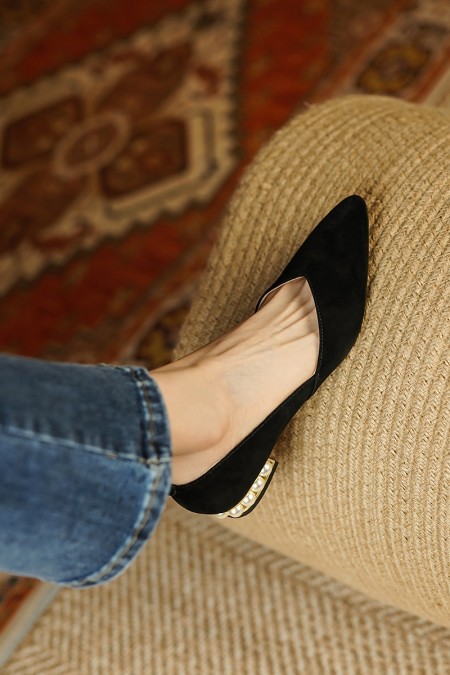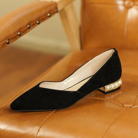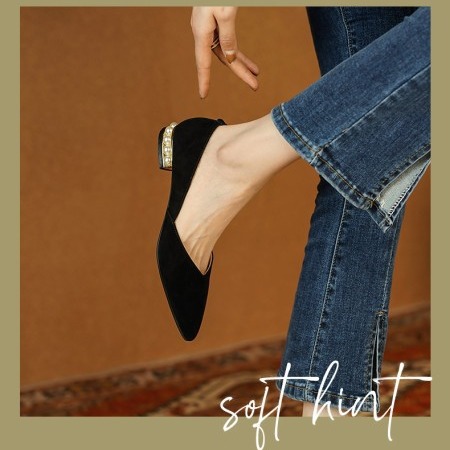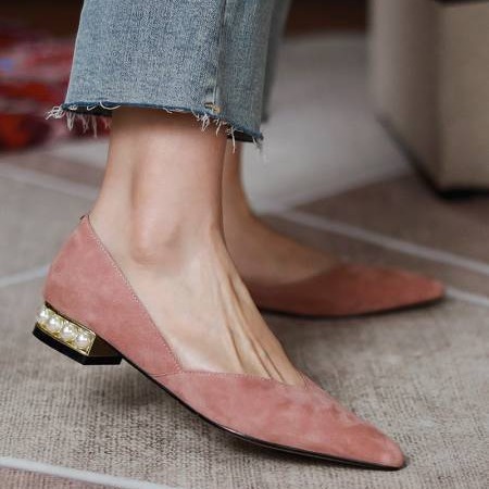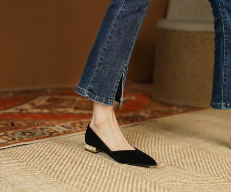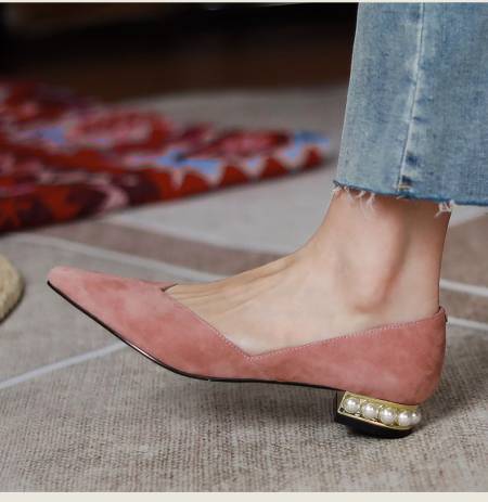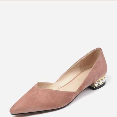 양가죽 패드 포인티드 토 여성용 2025 로우힐 우아한 오피스룩 굽이 두꺼운 워크 슈즈 얕은 굽 진주 장식 천연 가죽 플랫 슈즈