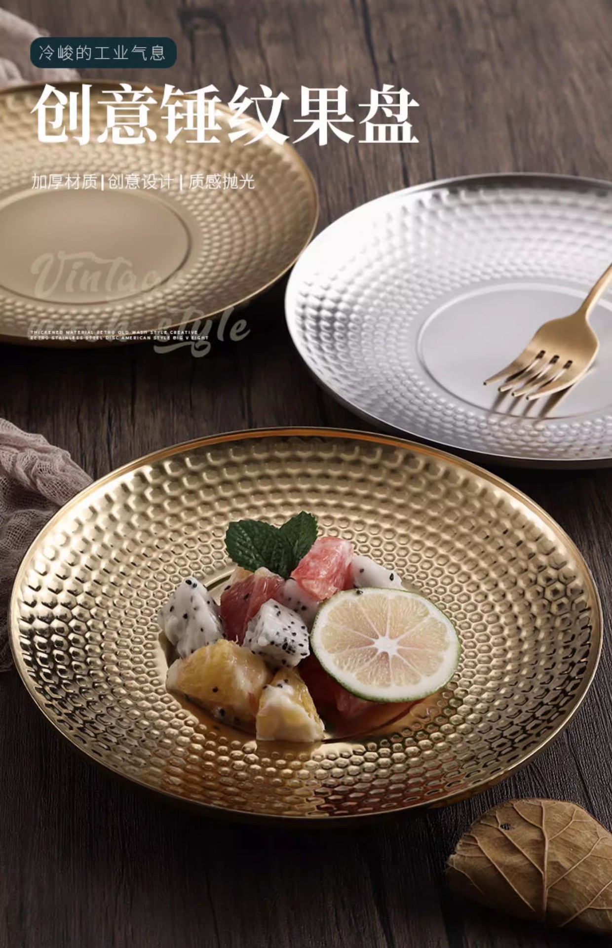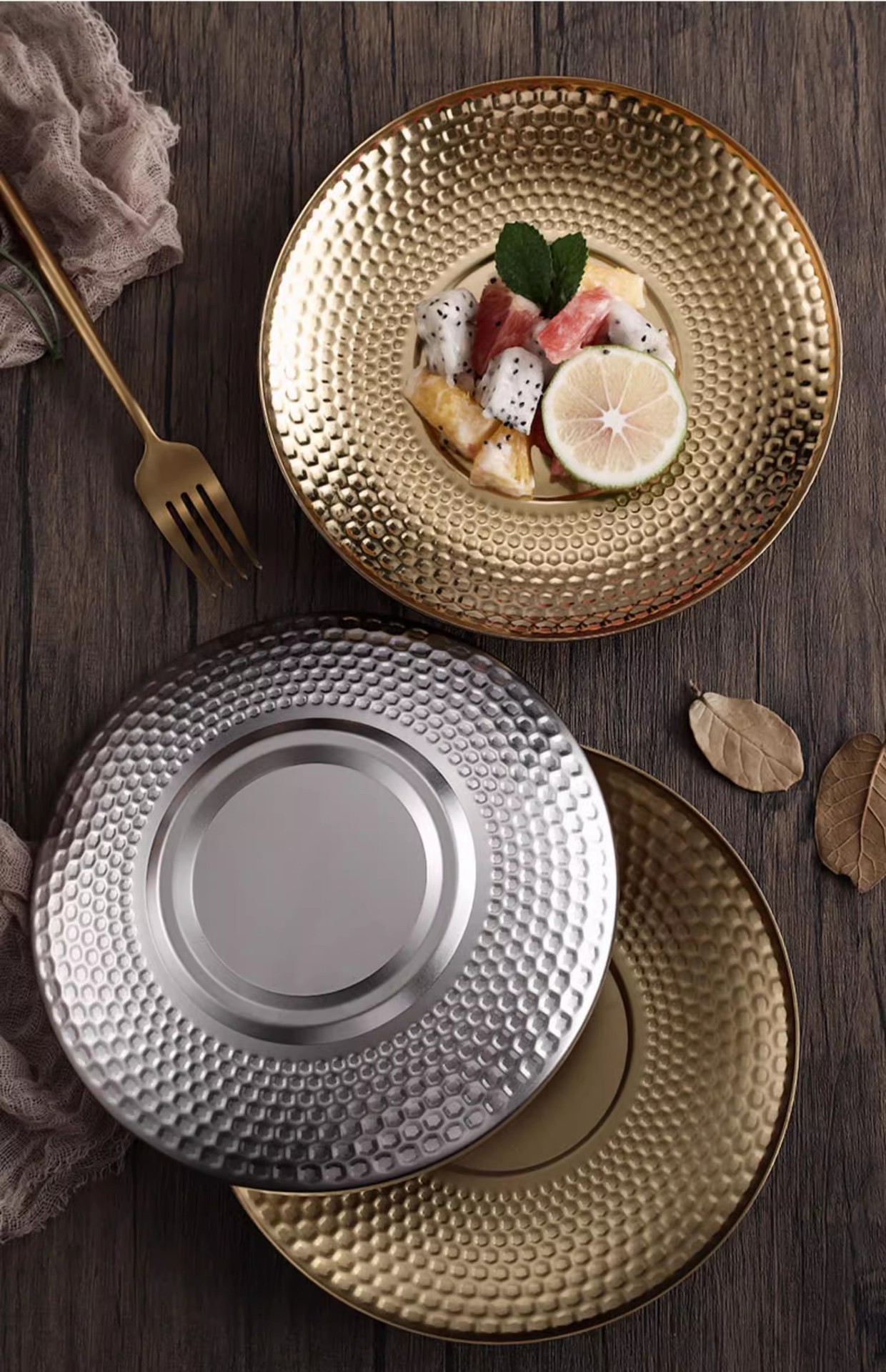 창조적 인 망치질 스테인레스 스틸 플레이트 가정용 과일 플레이트 황금 스낵 디저트 케이크 플레이트 간단한 야외 캠핑 식기