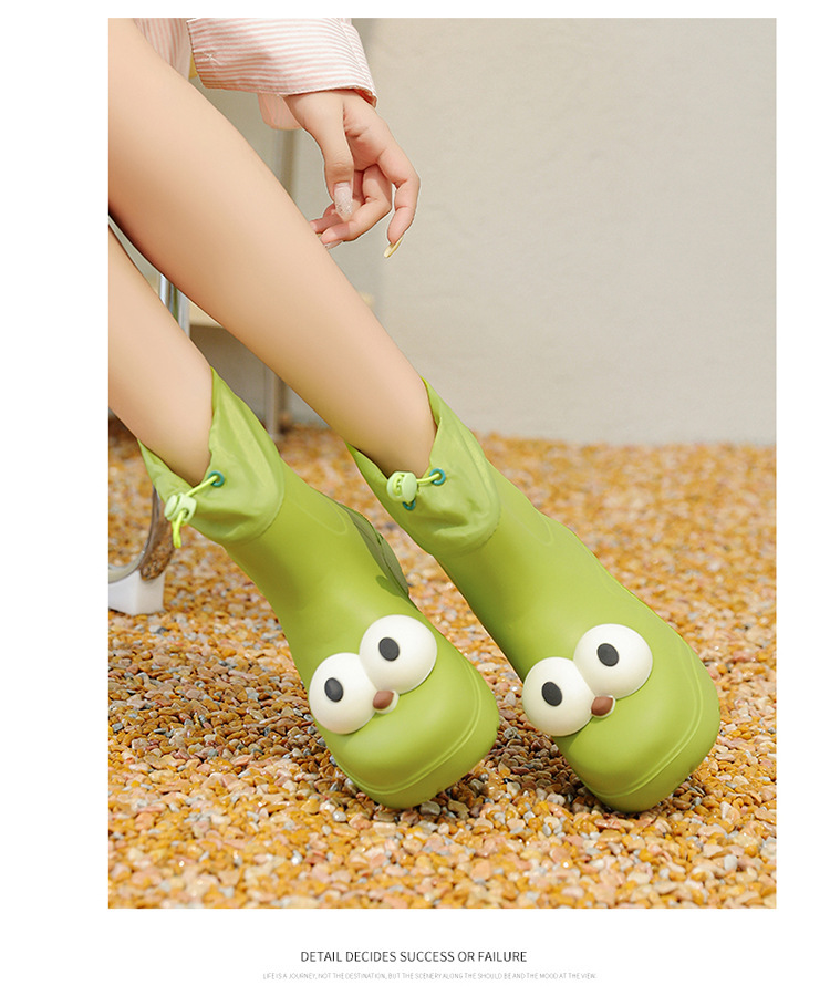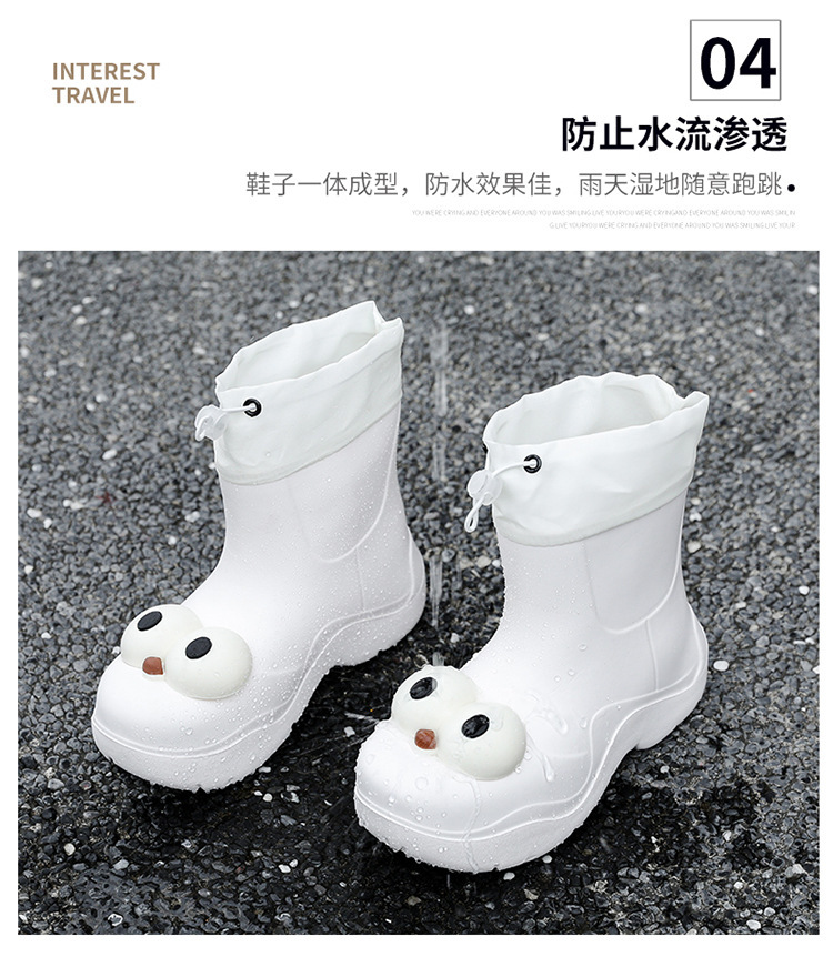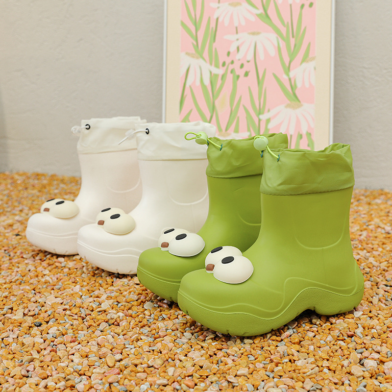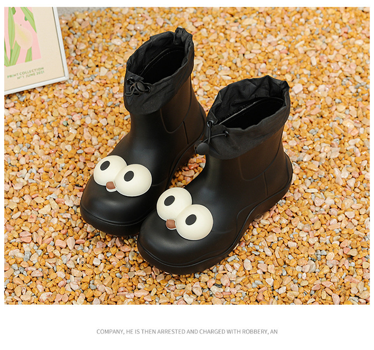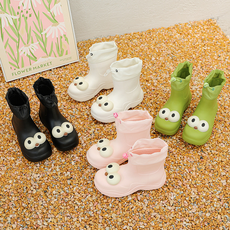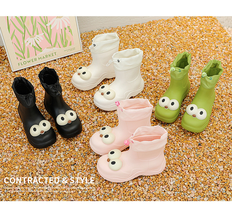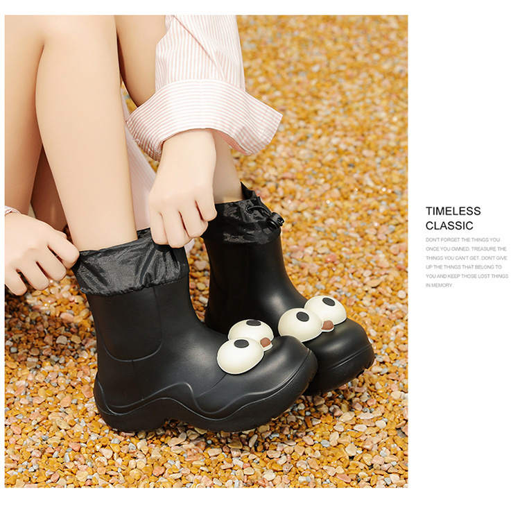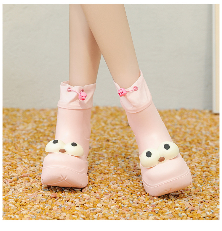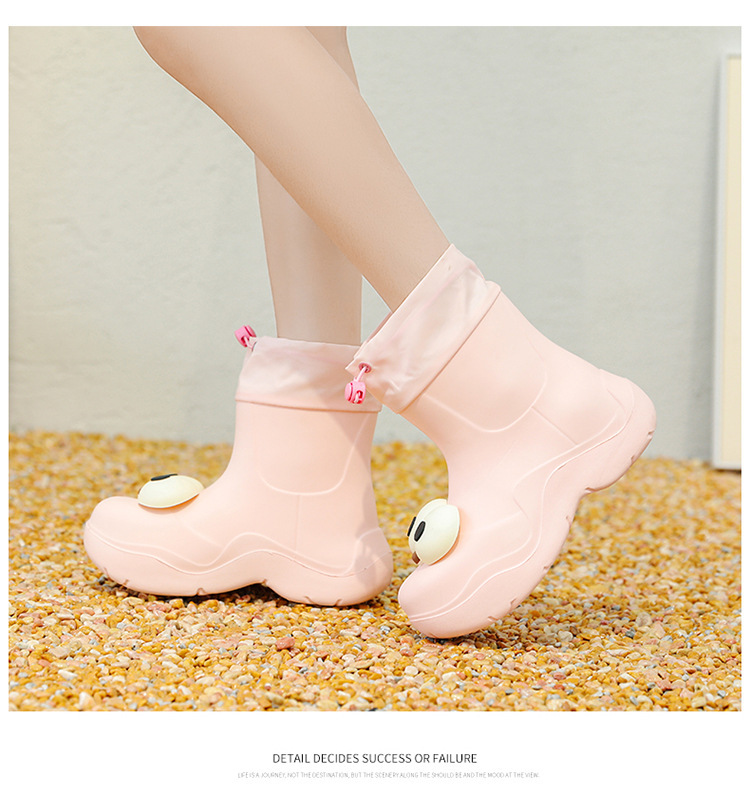 비 부츠 여성 중간 송아지 귀여운 큰 눈 새로운 스타일의 물 신발 여성 방수 미끄럼 방지 야외 장화 강화 오버 슈즈