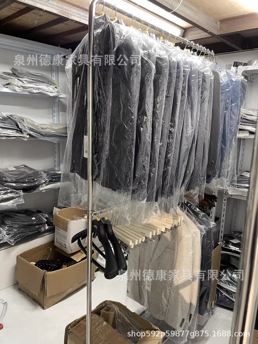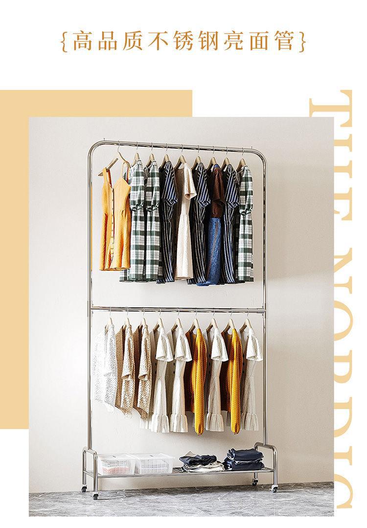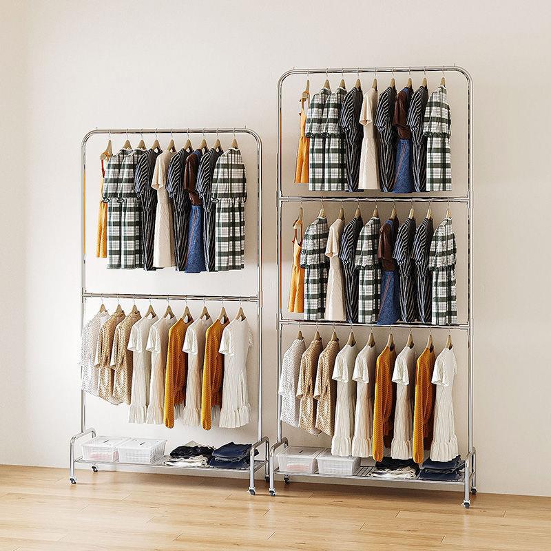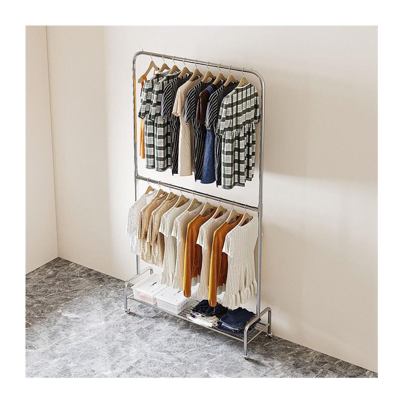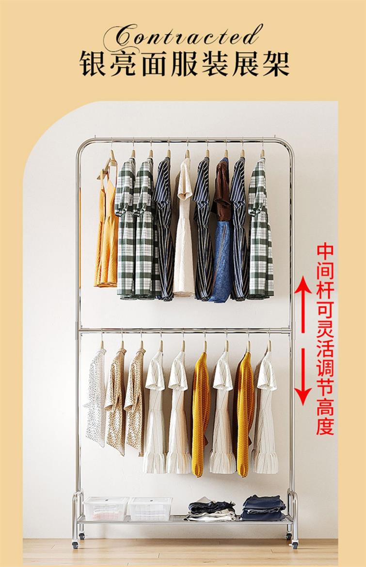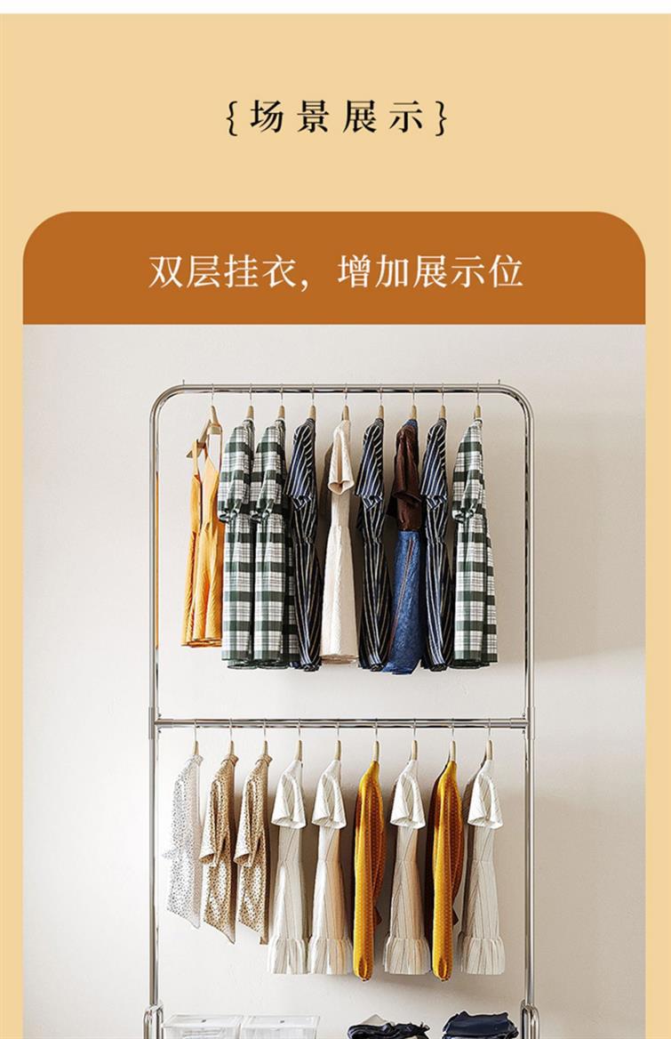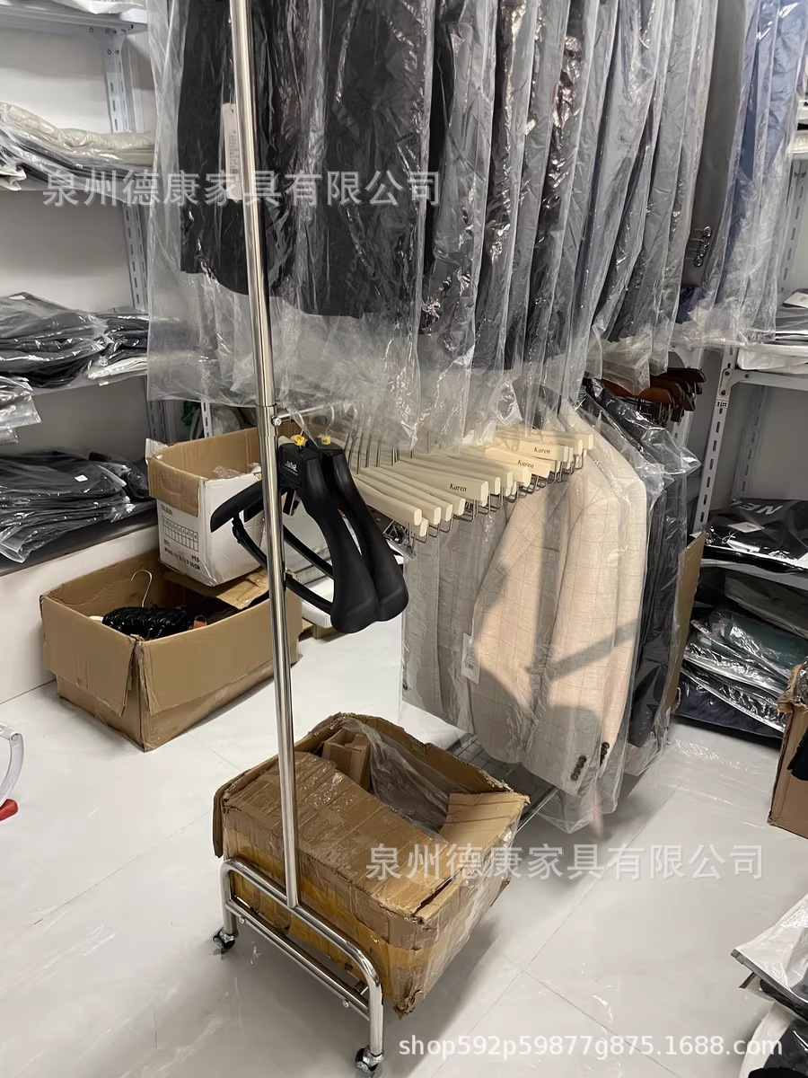 더블 레이어 조정 가능한 행거 바닥 스테인레스 스틸 의류 랙 여성 의류 매장 중다오 선반 바퀴 의류 디스플레이 랙