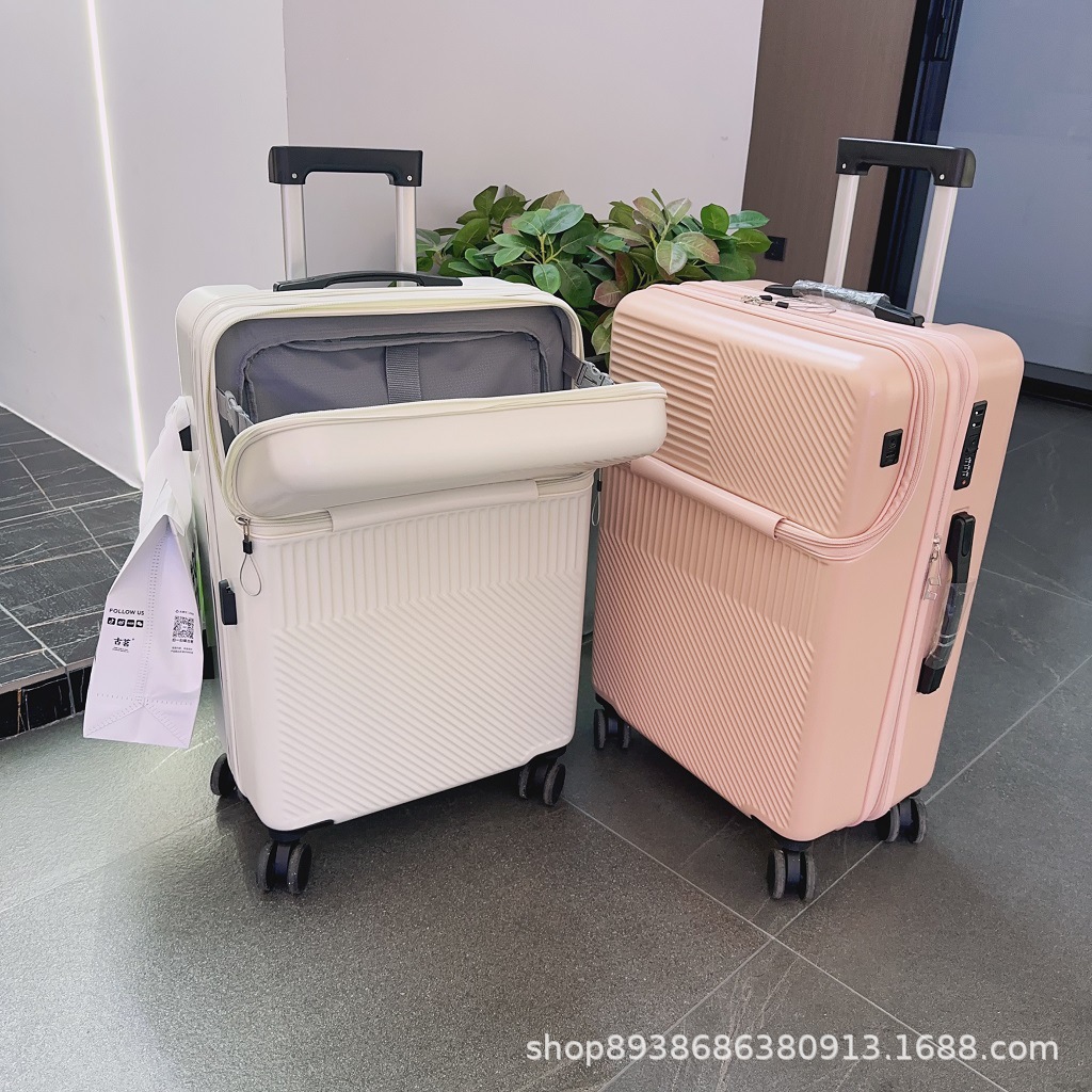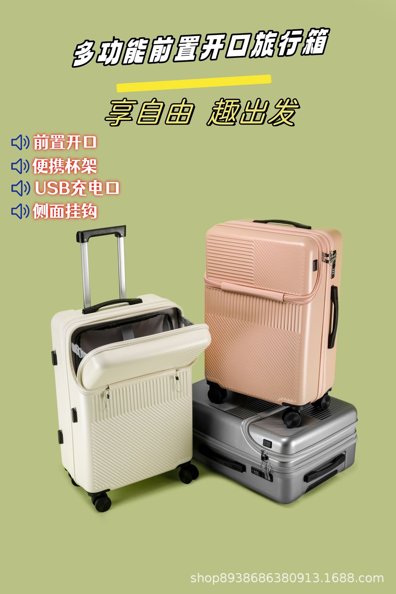2023 새로운 다기능 전면 개방 수하물 여성 유니버설 휠 가방 충전 용 컵 홀더 트롤리 케이스