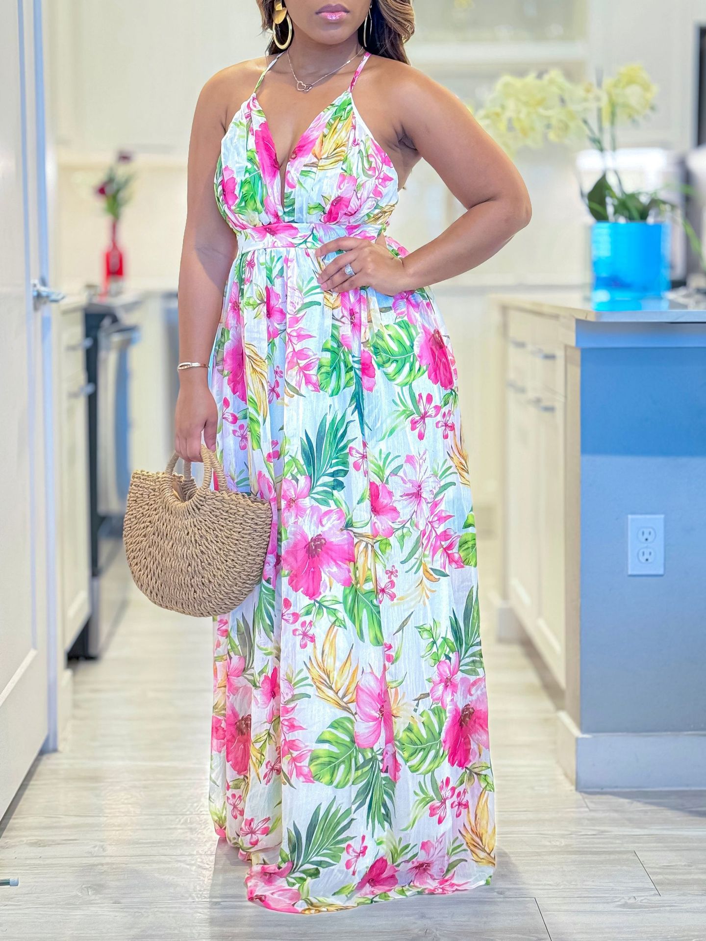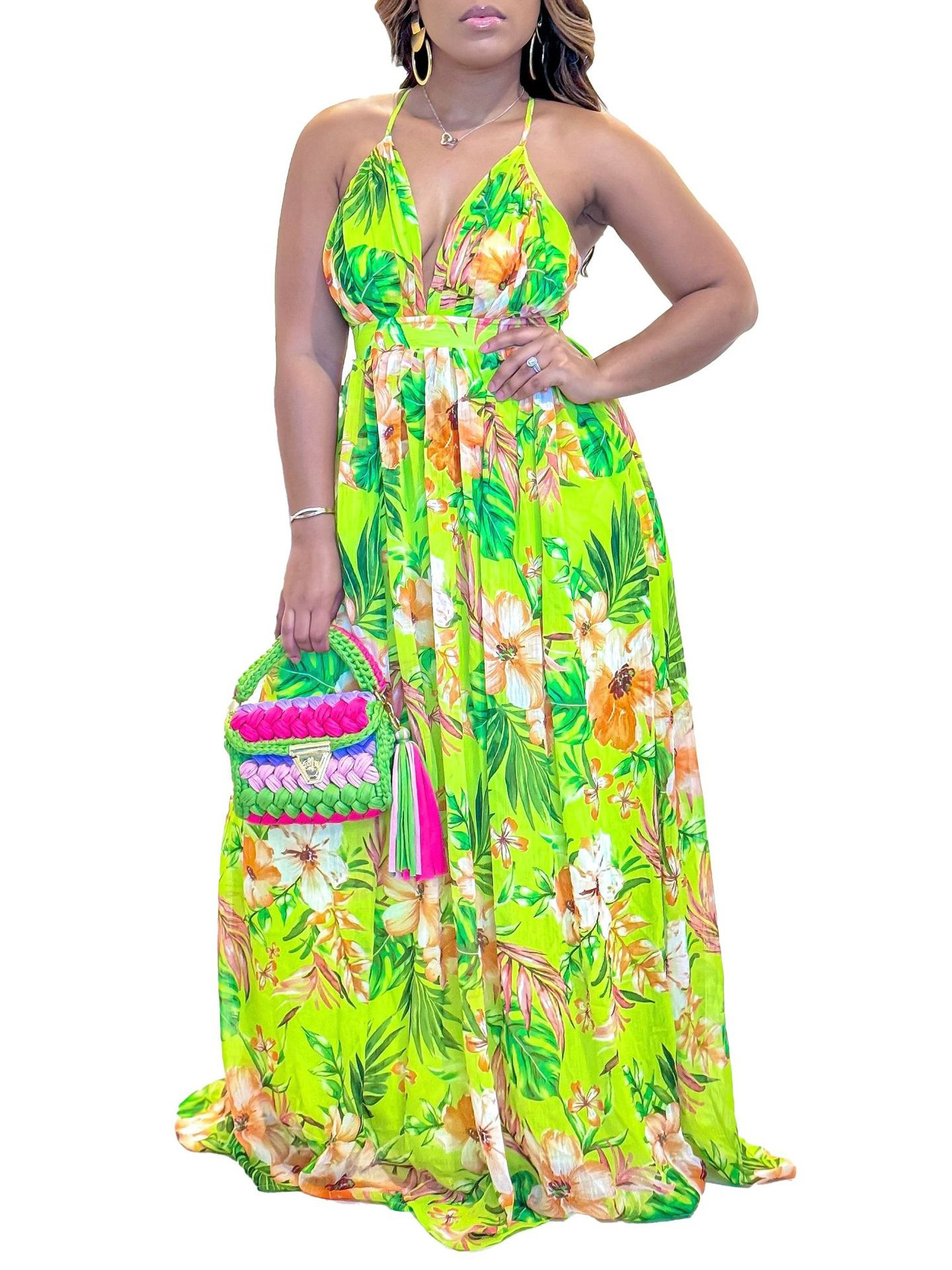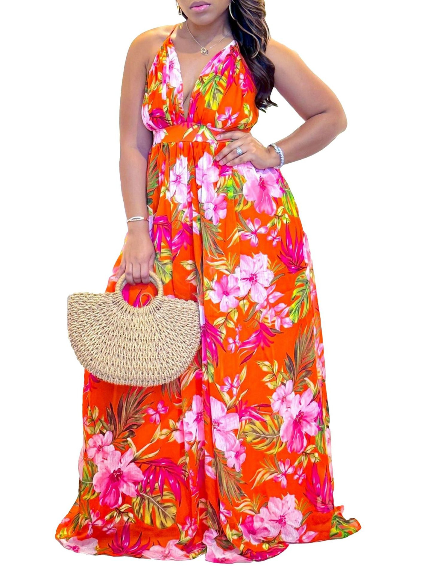 C8575 아마존 여름 새로운 패션 기질 V 넥 스트랩 프린트 해변 원피스 섹시한 대외 무역 원피스