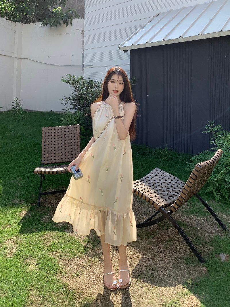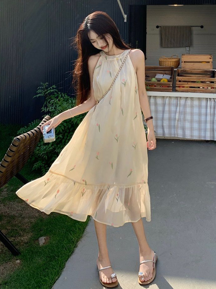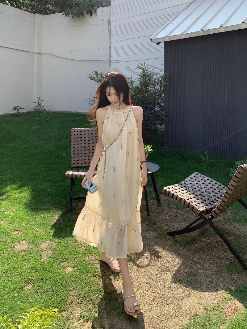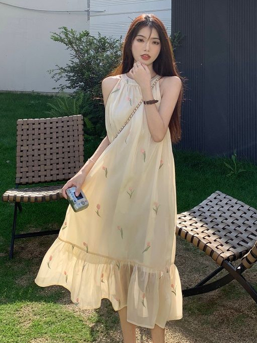 여름 달콤한 부드러운 스타일 느슨한 슬리밍 프랑스 기질 오프 숄더 홀터 꽃 원피스 여성 비치 미디 원피스