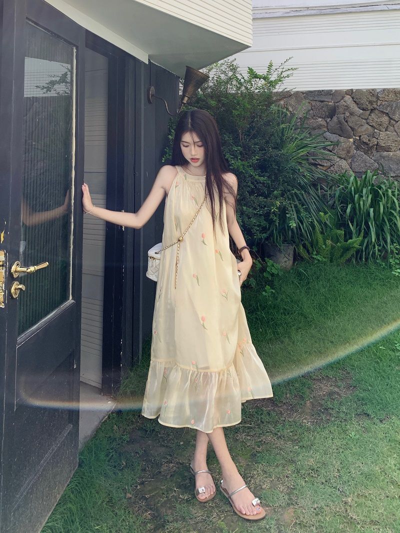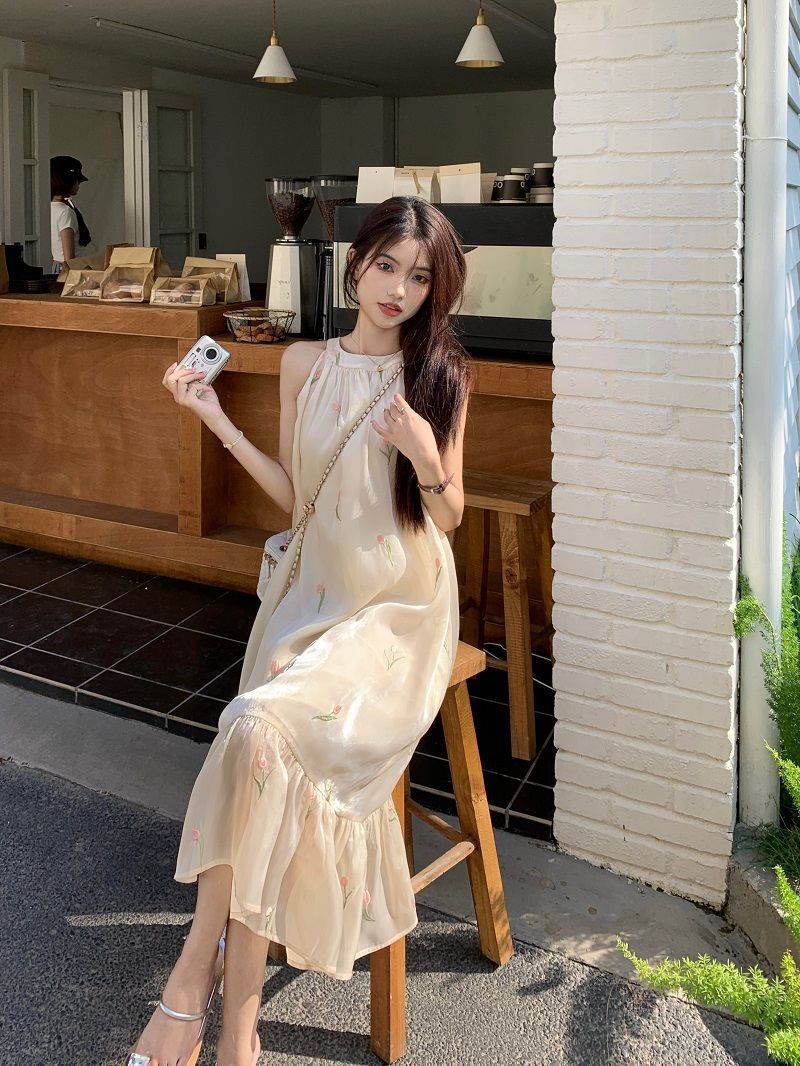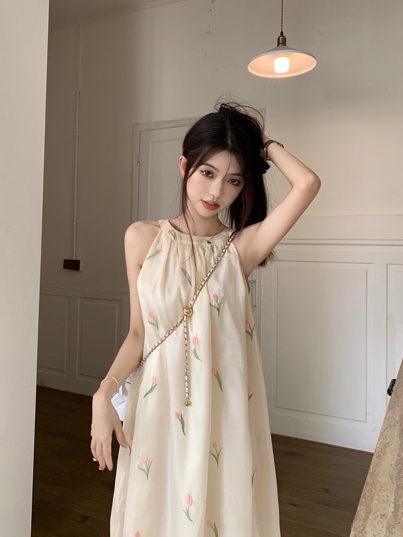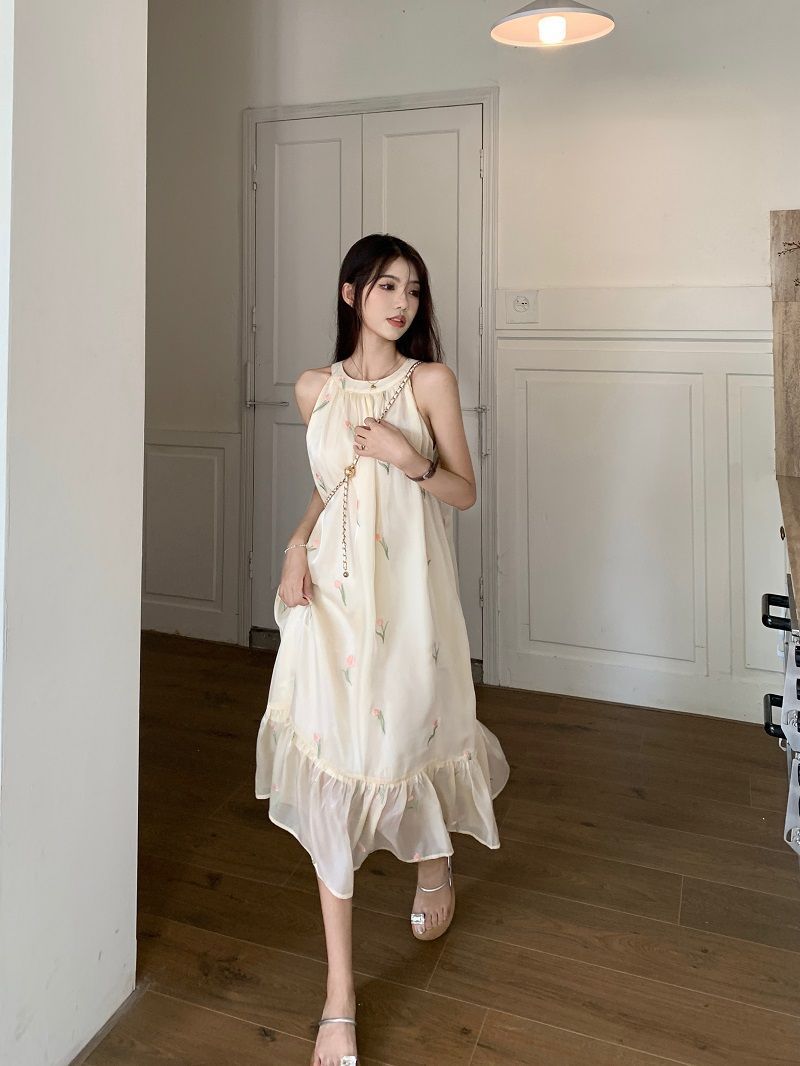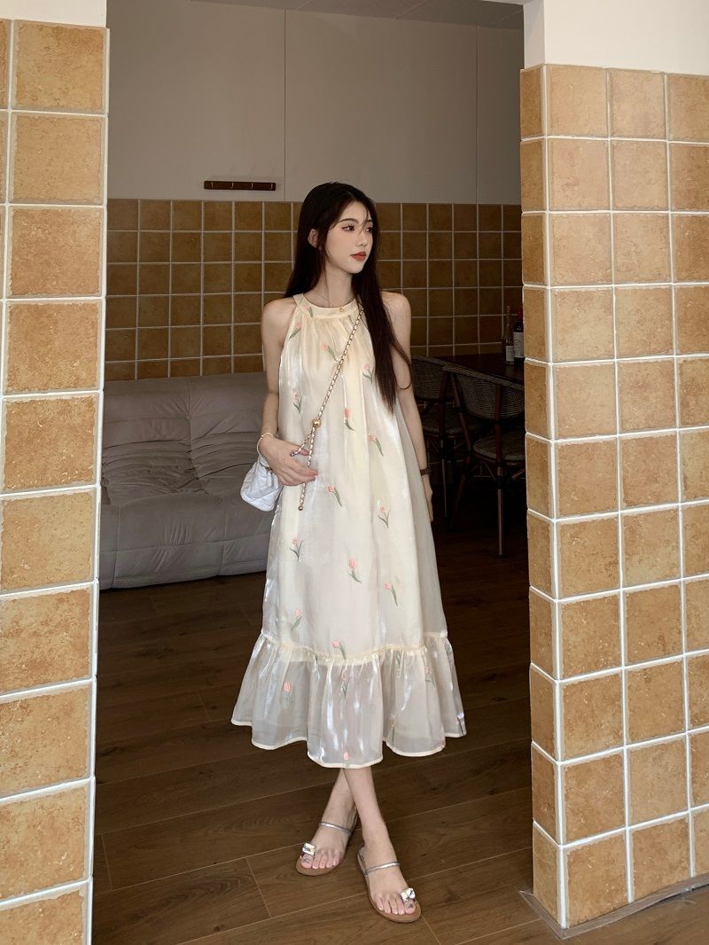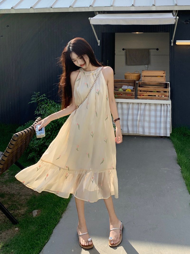 여름 달콤한 부드러운 스타일 느슨한 슬리밍 프랑스 기질 오프 숄더 홀터 꽃 원피스 여성 비치 미디 원피스