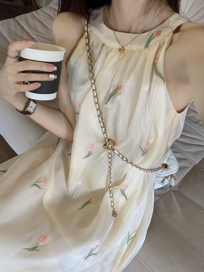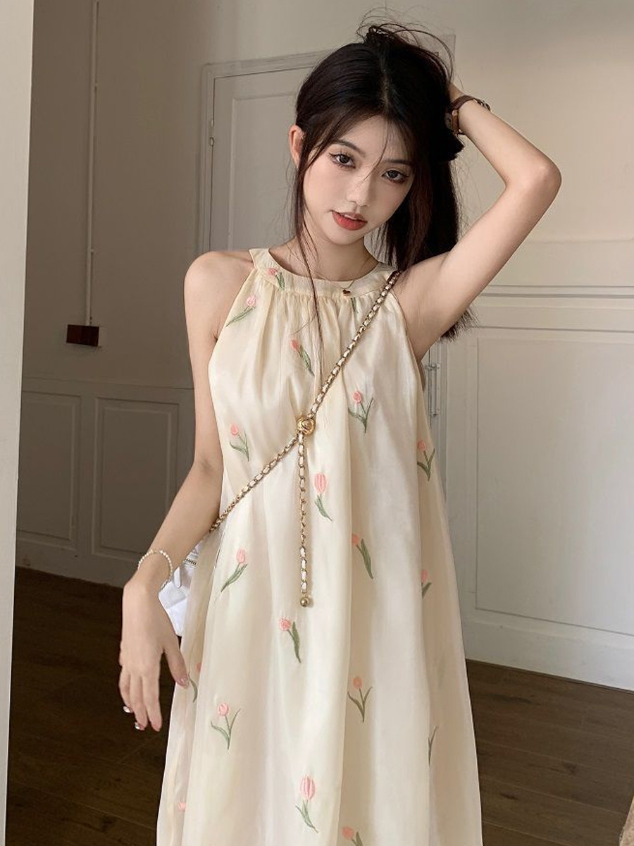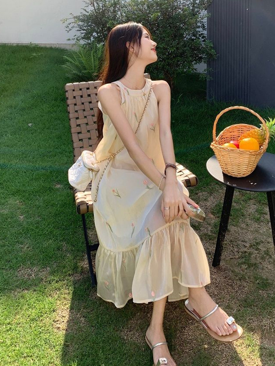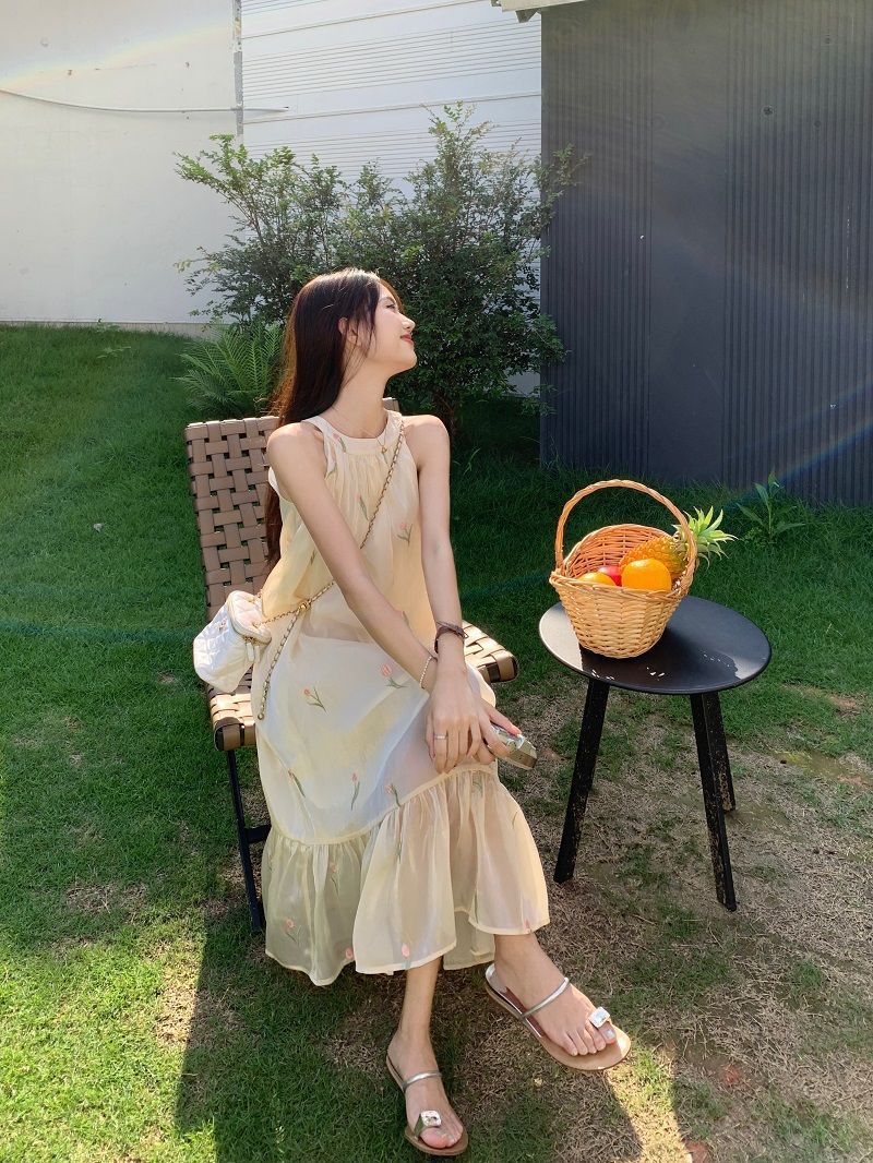 여름 달콤한 부드러운 스타일 느슨한 슬리밍 프랑스 기질 오프 숄더 홀터 꽃 원피스 여성 비치 미디 원피스