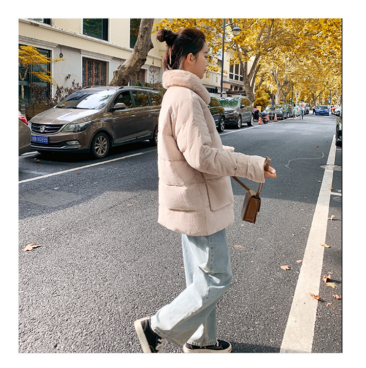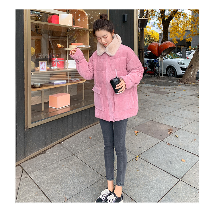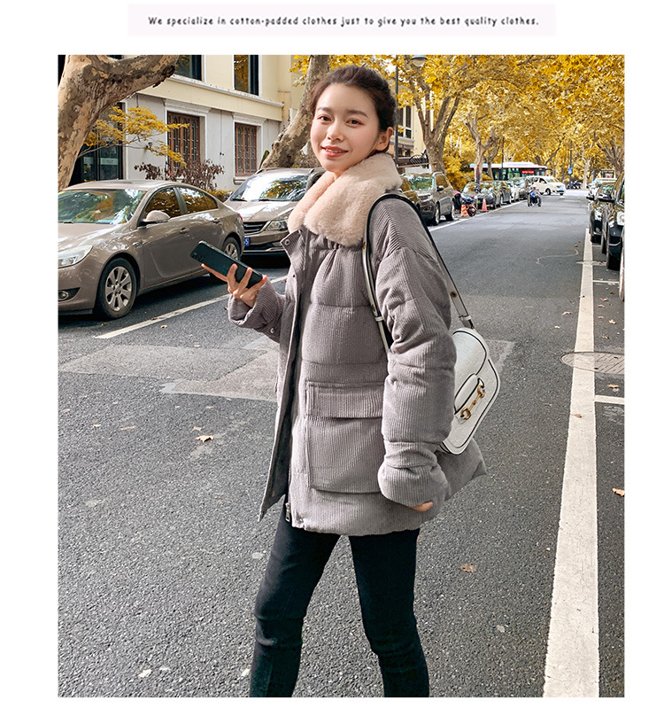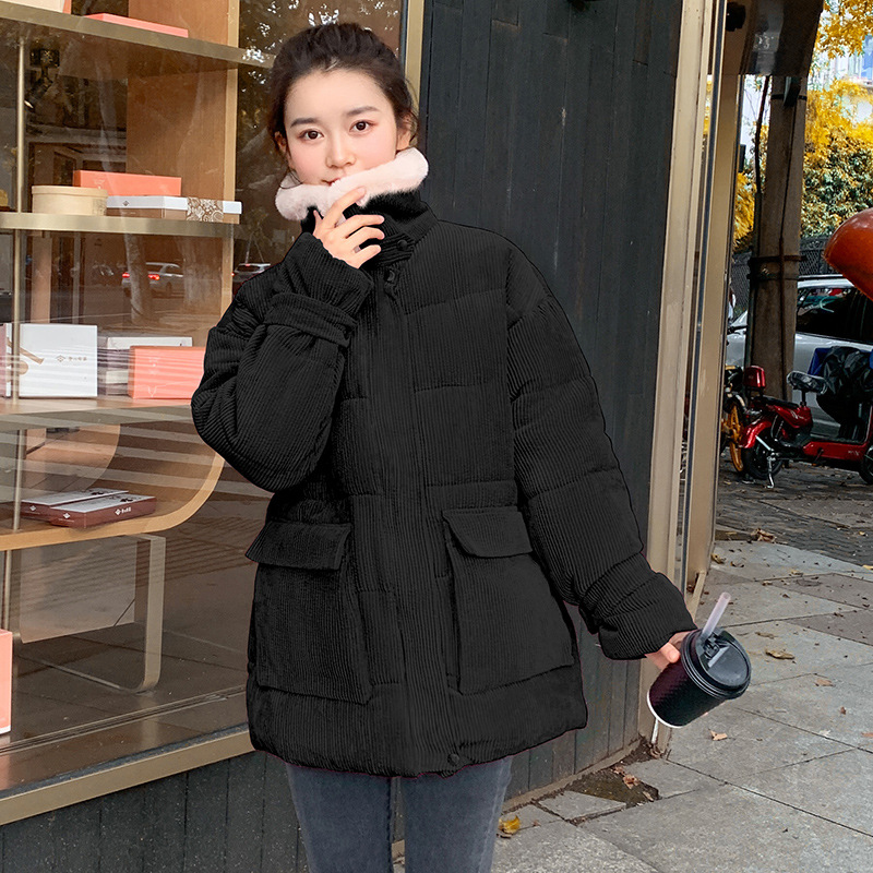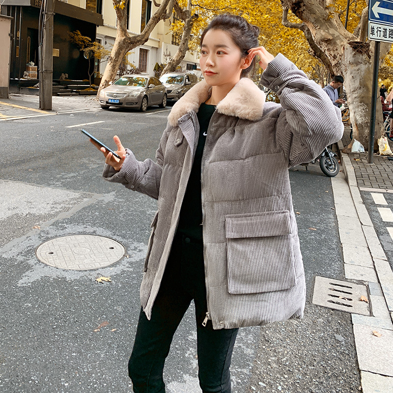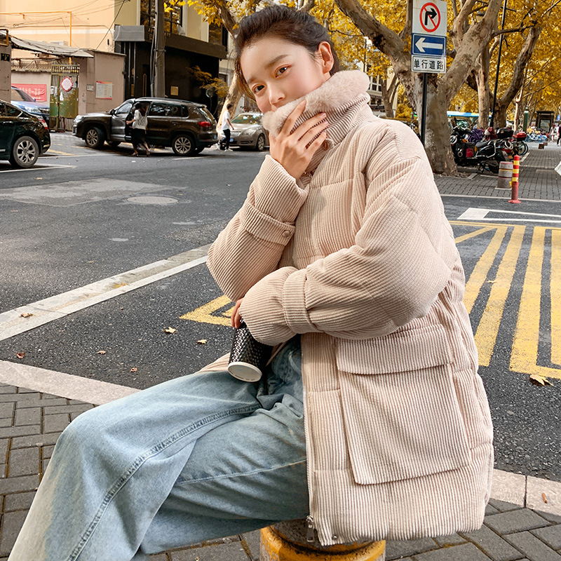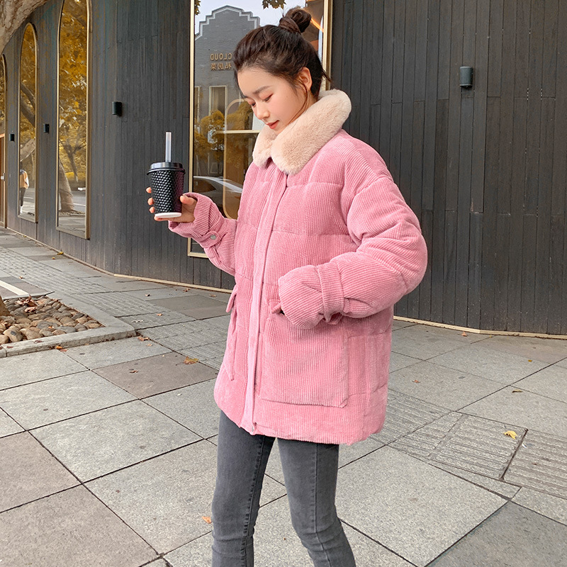 새로운 Ins Corduroy 학생 느슨한 빵 코트 플러스 사이즈 두꺼운 모피 칼라 다운 코튼 패딩 코트 여성용 코튼 패딩 코트 겨울