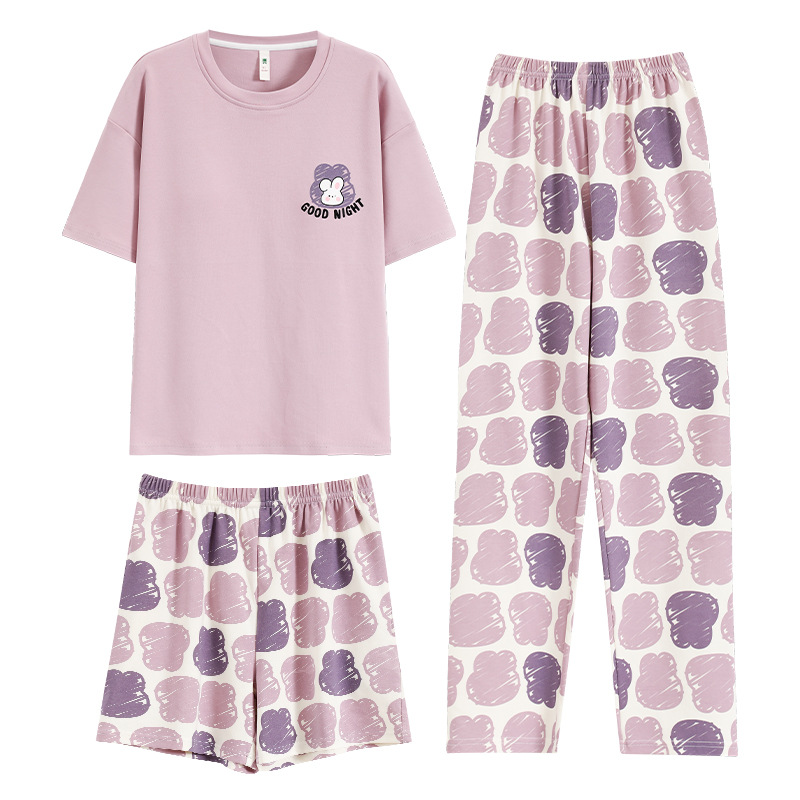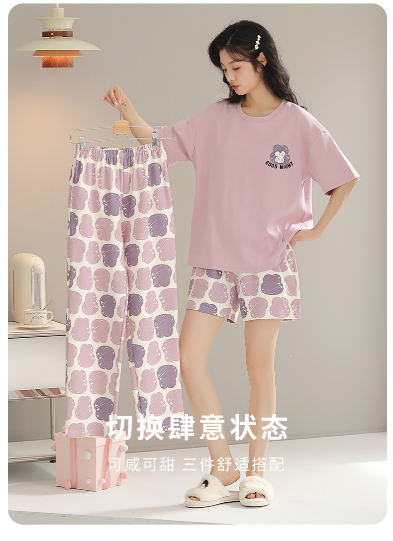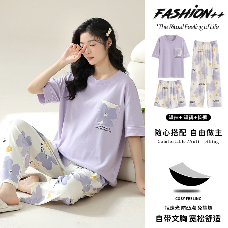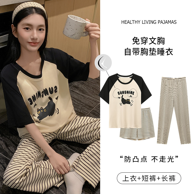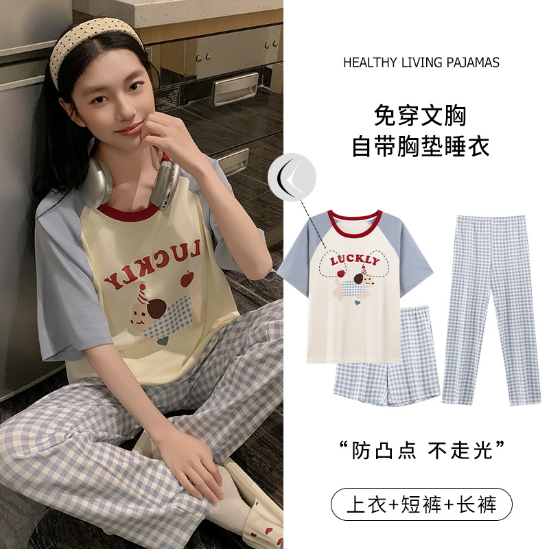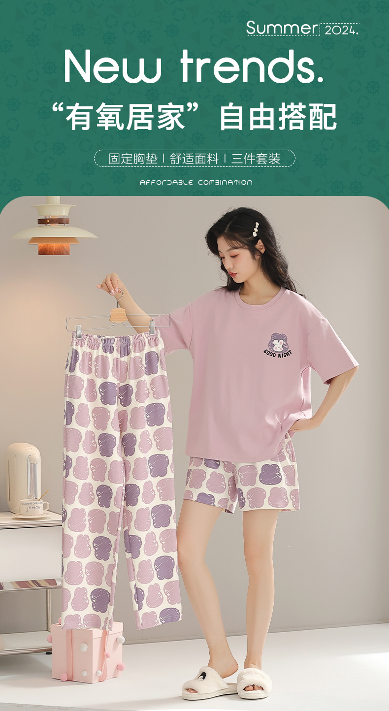 2026년 여름 신상 여성용 잠옷, 가슴 패드가 있는 반팔 3피스 세트, 면 소재, 인터넷 유명인들이 추천하는 인기 홈웨어