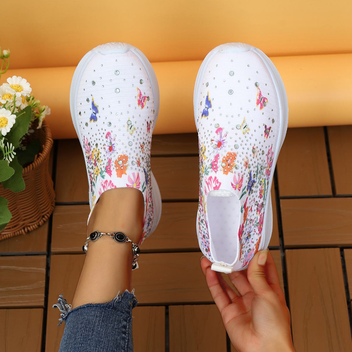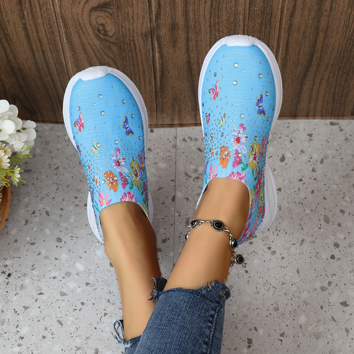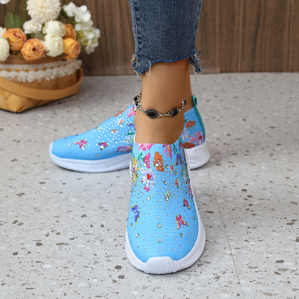 국경 간 대형 여성 신발 봄 통기성 스포츠 캐주얼 신발 라인석 무지개 빛나는 비행 짠 신발 두꺼운 단독 달리기 신발