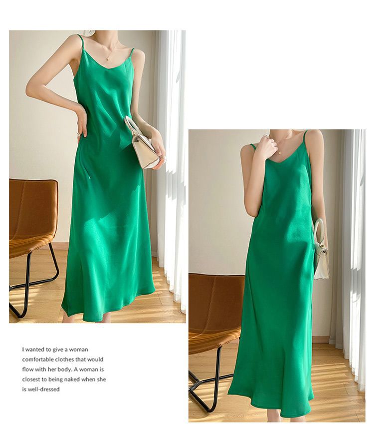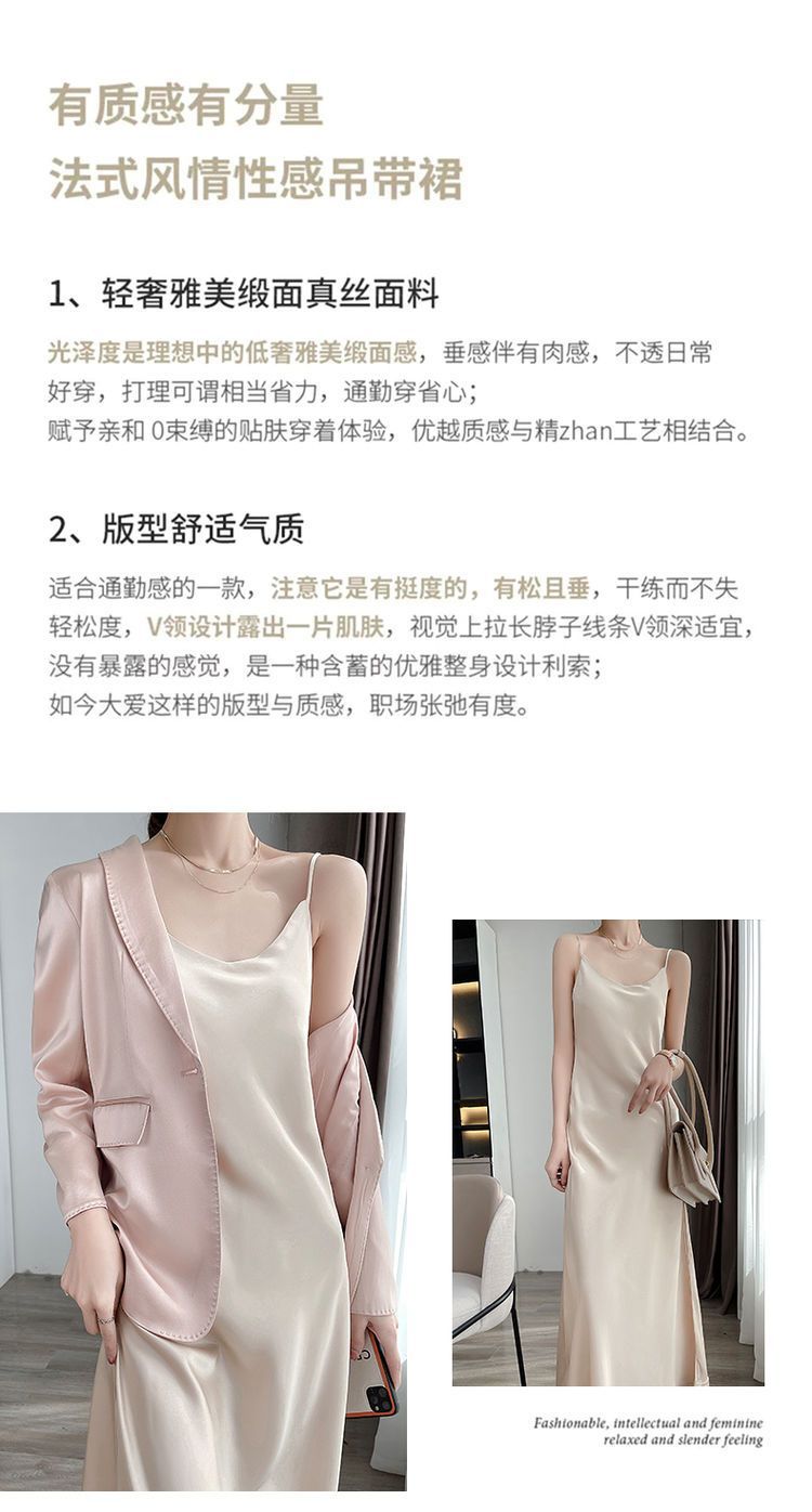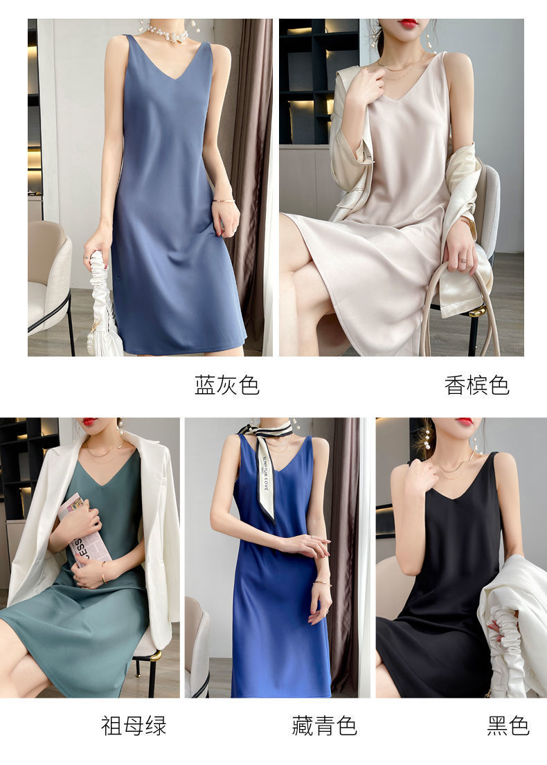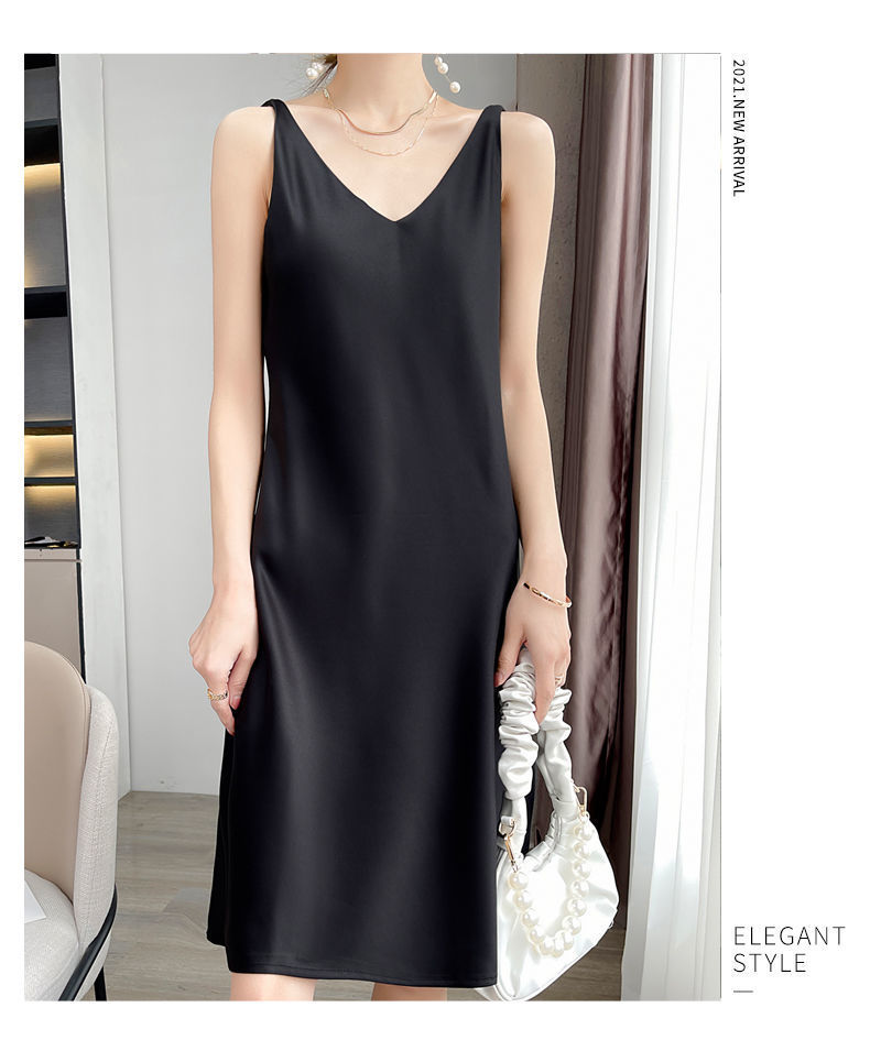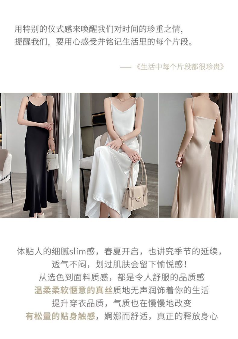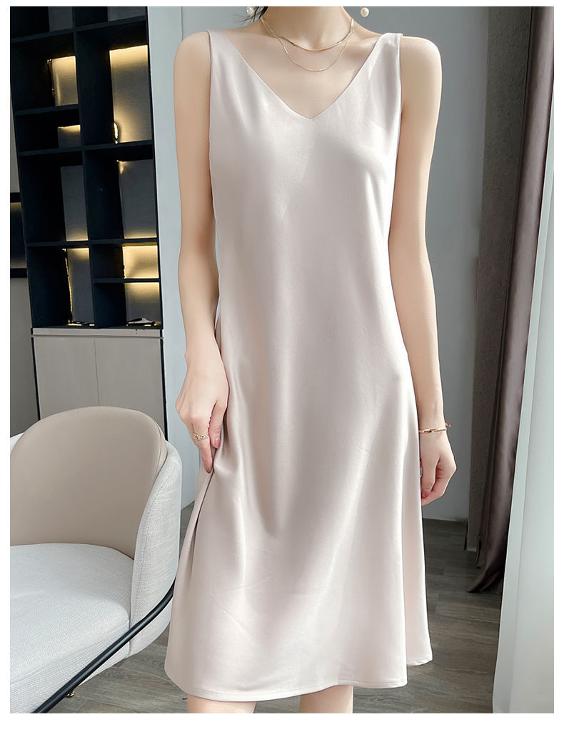 실크 반팔 서스펜더 드레스, 멀버리 실크, 고급 솔리드 컬러, 패셔너블한 스타일, 중간 길이, 루즈한 허리라인