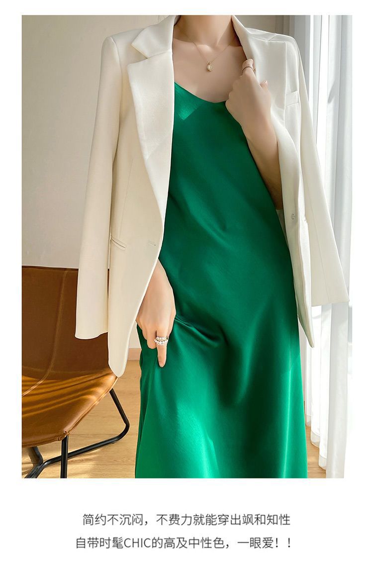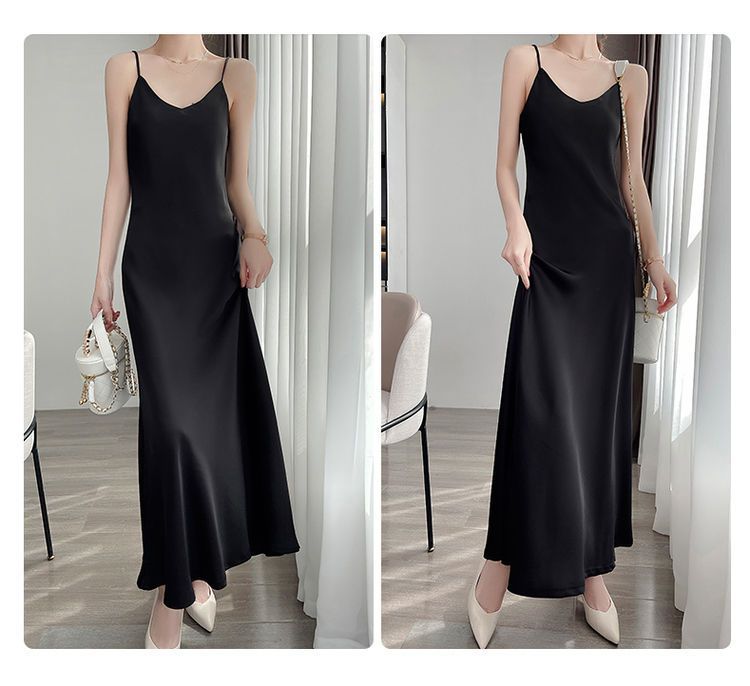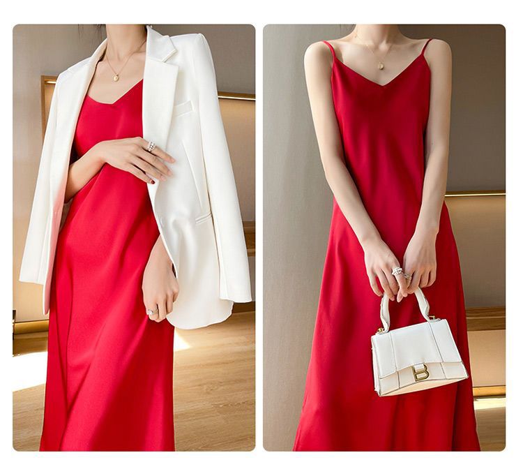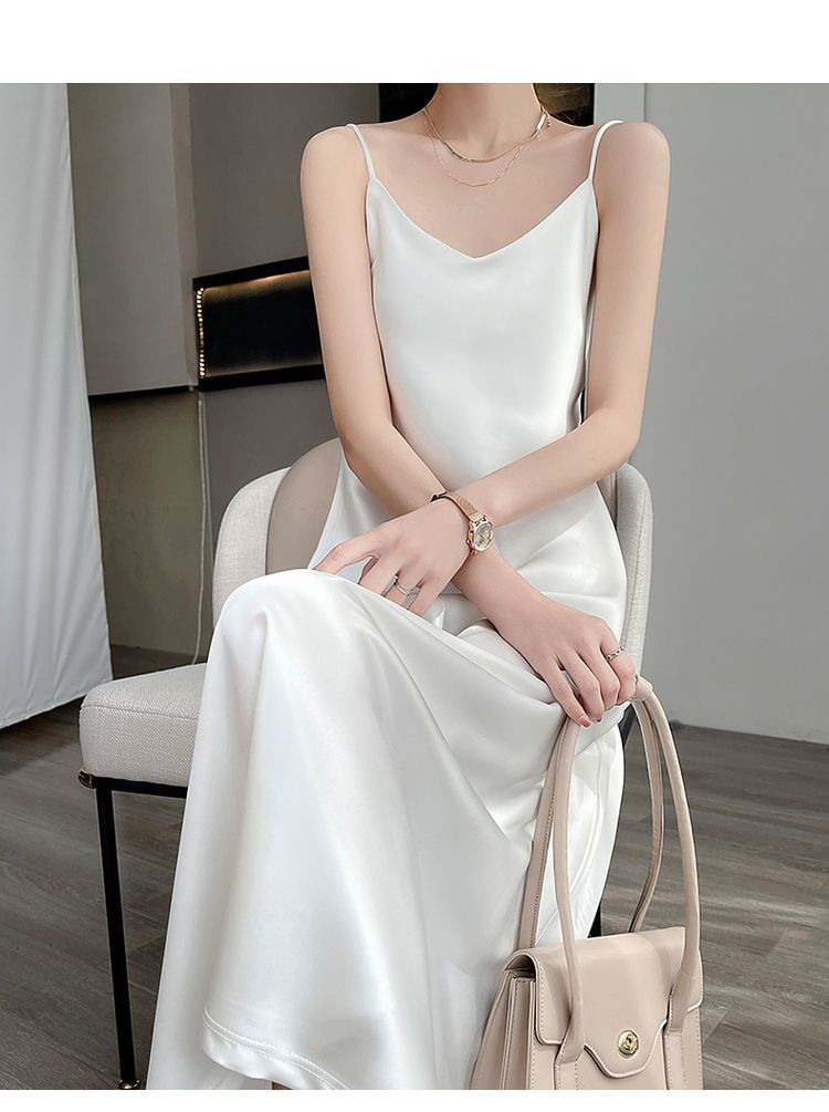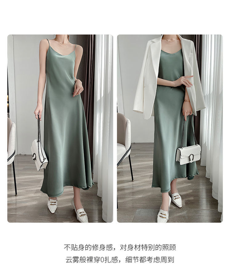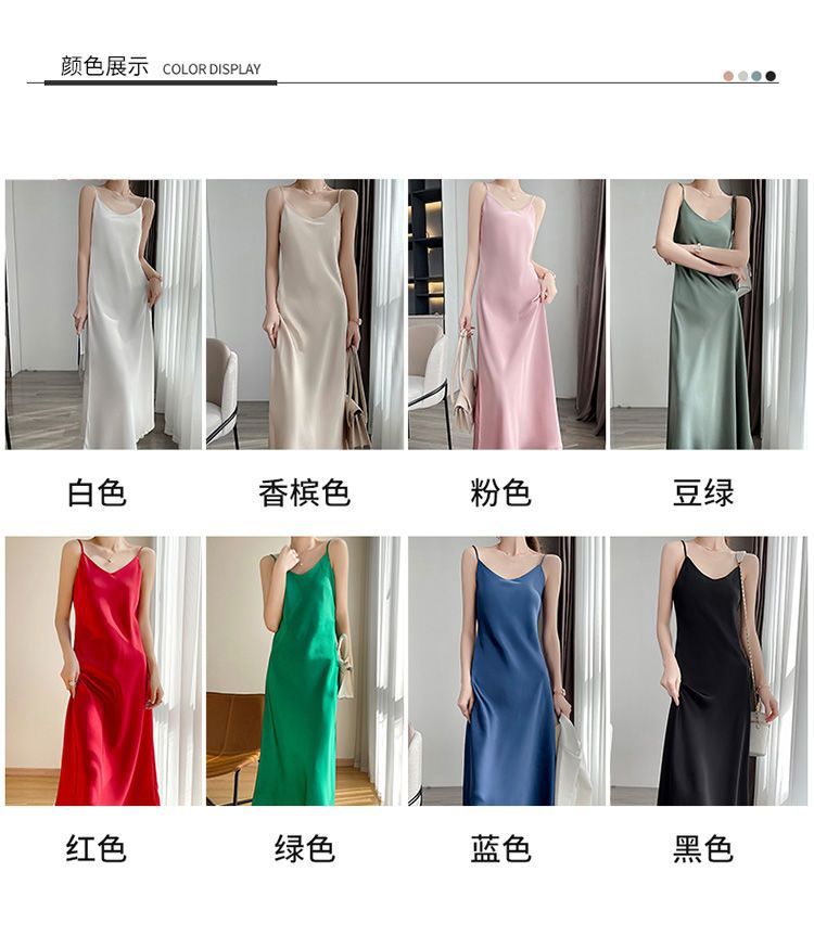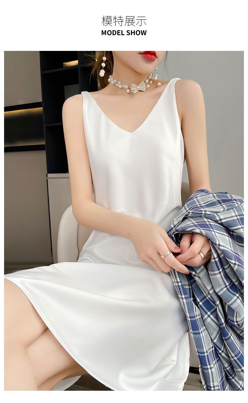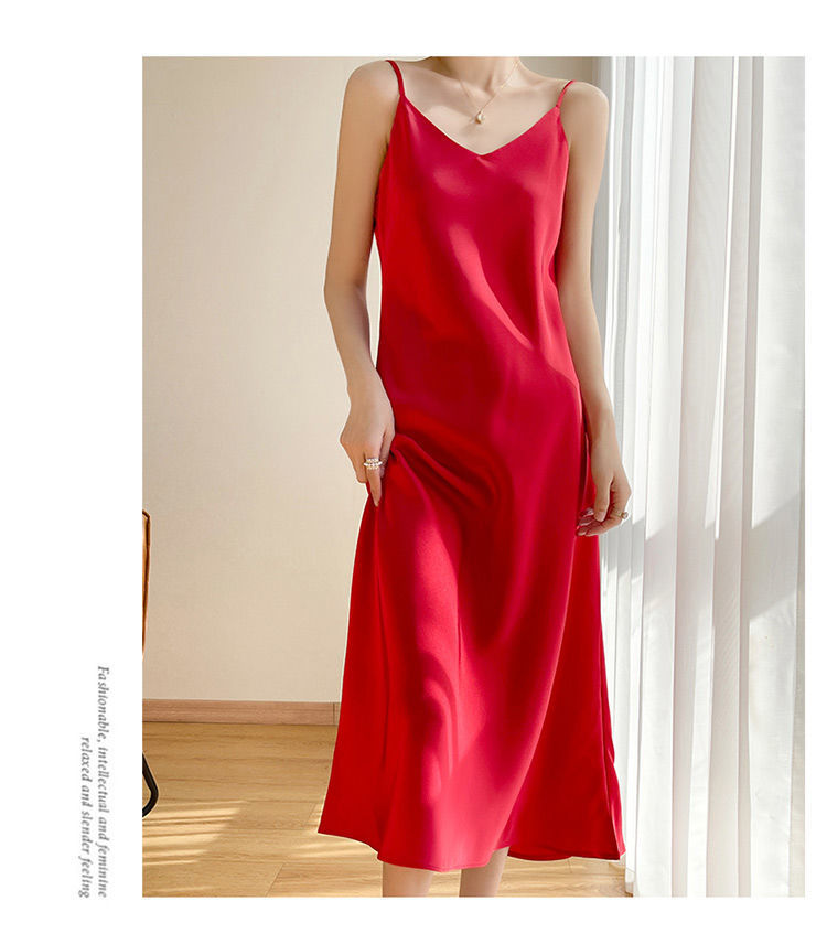 실크 반팔 서스펜더 드레스, 멀버리 실크, 고급 솔리드 컬러, 패셔너블한 스타일, 중간 길이, 루즈한 허리라인