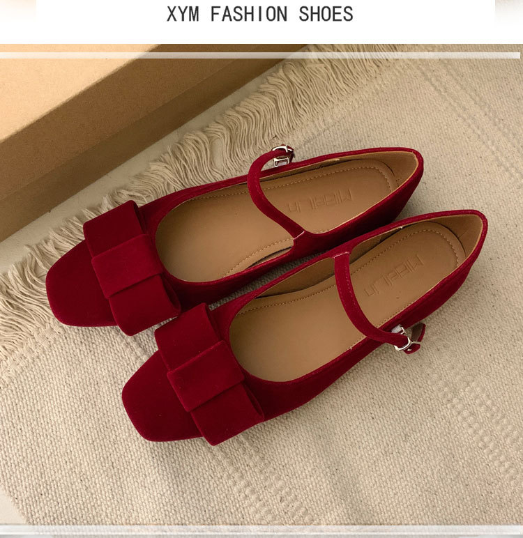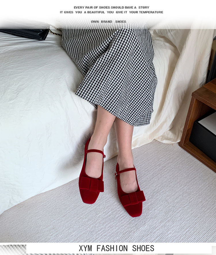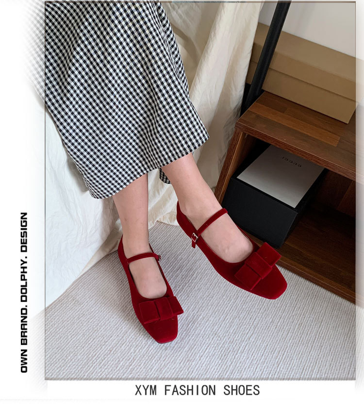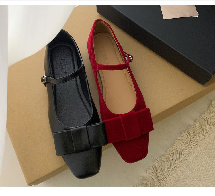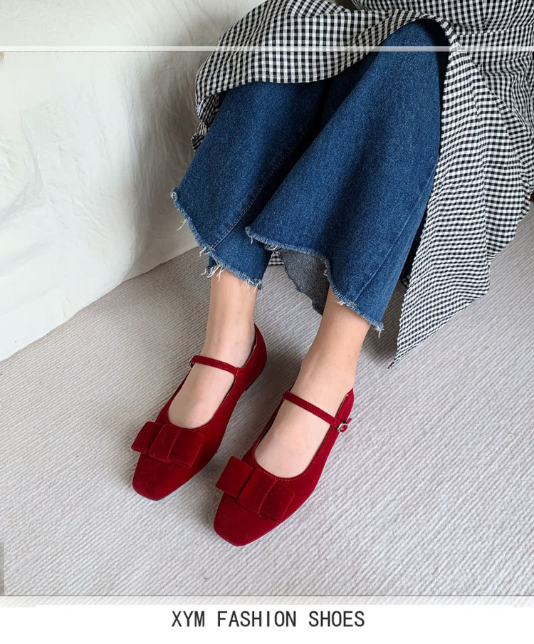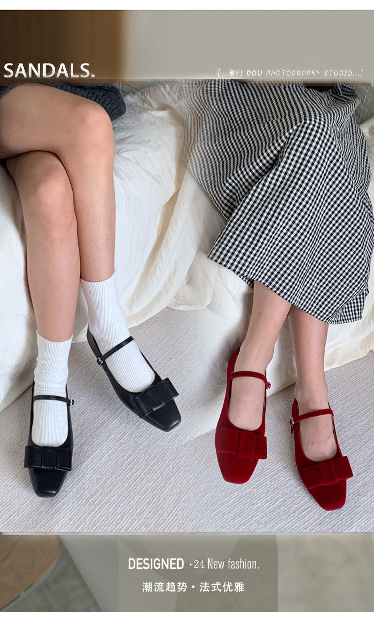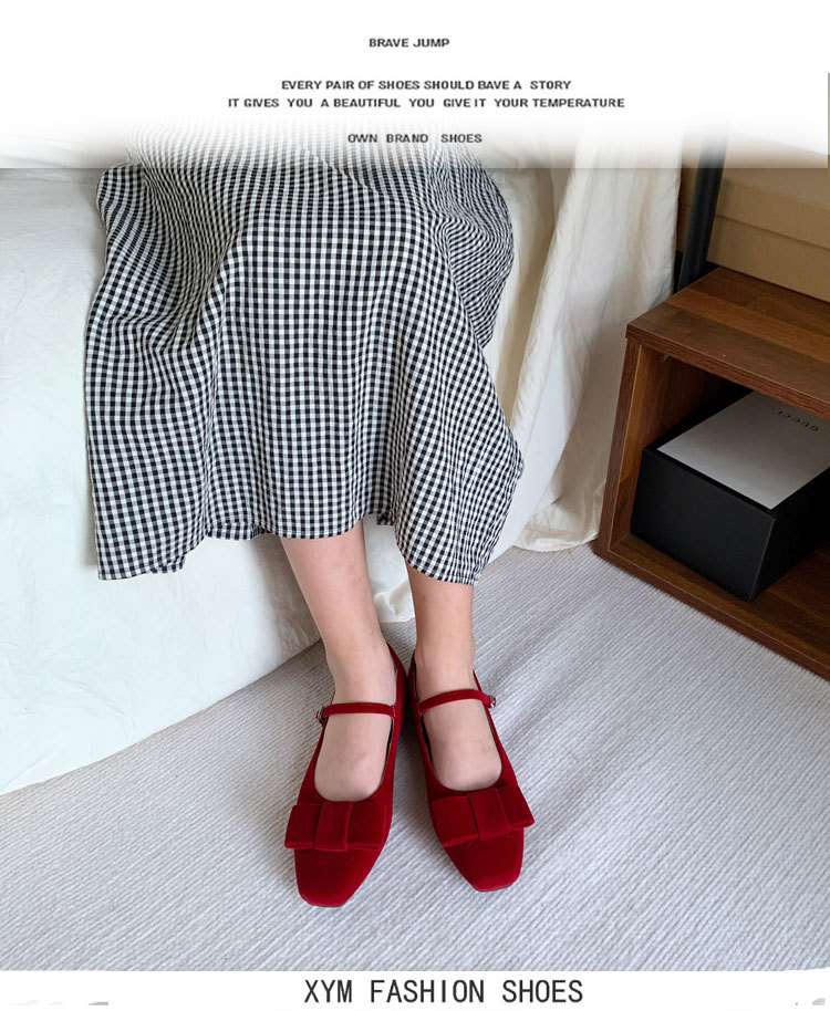 여성을위한 프렌치 벨벳 메리 제인 신발 2025 봄 새로운 스타일 보우 스퀘어 토 기질 플랫 슈즈
