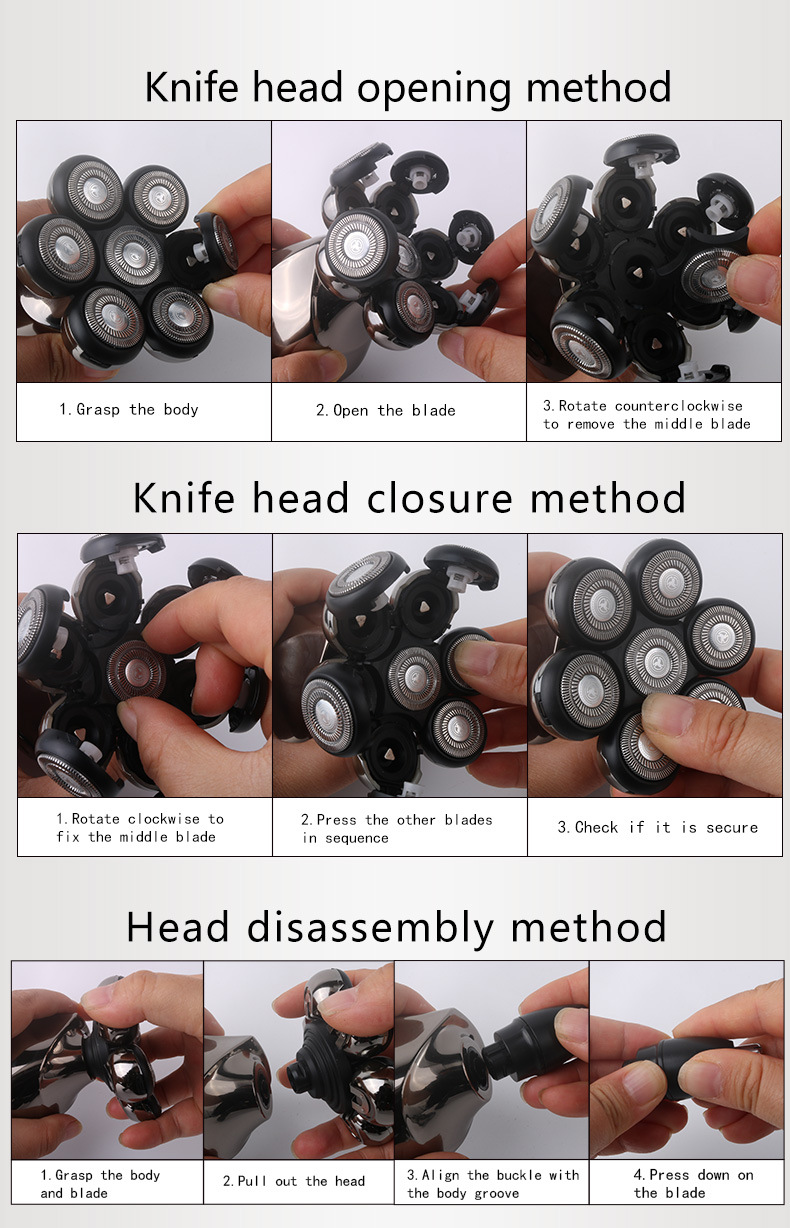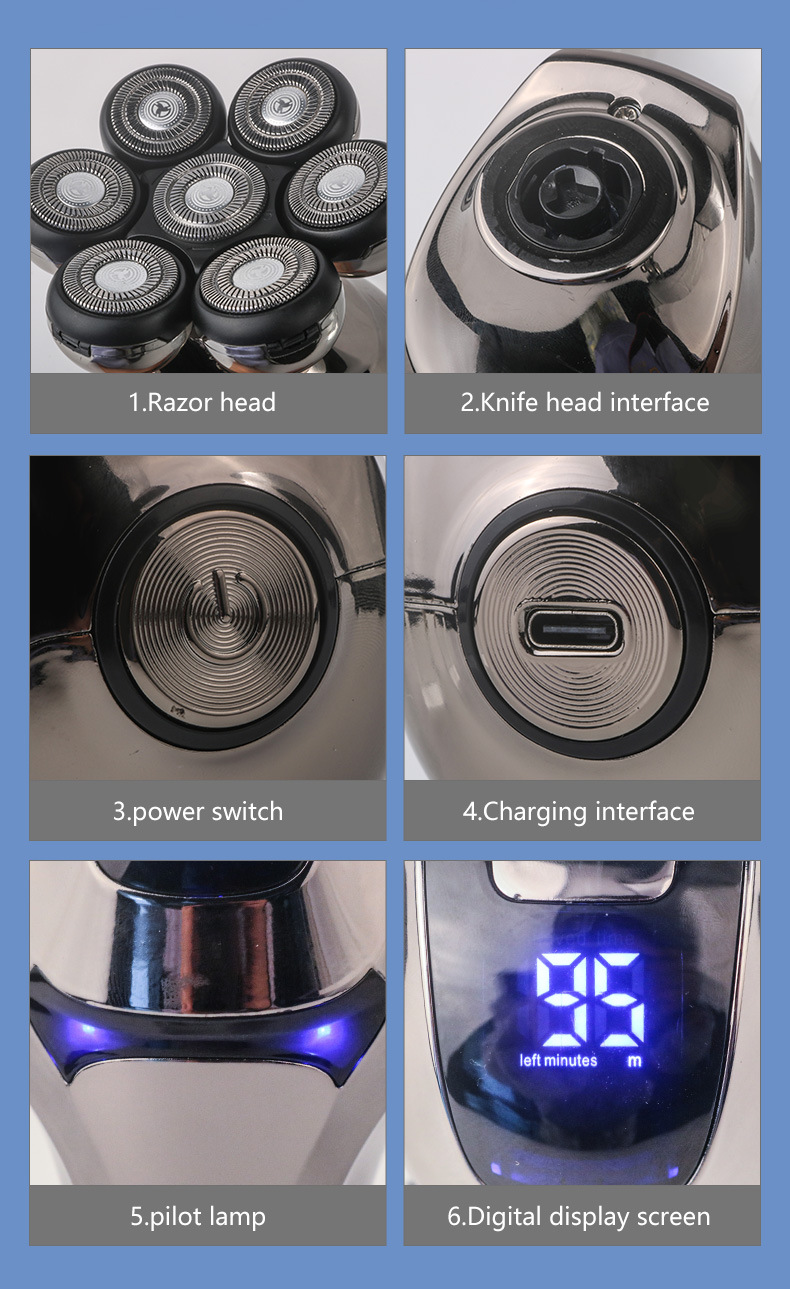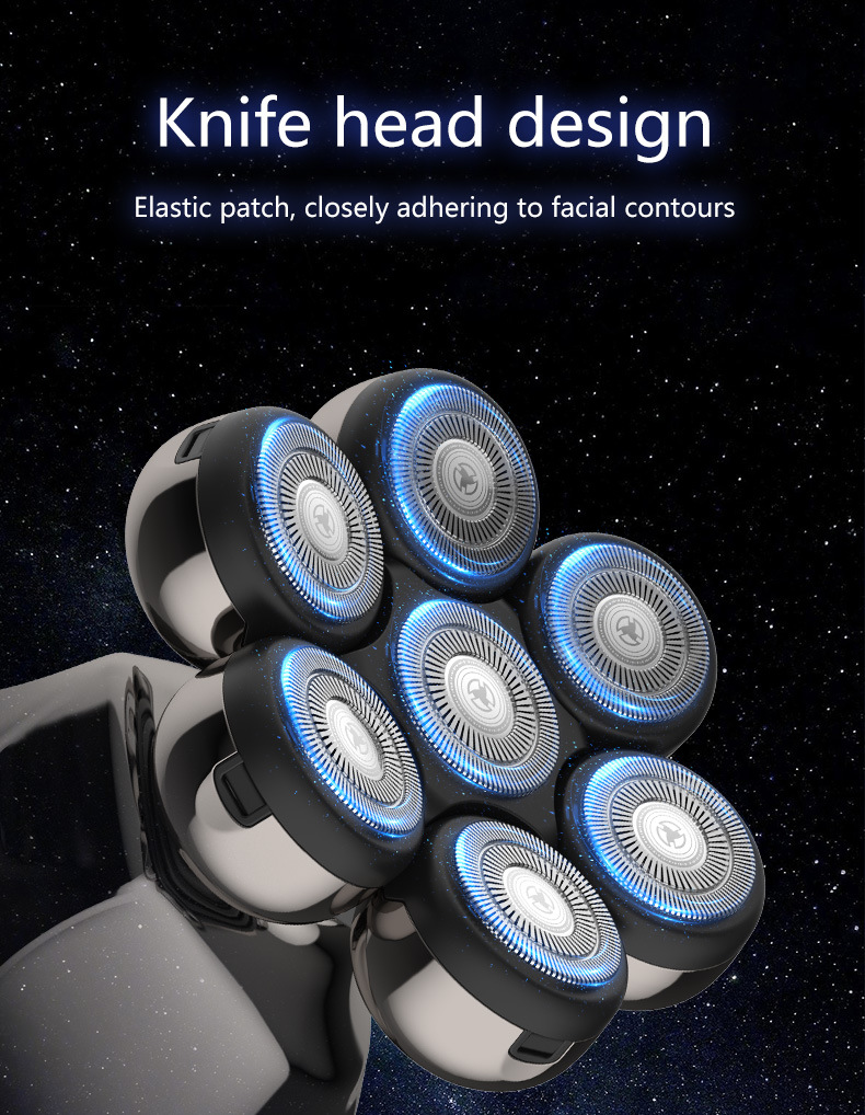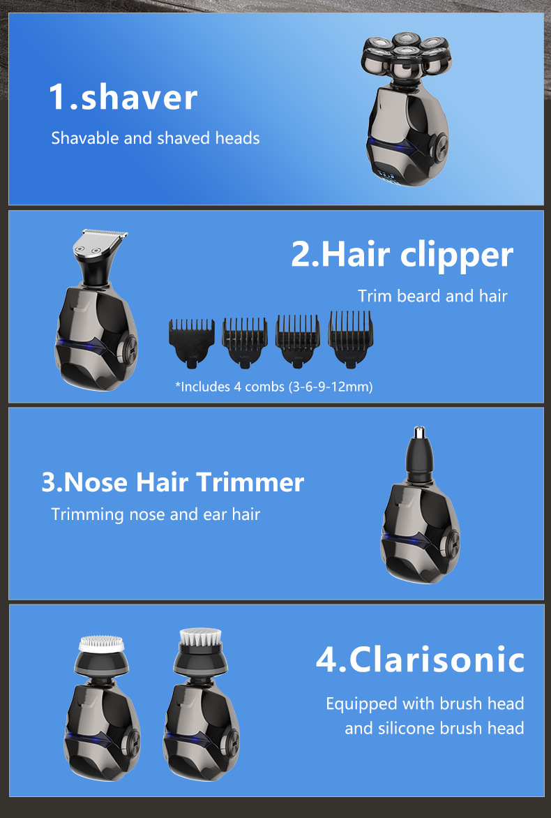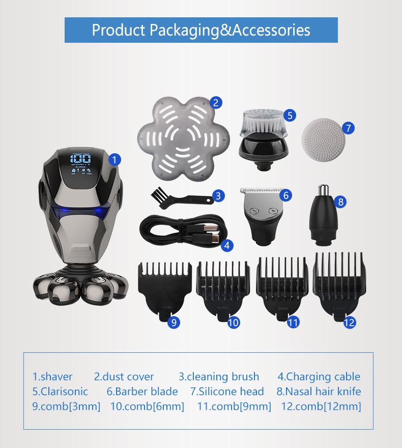 整机包含:1鼻毛刀.2洗脸刷.3按摩头.4滨刀.5定位梳3.6.9.12. 6整机7头加剃须刀头和保护罩