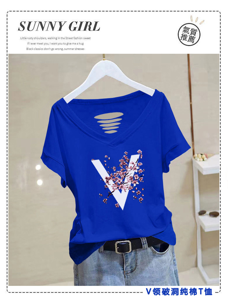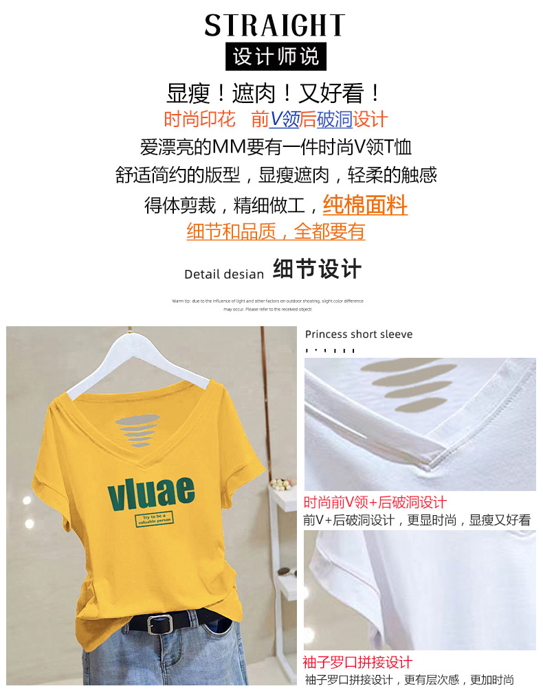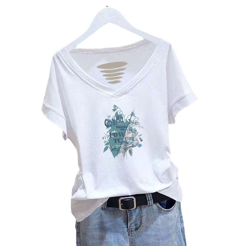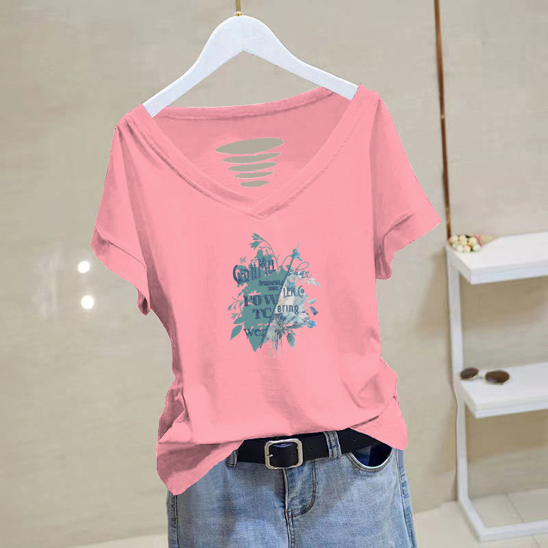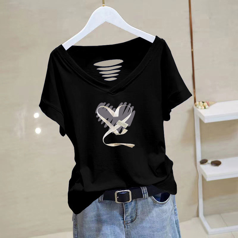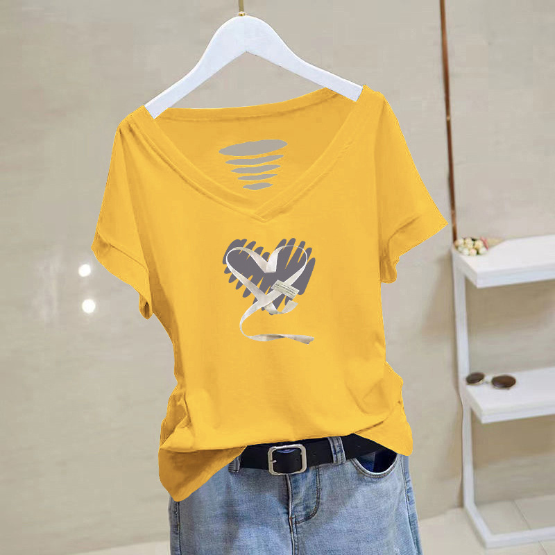 100 면 티셔츠 여성용 반팔 느슨한 V-넥 2024 새로운 여성 의류 치킨 하트 칼라 여름 탑 캐주얼 티셔츠