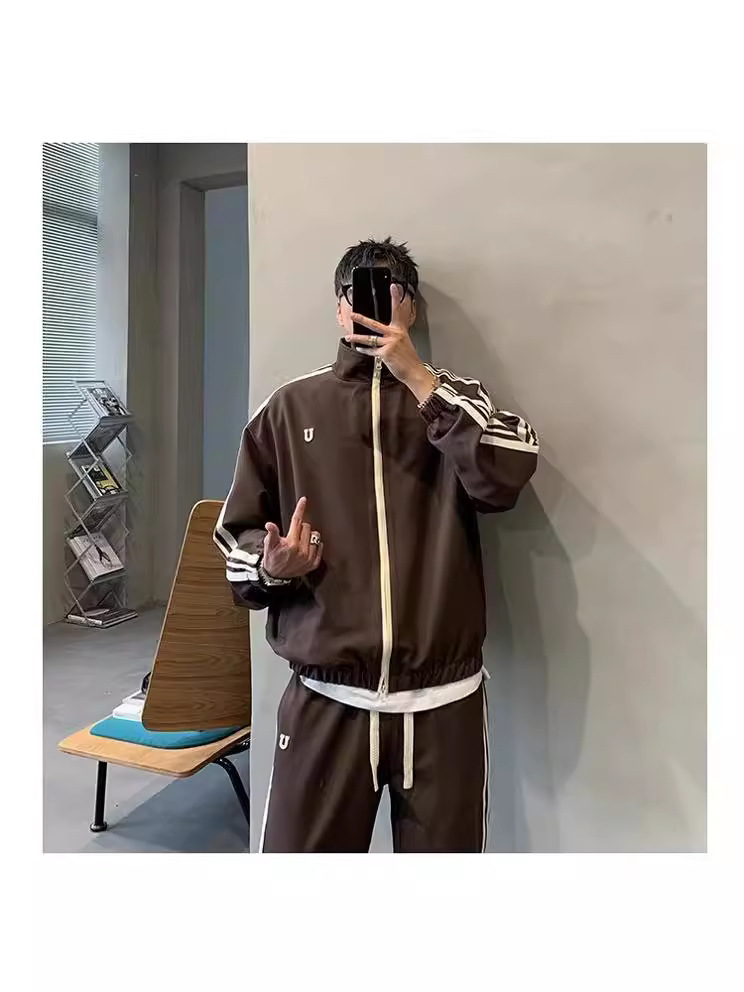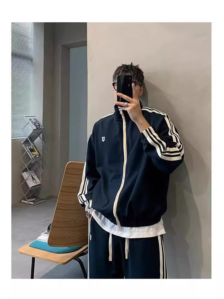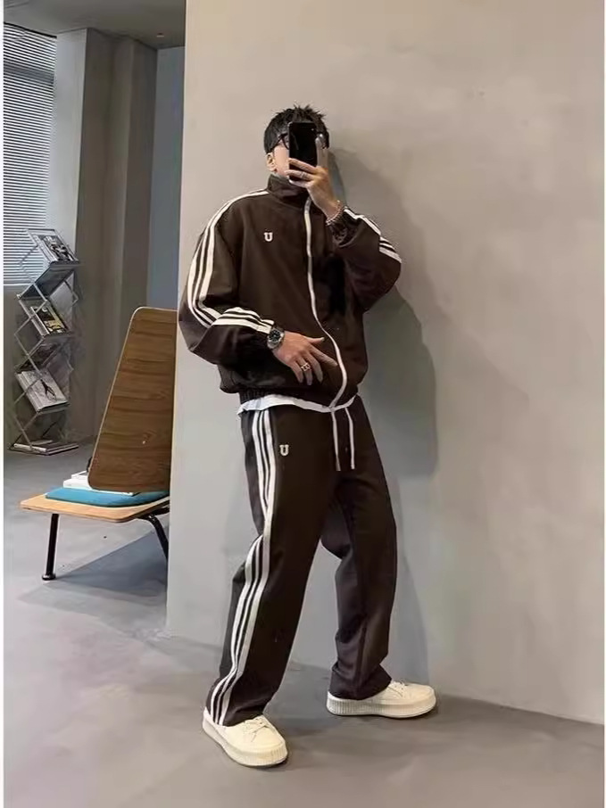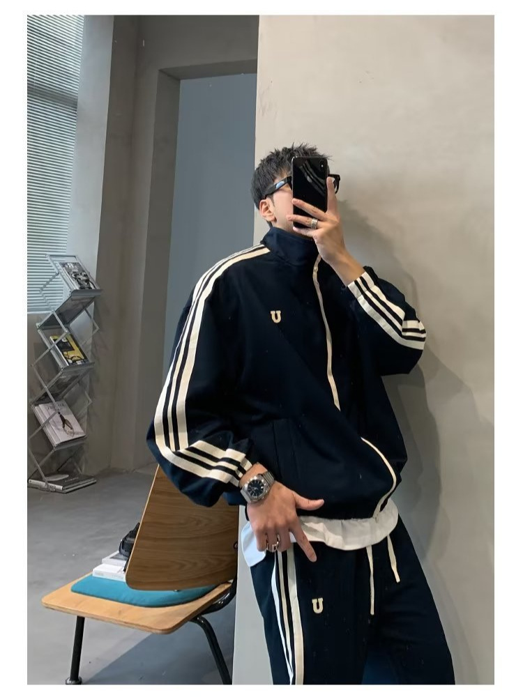 홍콩 스타일의 트렌디 남성 더블 폴 스웨트 셔츠 세트 남자 게으른 스포츠웨어 캐주얼 루즈 인 커플의 올 매치 긴팔 바지