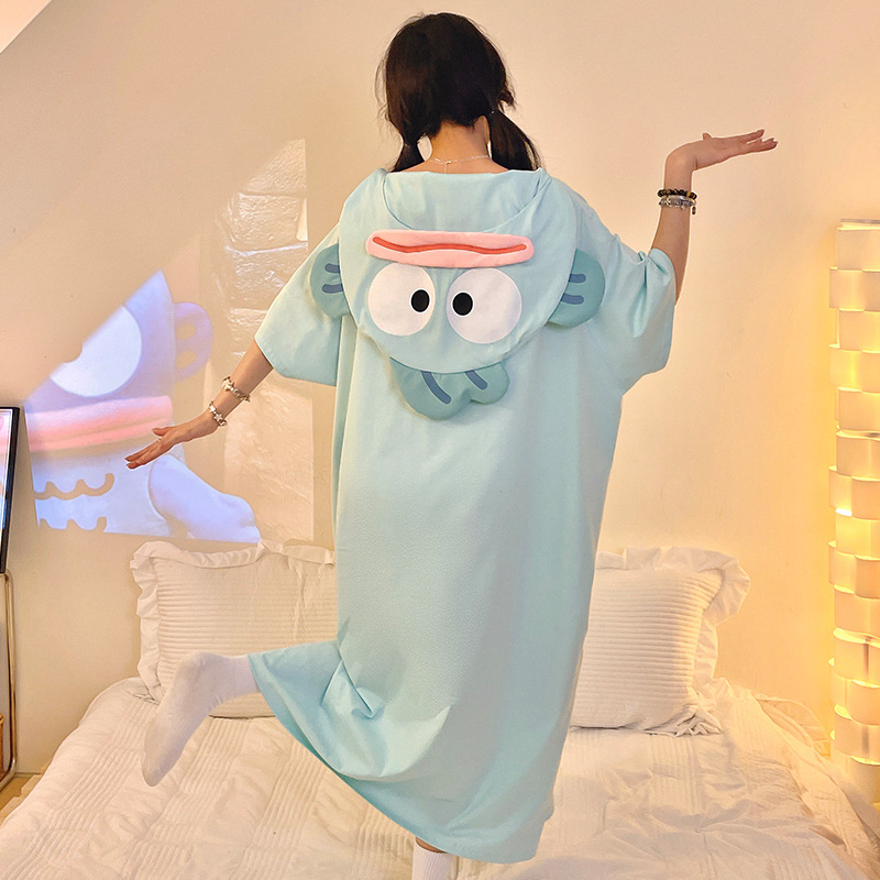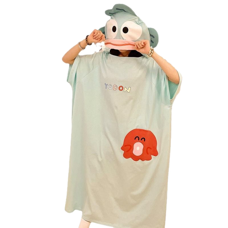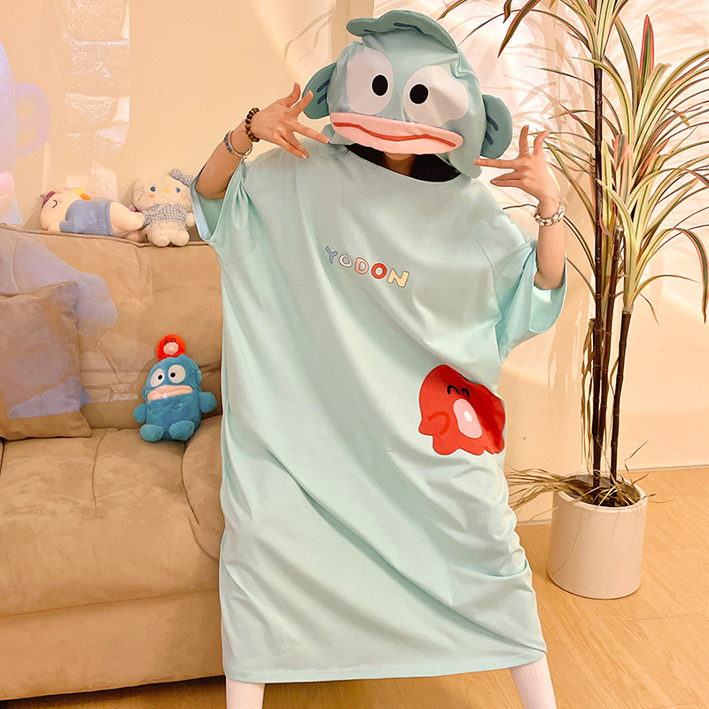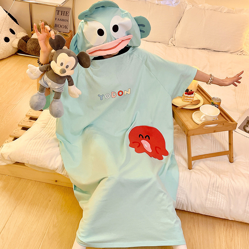 여름 만화 Hanton 추악한 물고기 후드 잠옷 코튼 반팔 얇은 여성 재미 있은 대형 사이즈는 집 밖에서 착용 가능
