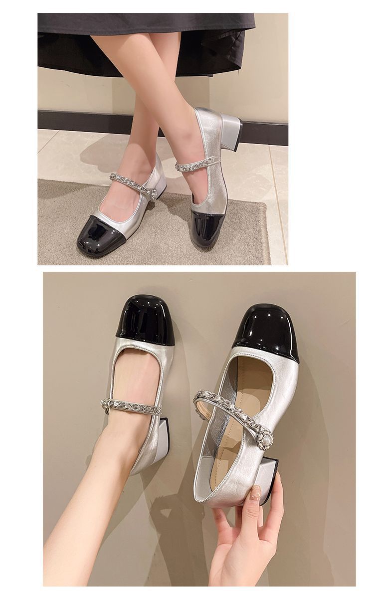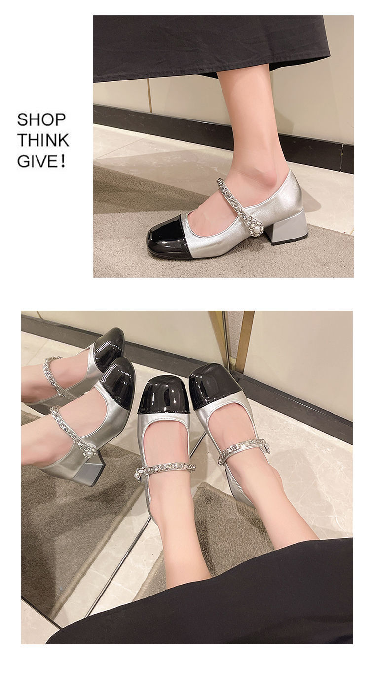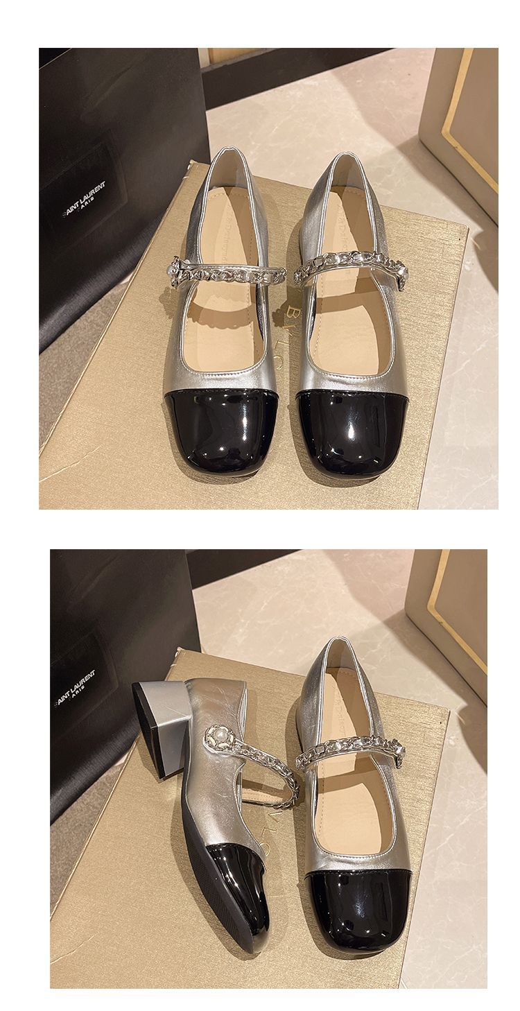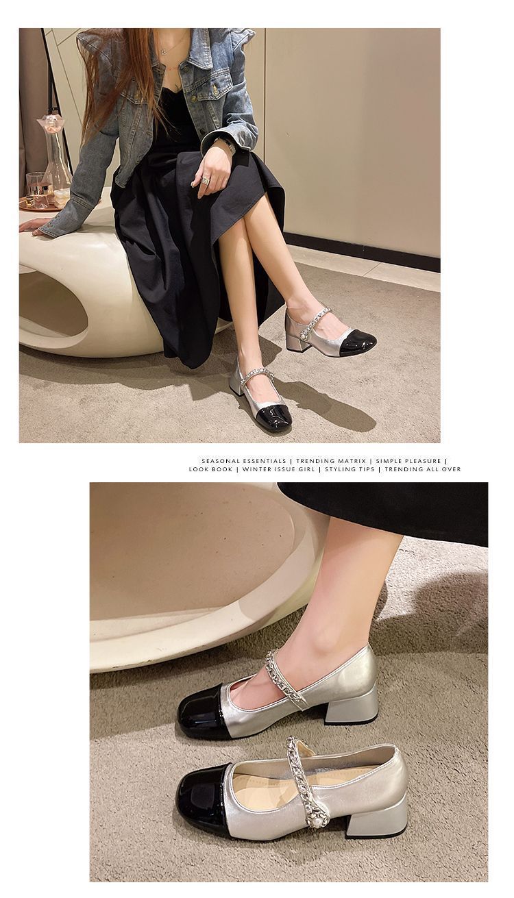 리틀 샤넬 스타일 메리 제인 신발 프렌치 스퀘어 발가락 하이힐 페어리 스타일 가죽 신발 진주 특허 가죽 두꺼운 힐 얕은 입 싱글 레이어 신발