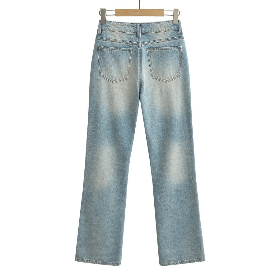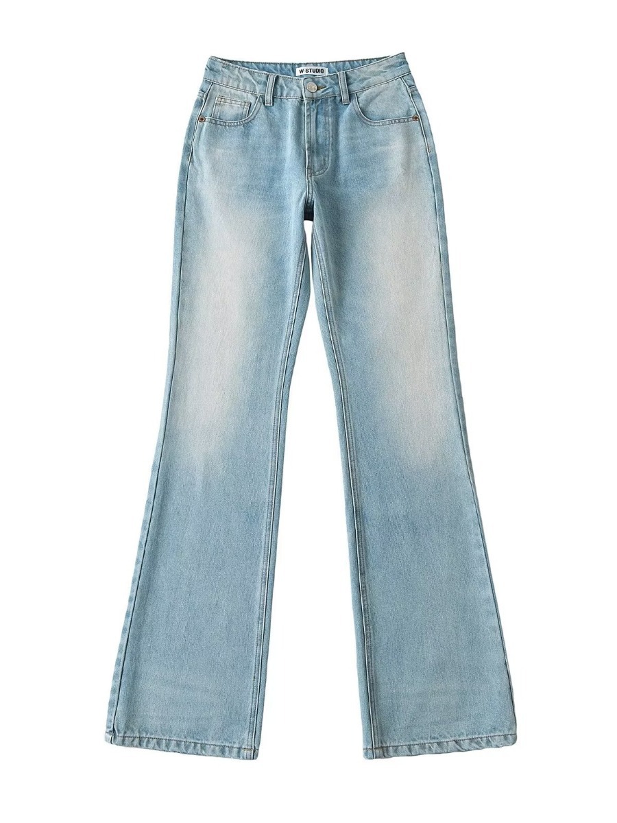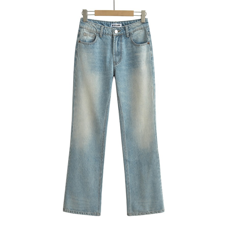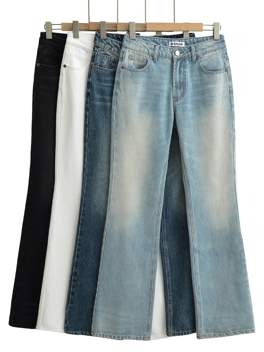 2025 신상 INS 유럽풍 워싱 화이트 미드웨이스트 플레어 팬츠 롱 레그 여성 하이웨이스트 슬림 데님 팬츠