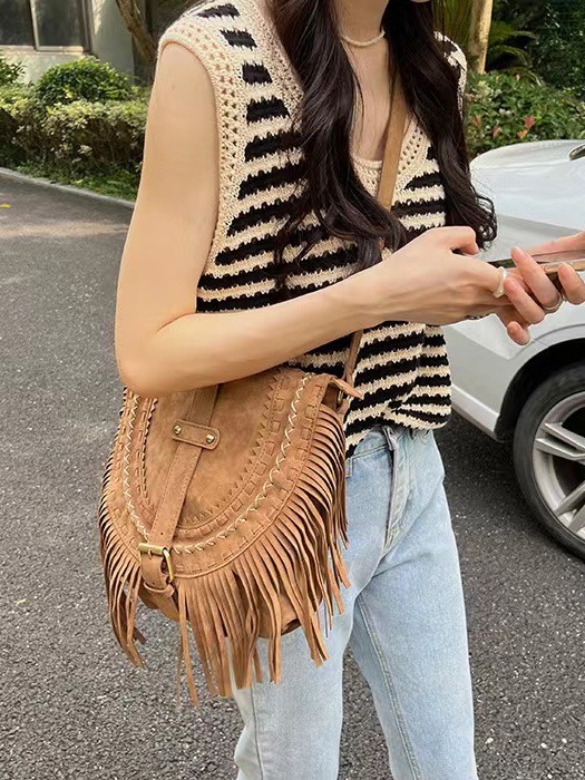 2025 새로운 비치 백 싱글 숄더 크로스 바디 백 모조 사슴 가죽 벨벳 태슬 백 대용량 여름 여행 필수 여성용 가방