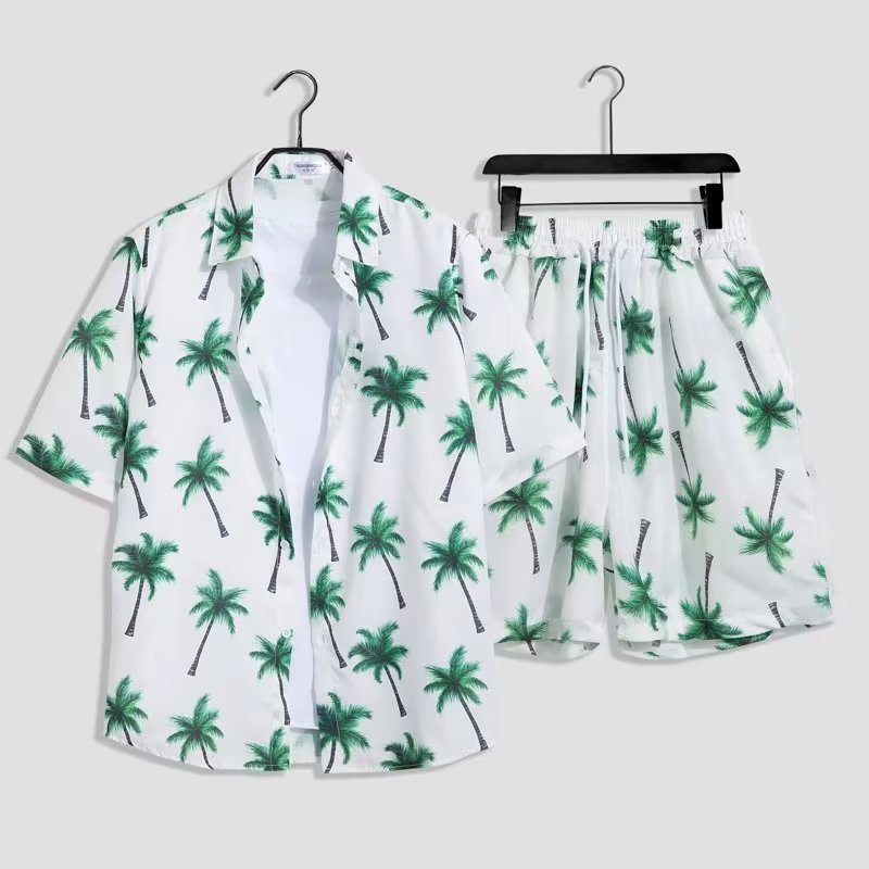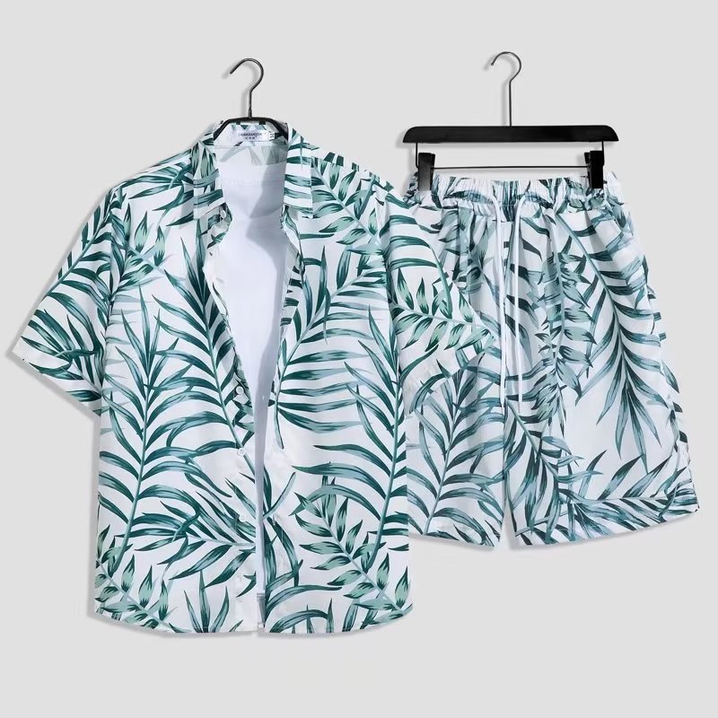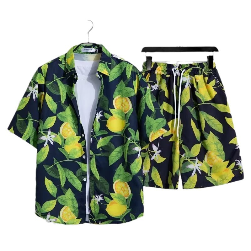 하와이안 인쇄 된 셔츠 비치 바지 큰 바지 커플 세트 선 스크린 얇은 세트 남자 아이스 실크 짧은 소매 셔츠