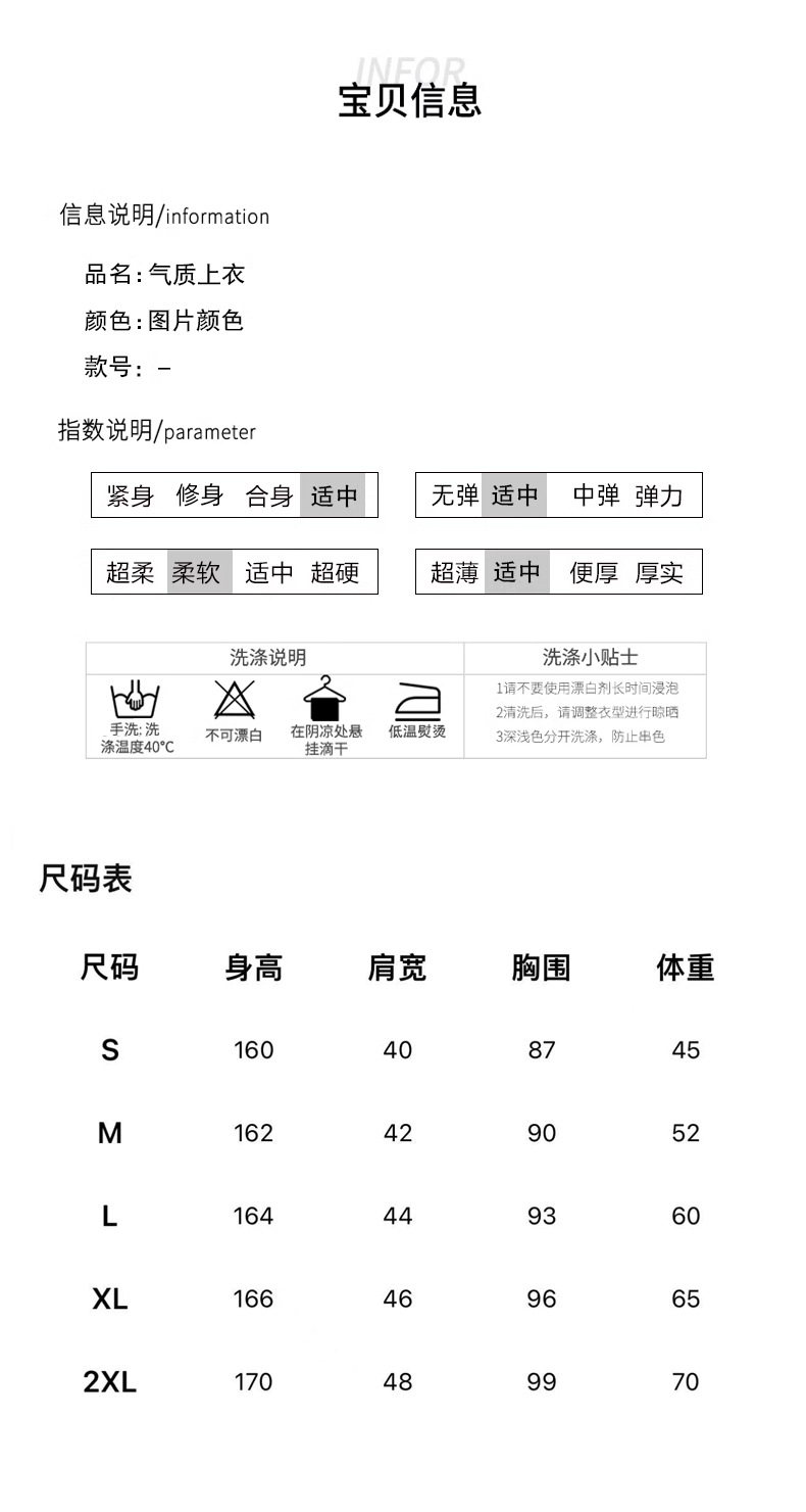 * 由于测量方法不同,尺寸数据可能存在1~4cm误差属正常 * * 由于电脑显示器的分辨率不同,颜色可能出现一些不同的现象 ,介意慎拍,已收到的实物为准。* REMARKS/特别注意 *建议手洗,请勿机洗或与有拉链或坚硬物品一起洗涤* *牛仔及深色衣物洗涤如有掉色属自然现象,为防止染色请单独洗涤* *加绒衣物掉毛;毛衣大衣等起球问题属于正常情况,用剃毛机护理即可*