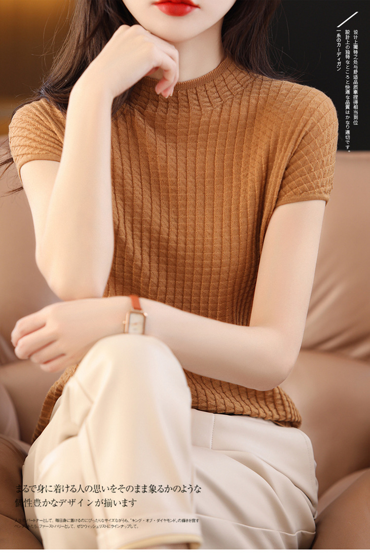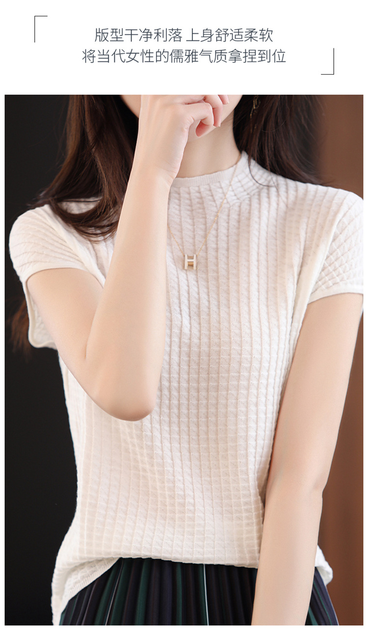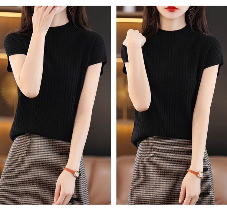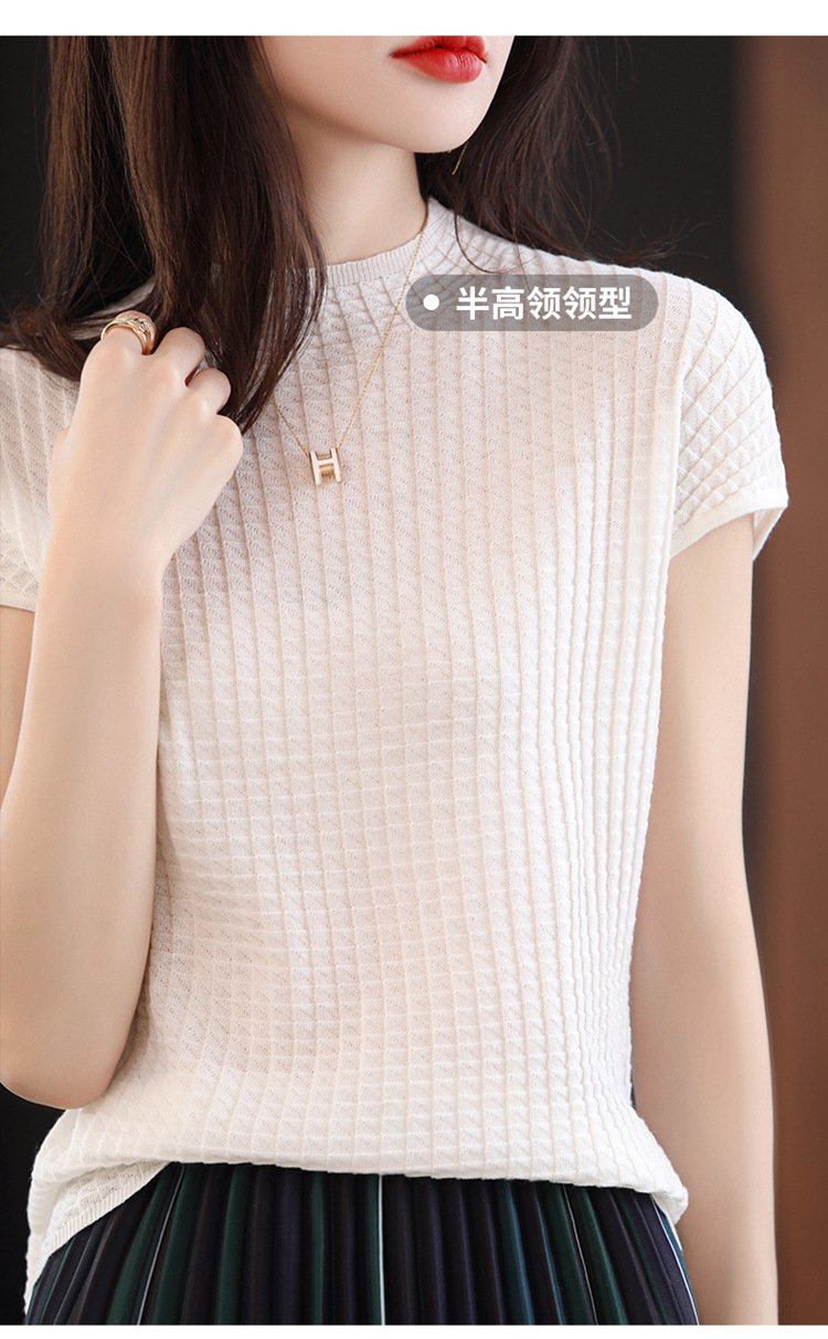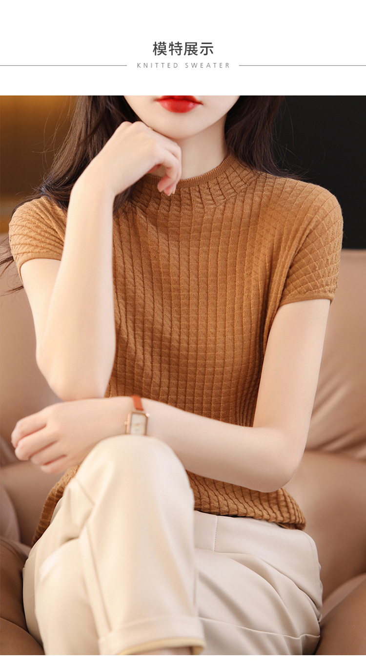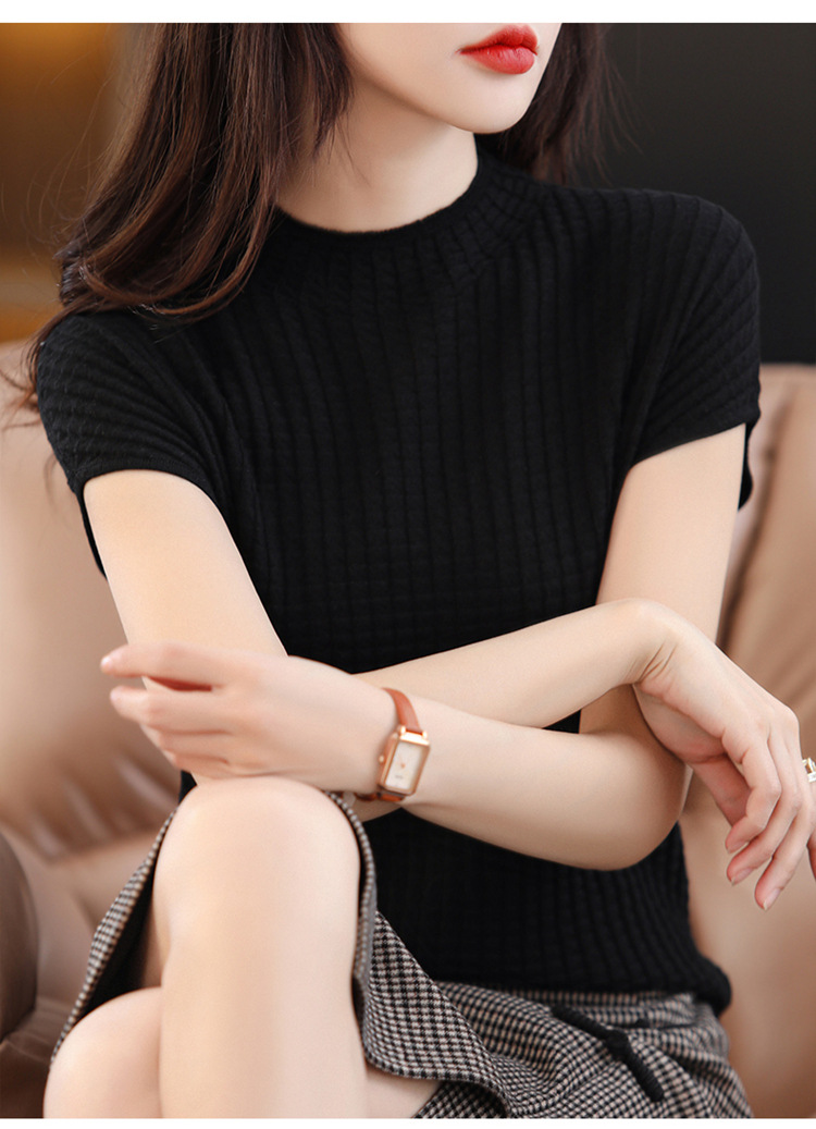 봄과 여름 2024 새로운 아이스 실크 블랙 하프 하이 칼라 짧은 소매 니트 베이스 셔츠 여성의 기질 중공 티셔츠 여성의 얇은