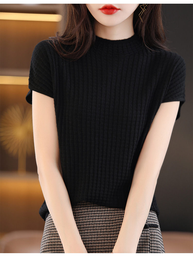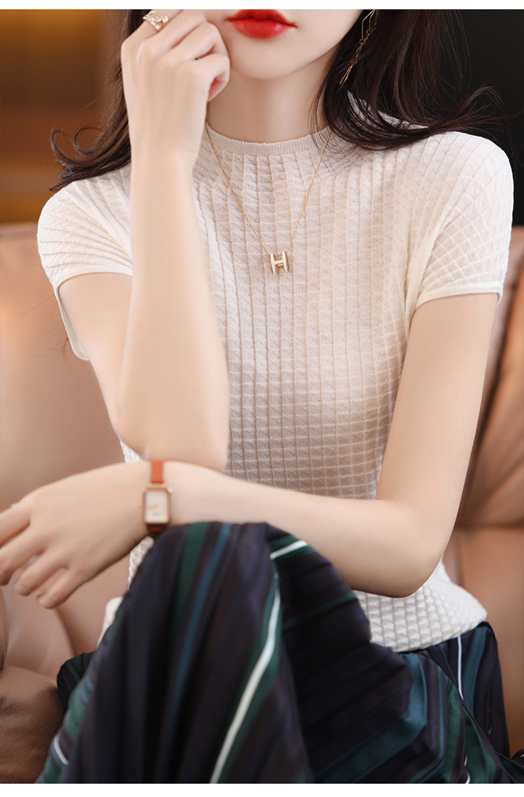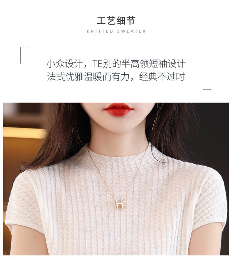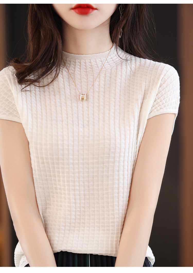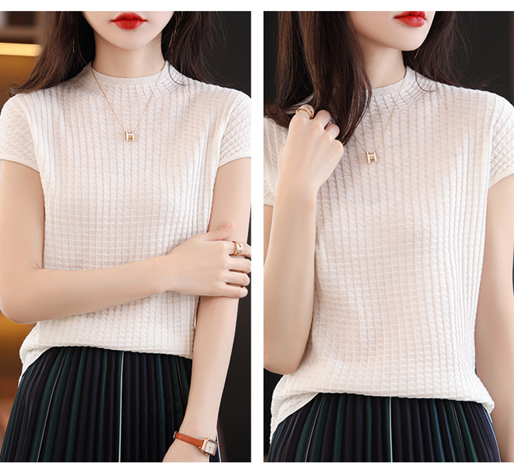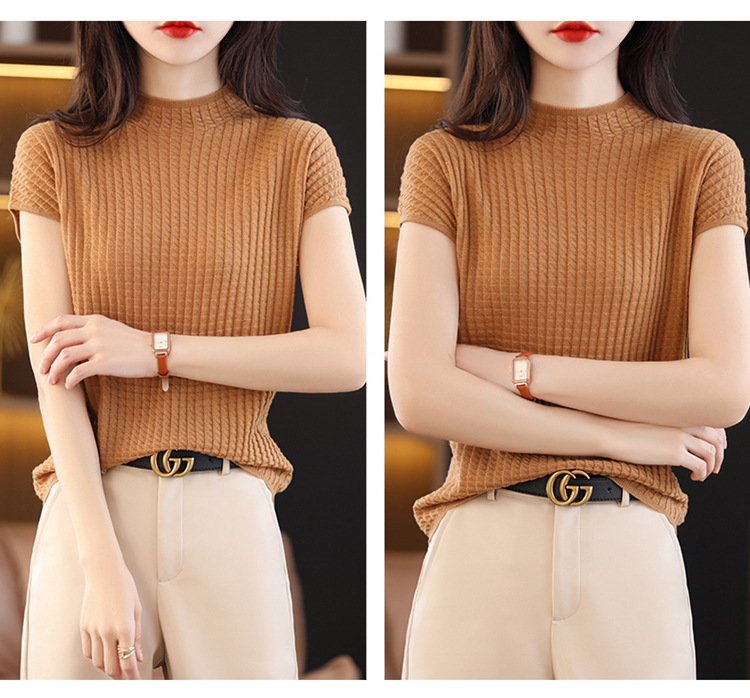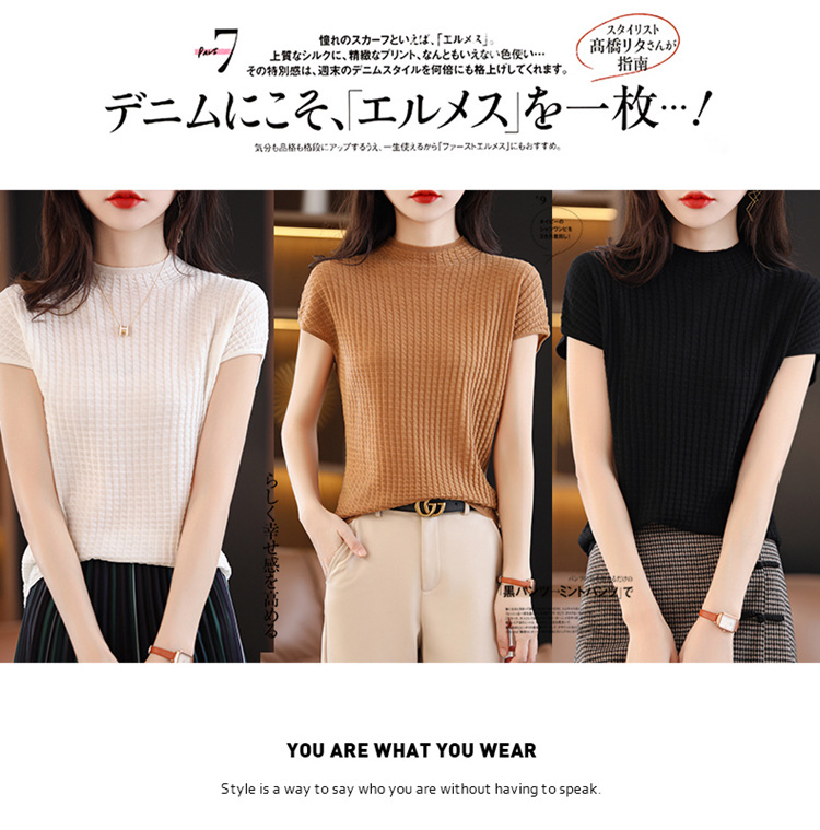 봄과 여름 2024 새로운 아이스 실크 블랙 하프 하이 칼라 짧은 소매 니트 베이스 셔츠 여성의 기질 중공 티셔츠 여성의 얇은