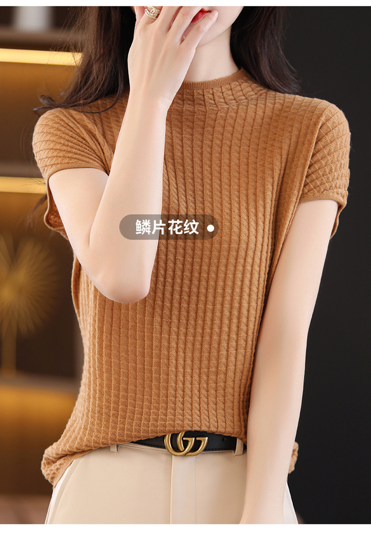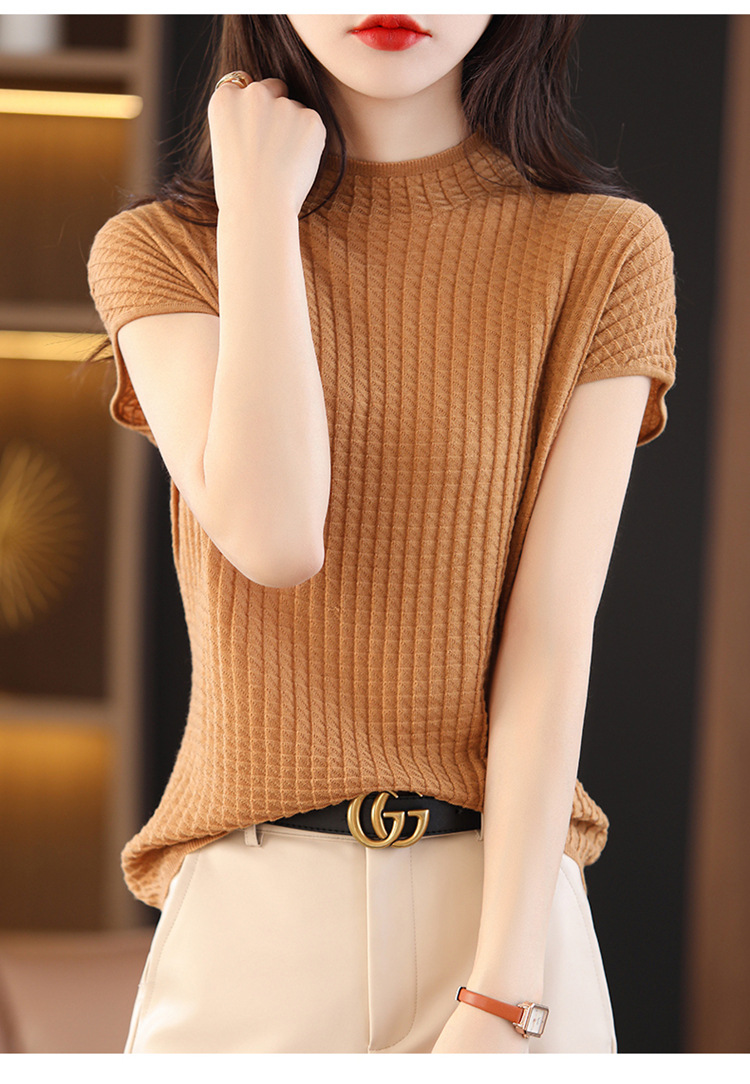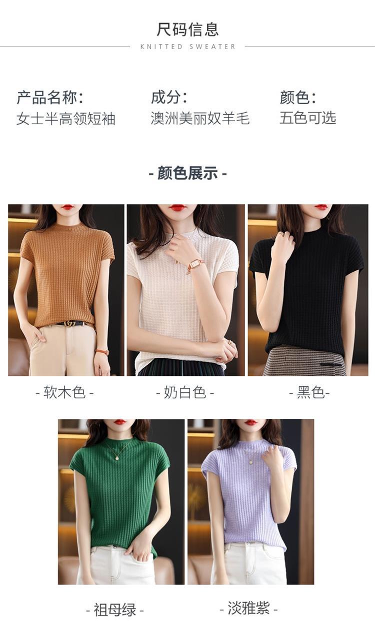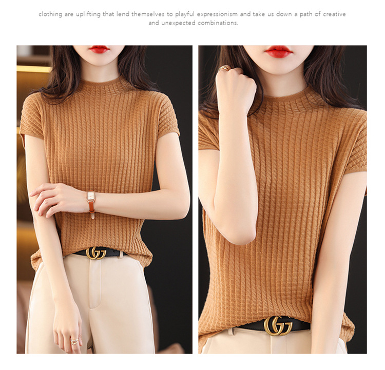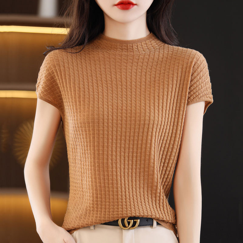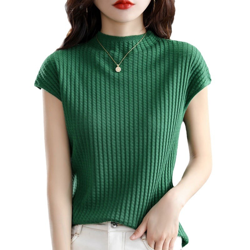봄과 여름 2024 새로운 아이스 실크 블랙 하프 하이 칼라 짧은 소매 니트 베이스 셔츠 여성의 기질 중공 티셔츠 여성의 얇은