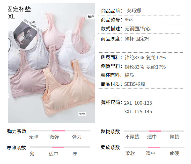 안차오나 863 중노년층용 얇은 고정컵 조끼형 브라, 큰 가슴 처짐 방지 속옷, 무봉제