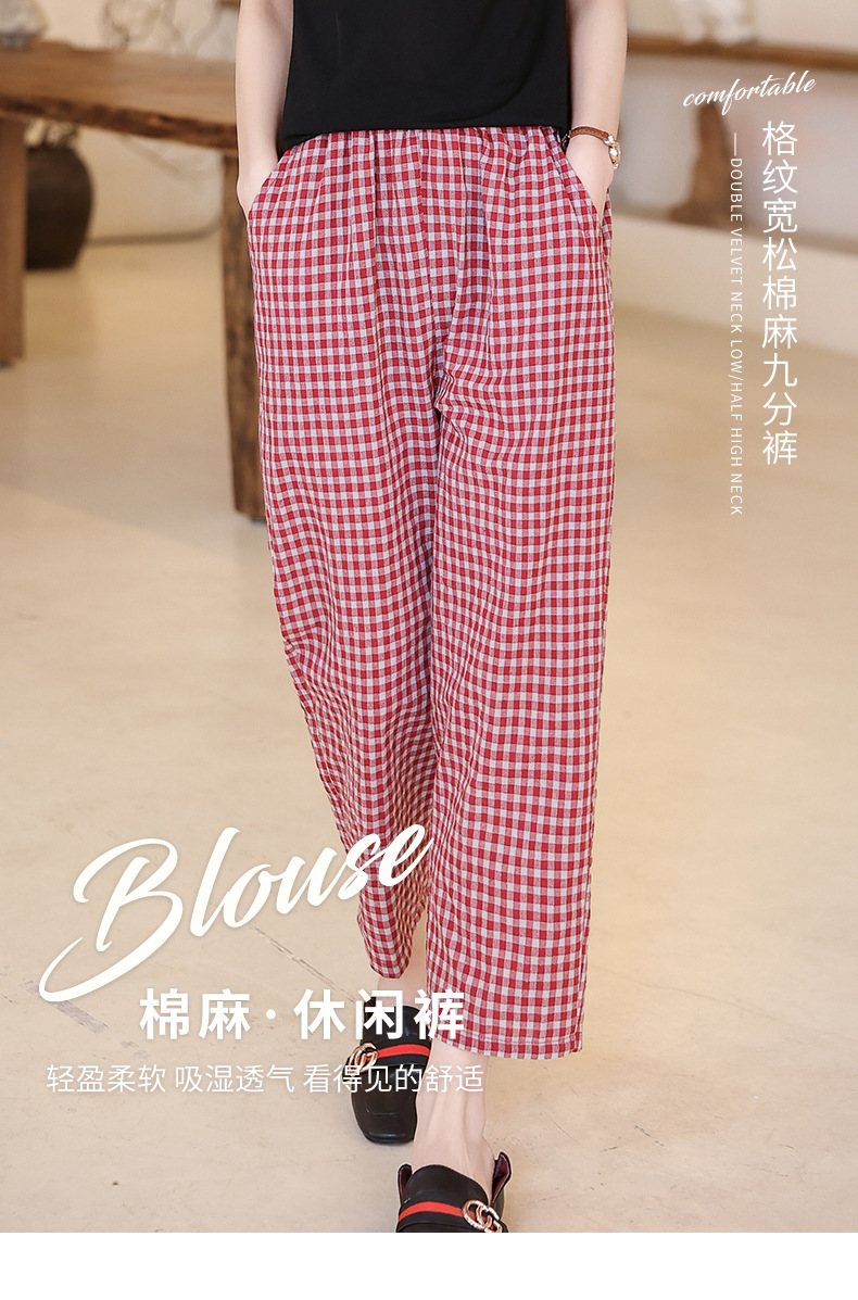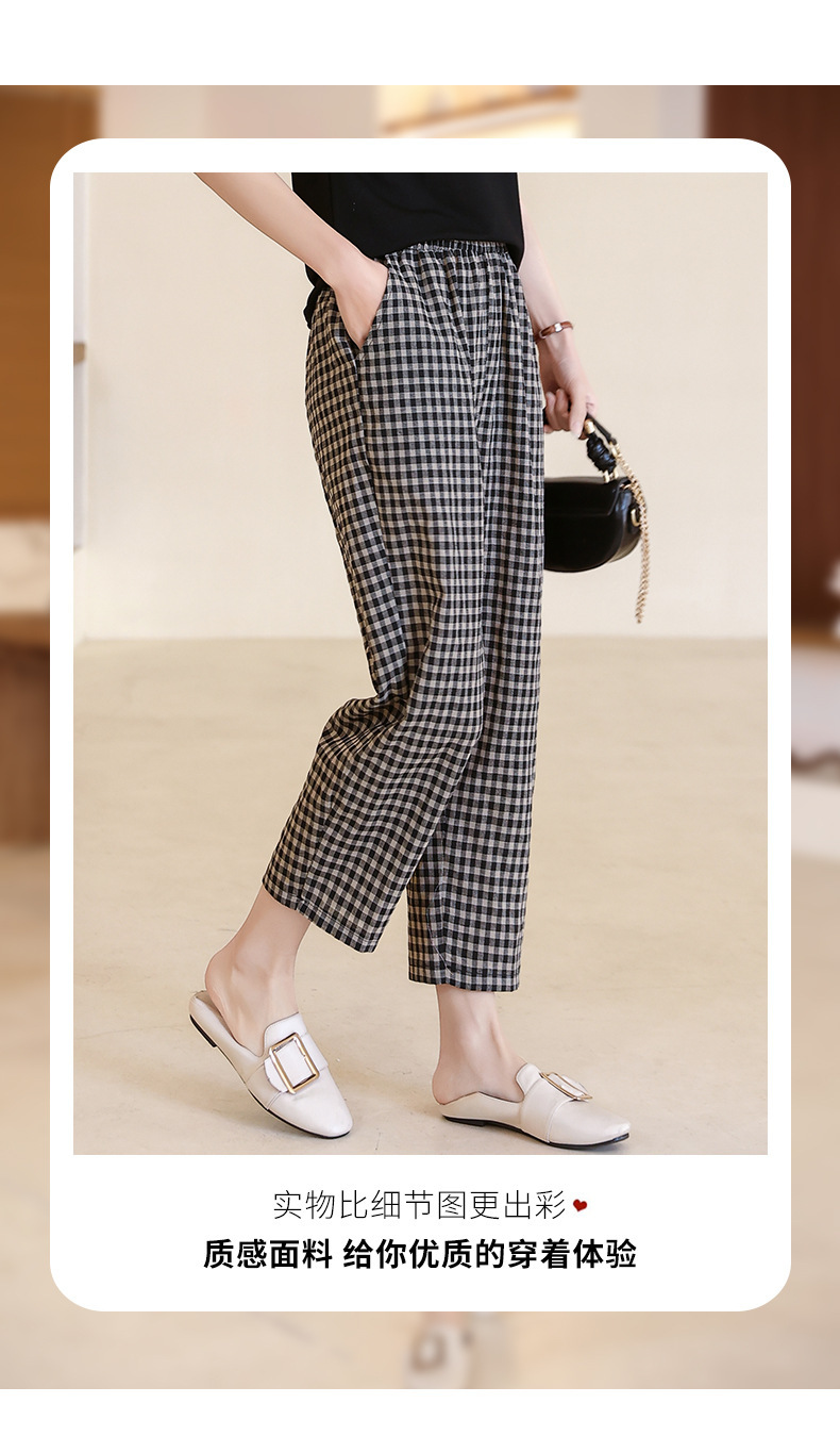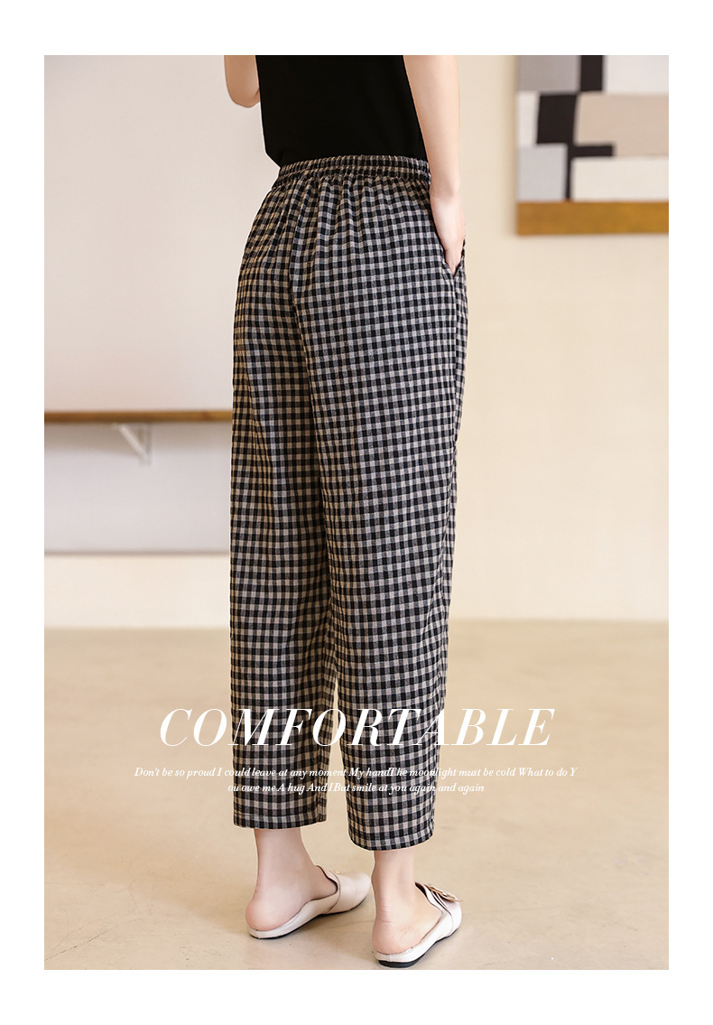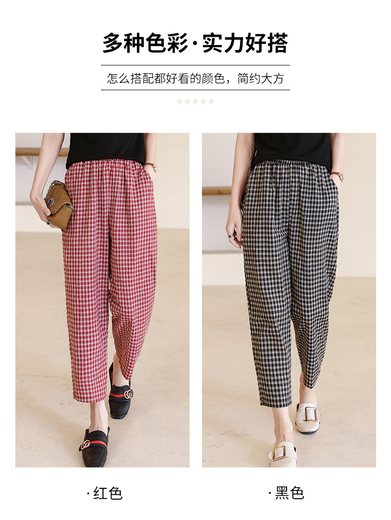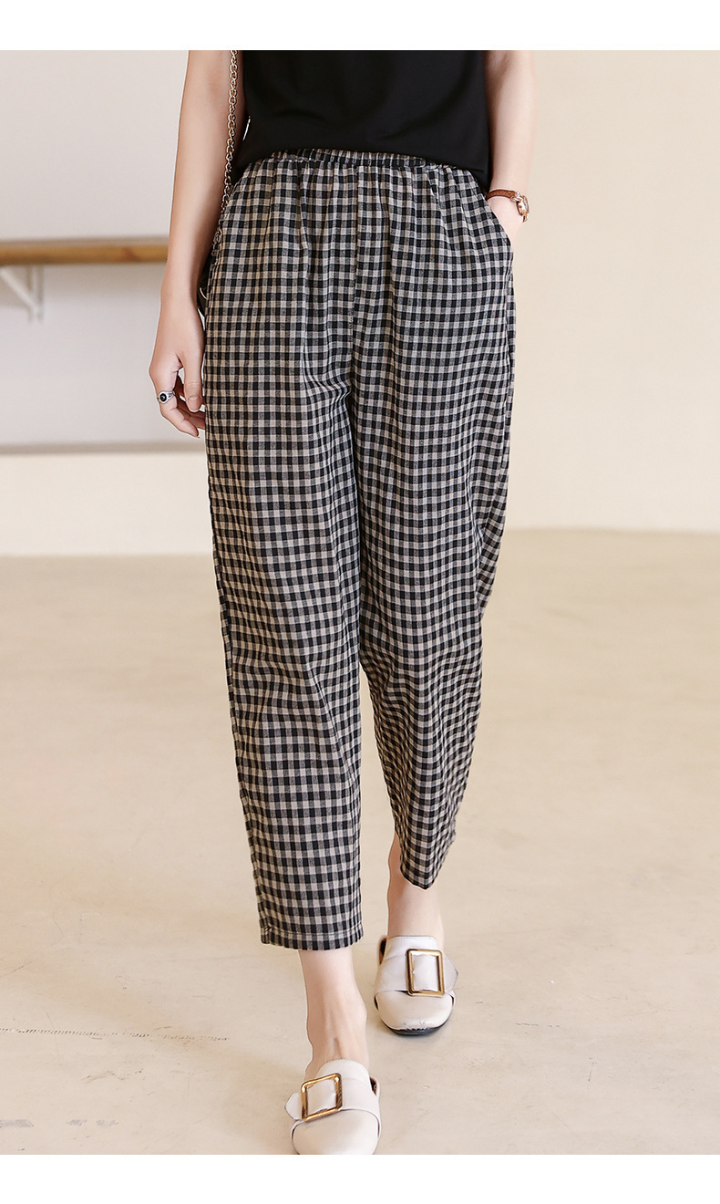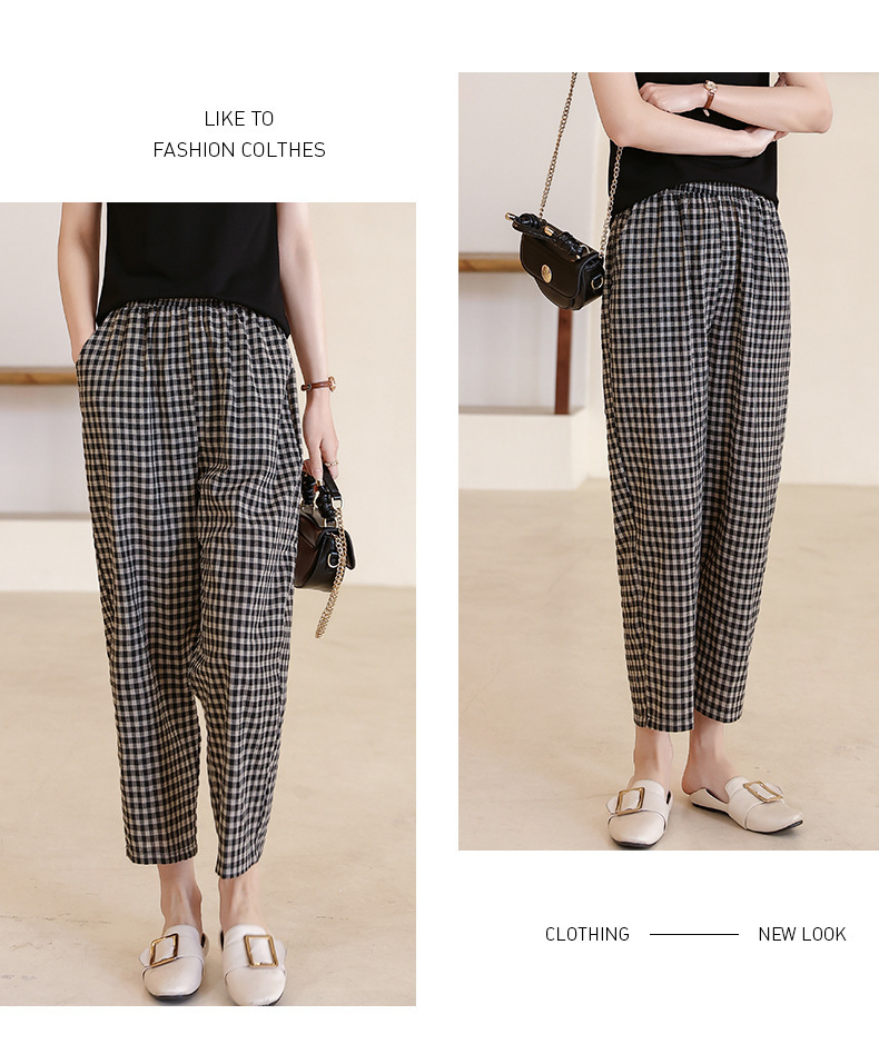 여름 한국 스타일 새로운 흑백 격자 무늬 캐주얼 바지 높은 허리 느슨한 대형 면 린넨 9 점 스트레이트 해렌 트렌디 바지