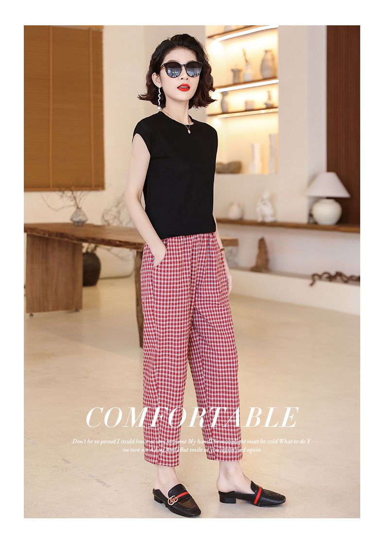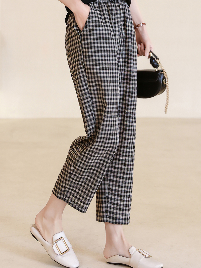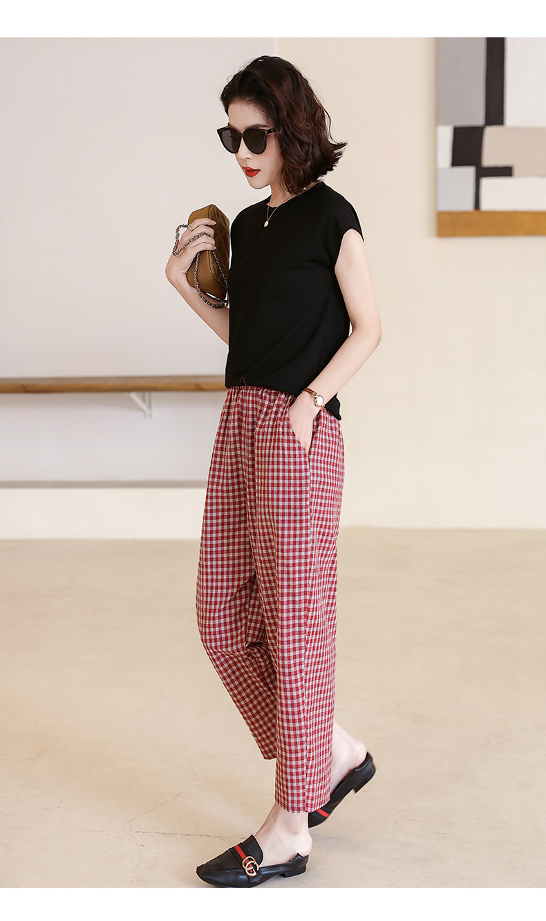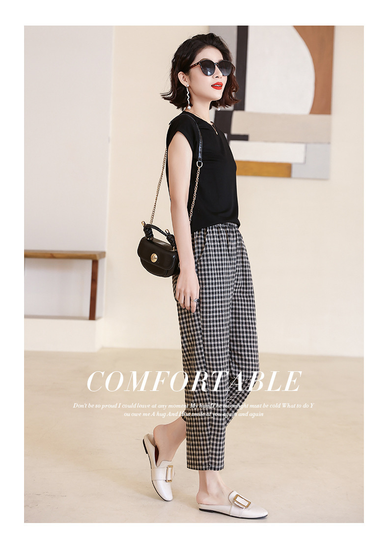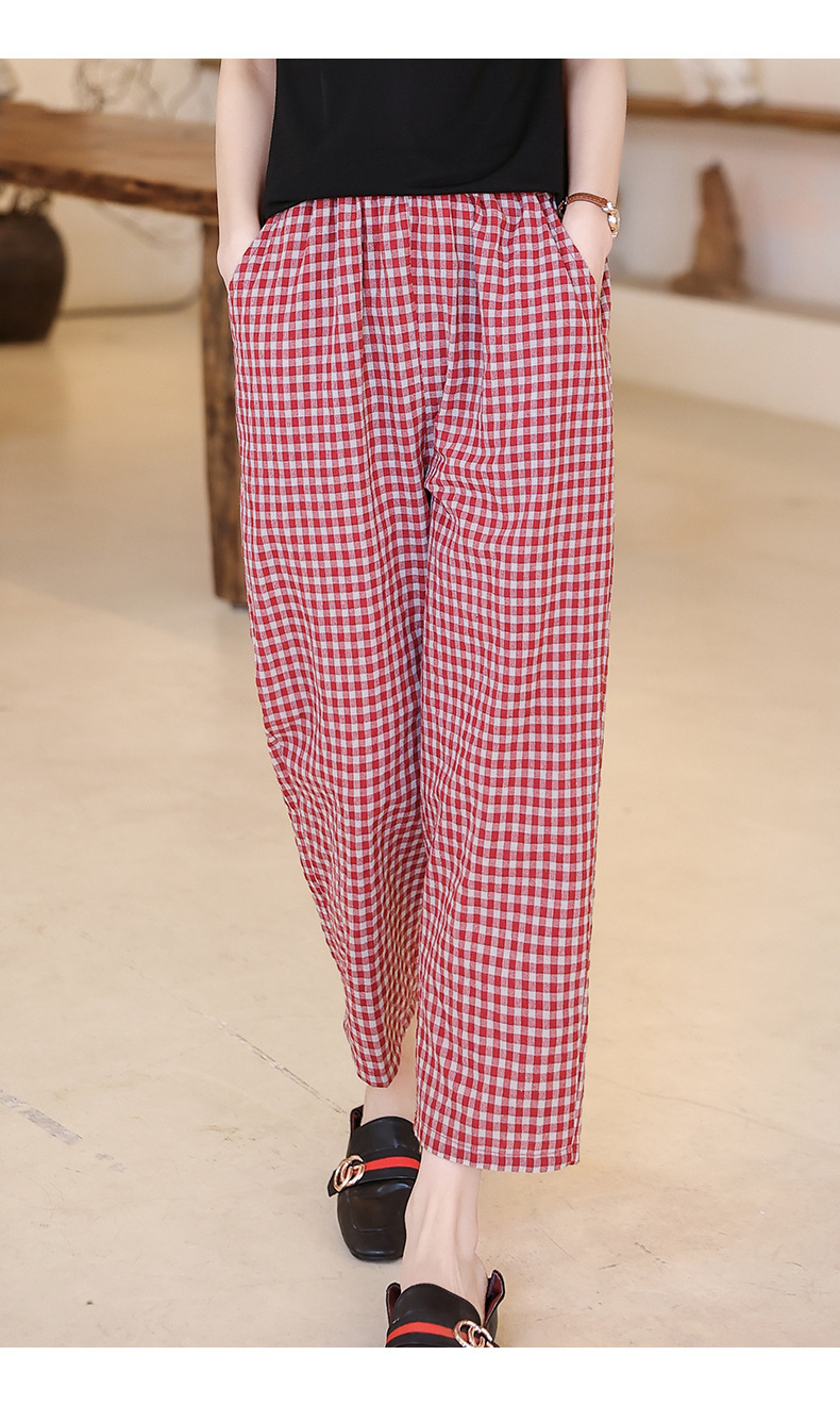 여름 한국 스타일 새로운 흑백 격자 무늬 캐주얼 바지 높은 허리 느슨한 대형 면 린넨 9 점 스트레이트 해렌 트렌디 바지