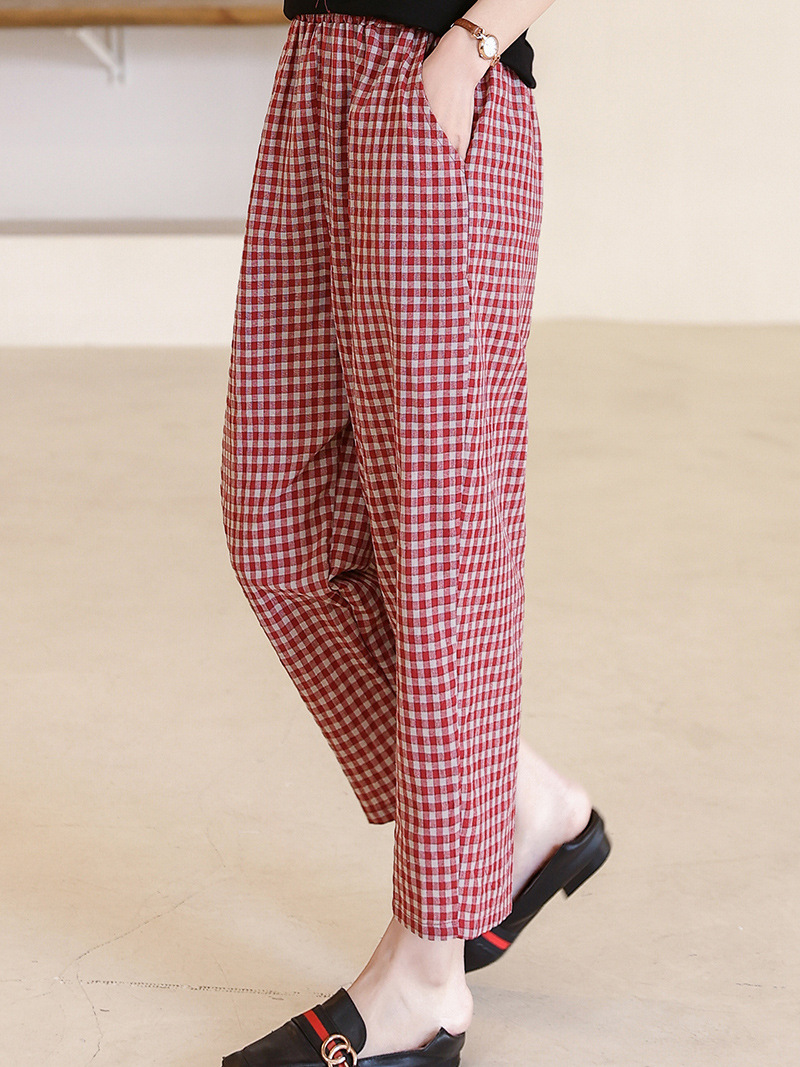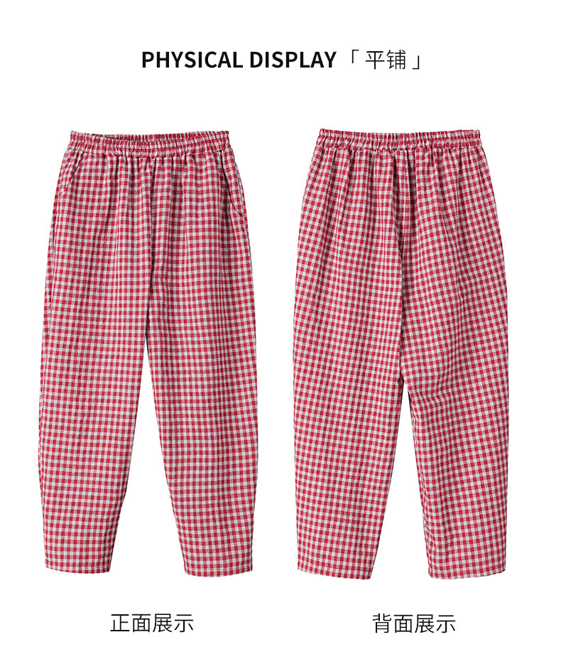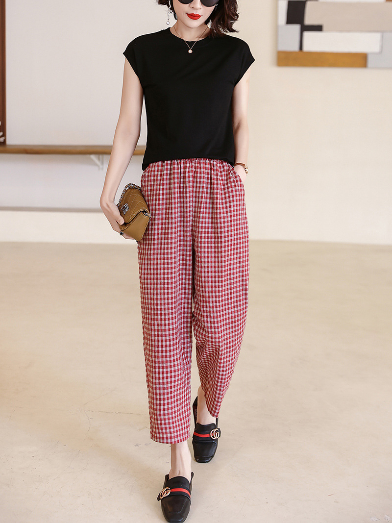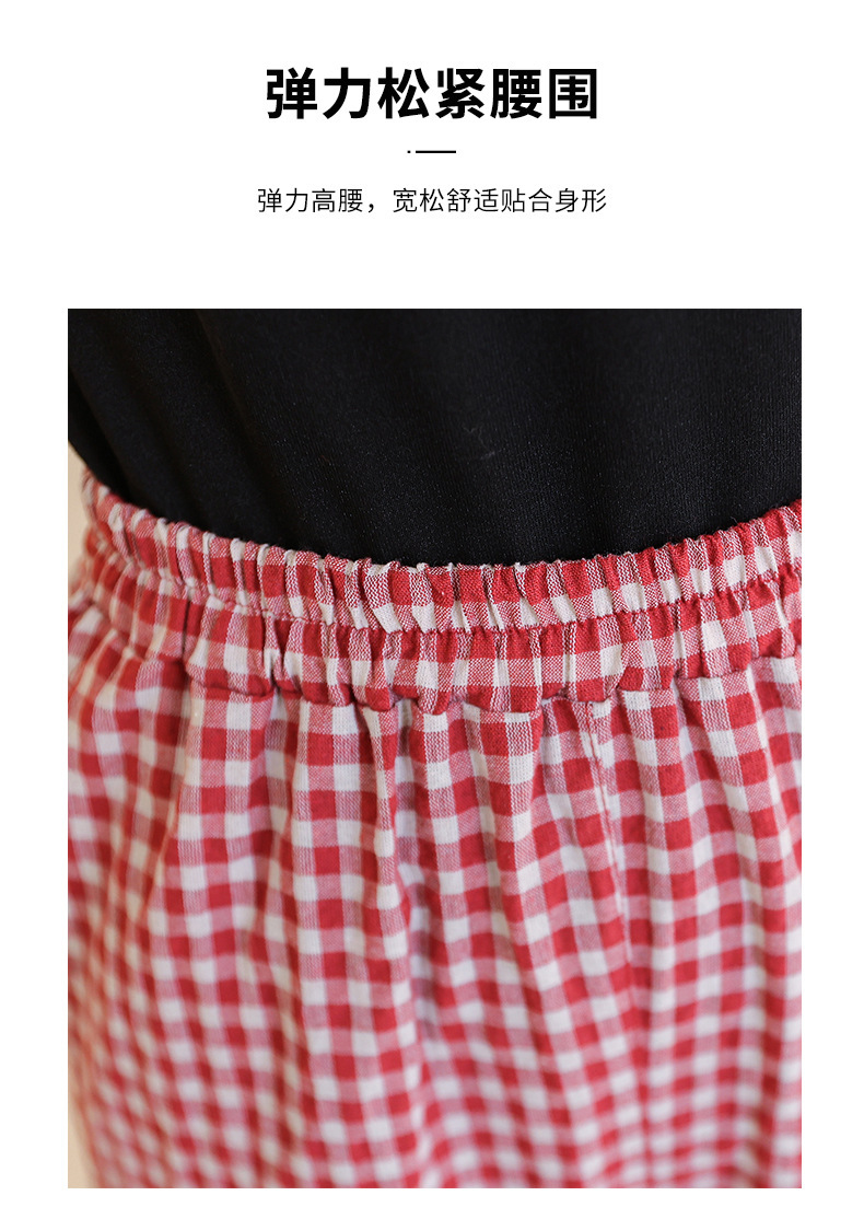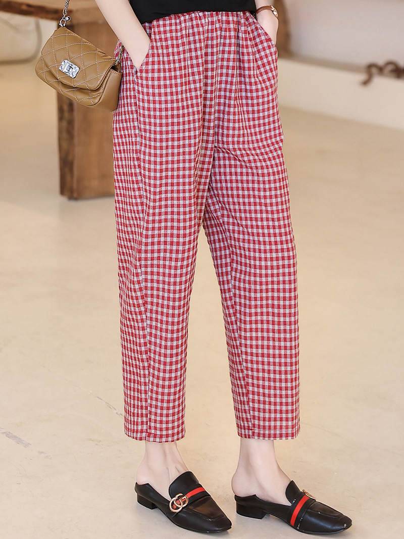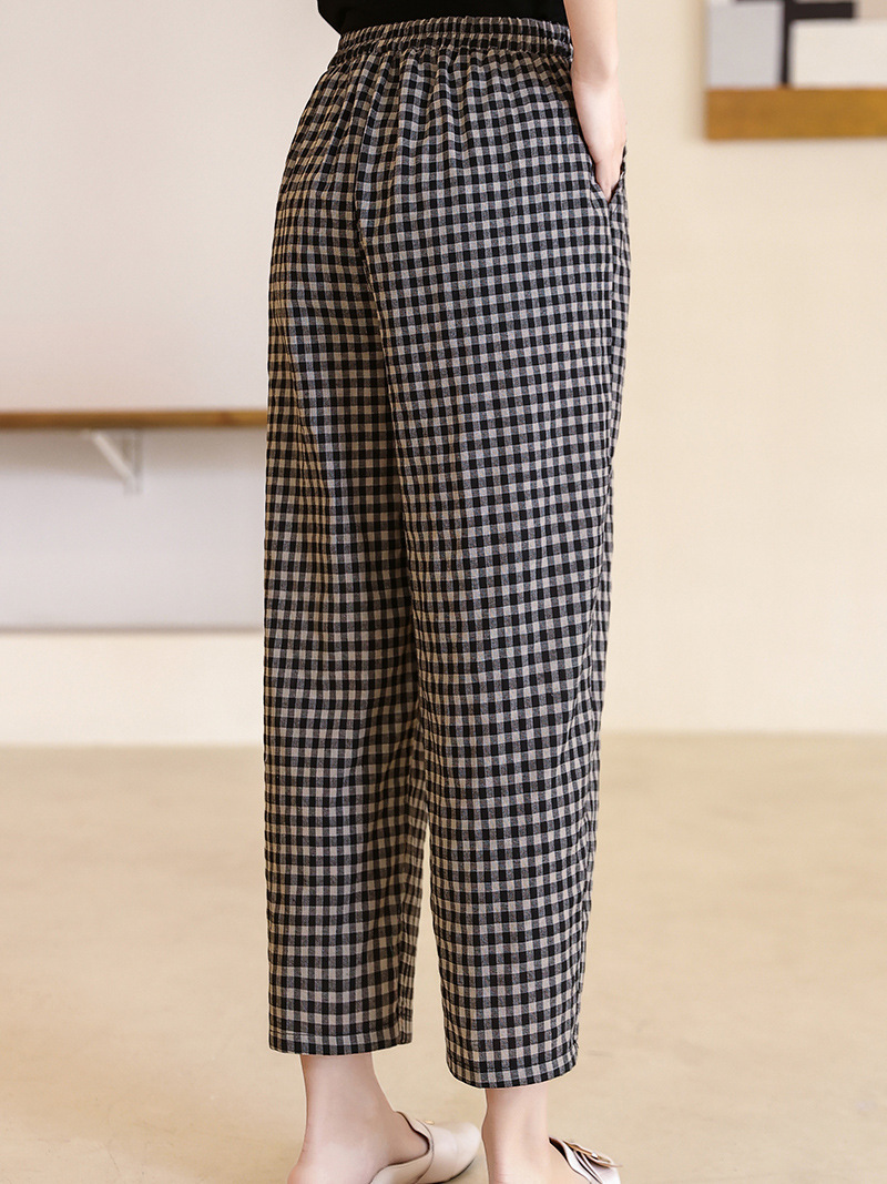 여름 한국 스타일 새로운 흑백 격자 무늬 캐주얼 바지 높은 허리 느슨한 대형 면 린넨 9 점 스트레이트 해렌 트렌디 바지