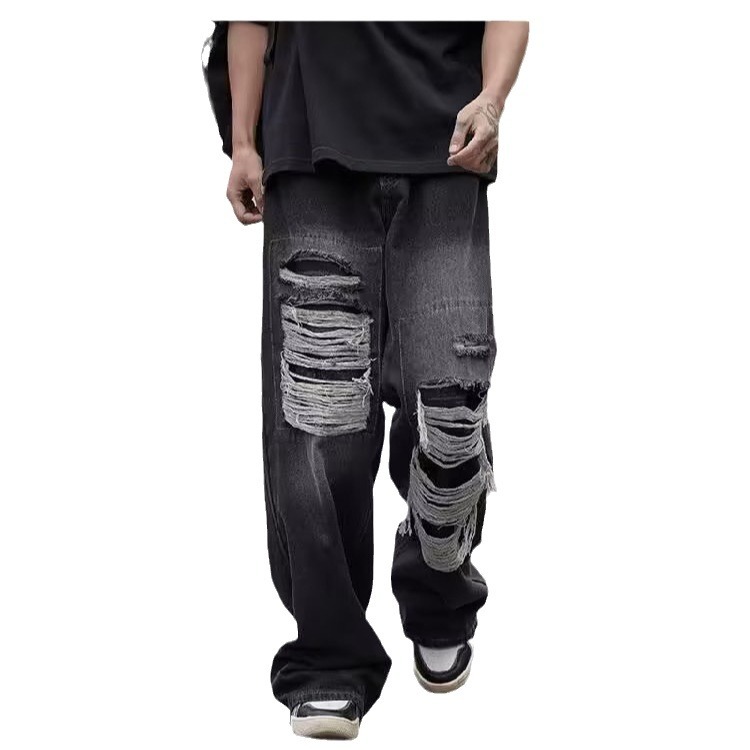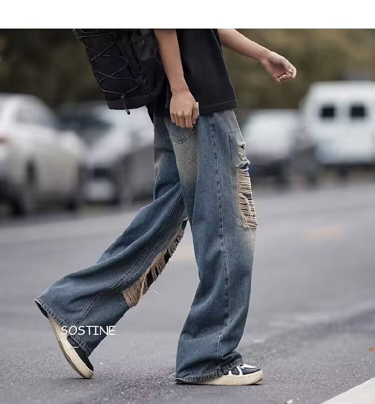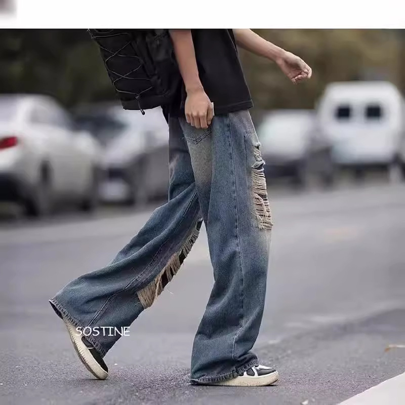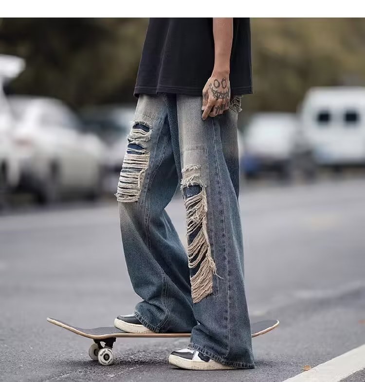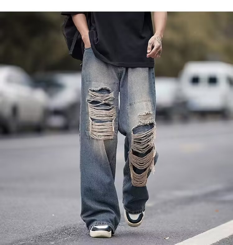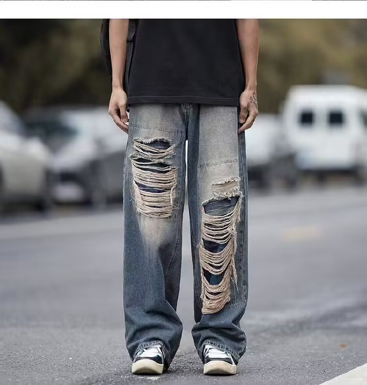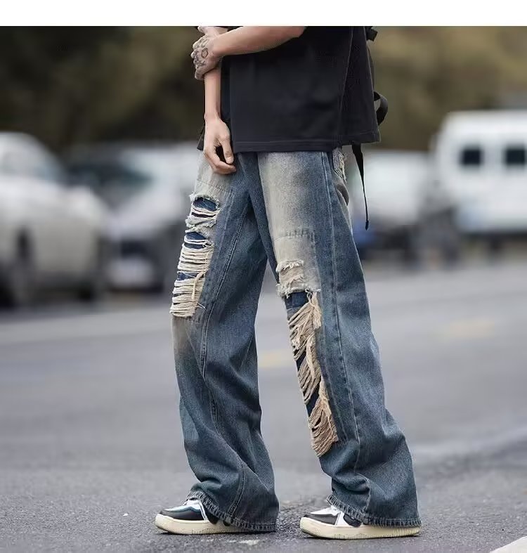 아메리칸 스타일 레트로 찢어진 청바지 남성용 여름 오래 된 느슨한 넓은 다리 스트레이트 튜브 트렌디 브랜드 하이 스트리트 팬츠