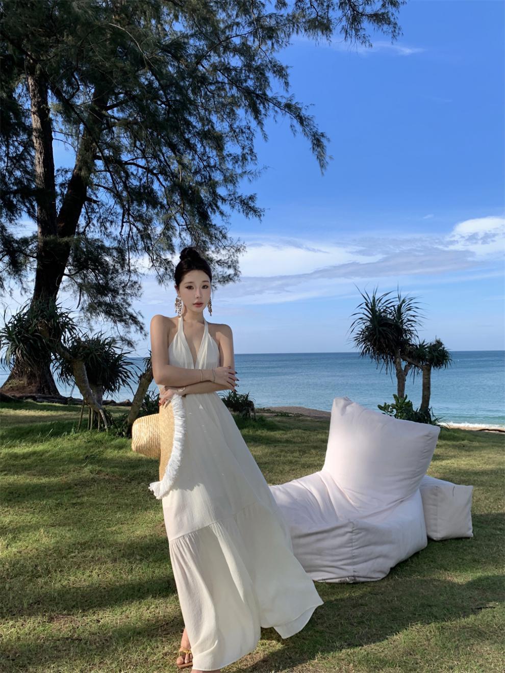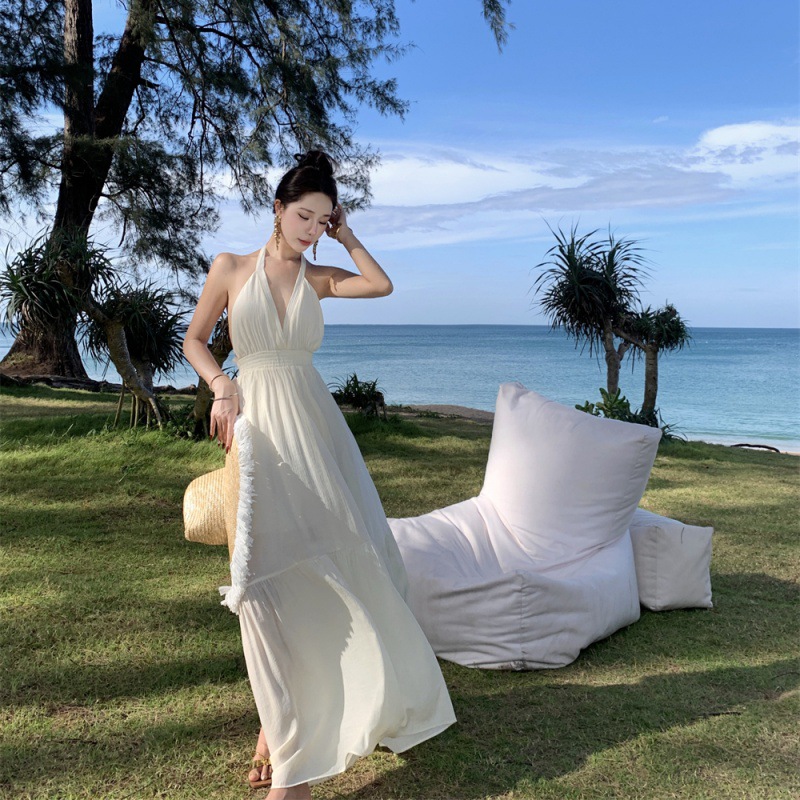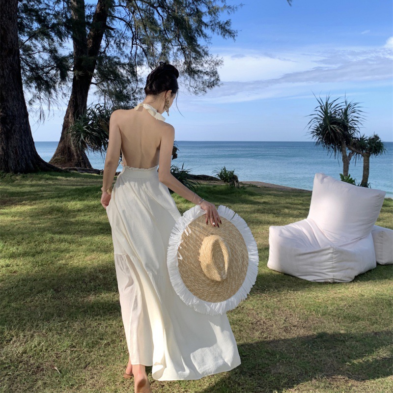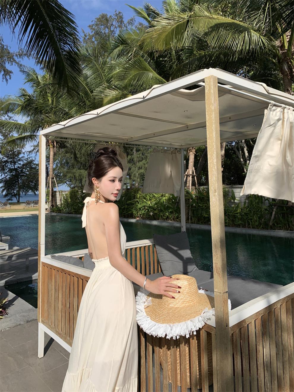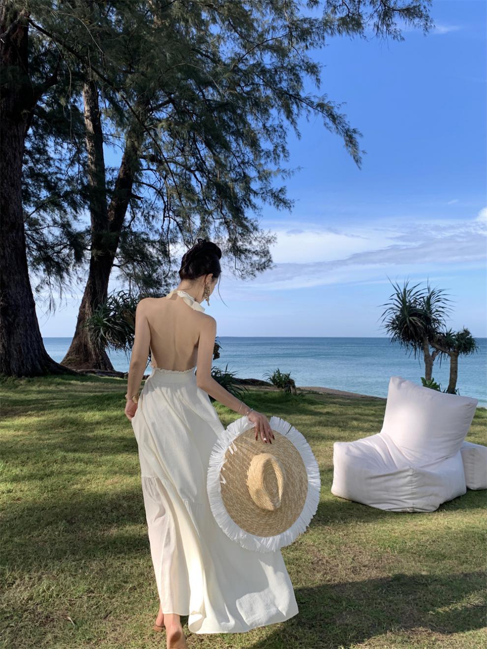 홀리데이 스타일 백리스 스커트 여성 이른 봄 프랑스 스타일 우아한 원피스 해변 원피스 긴 치마
