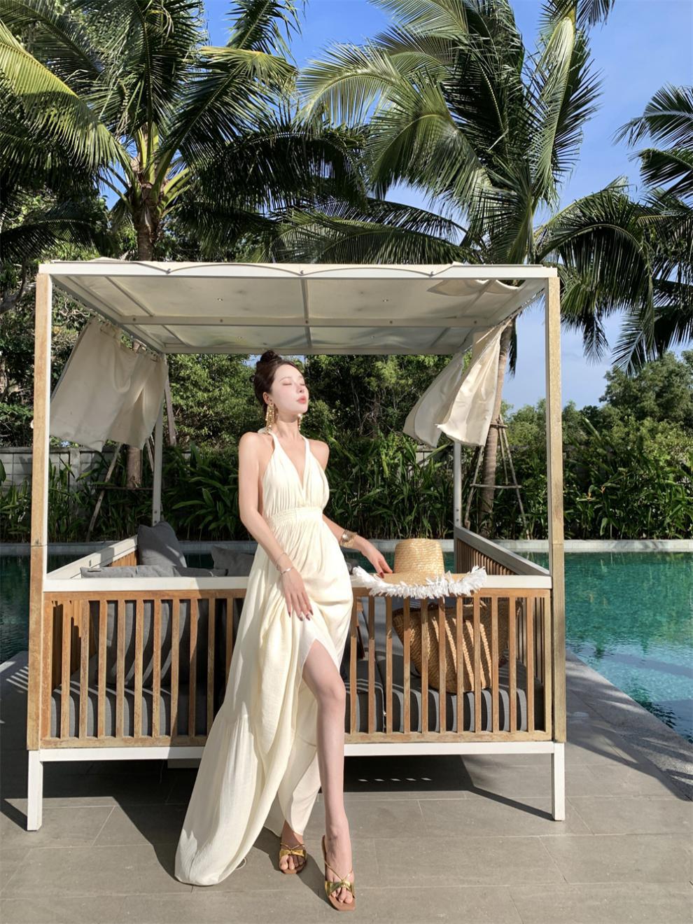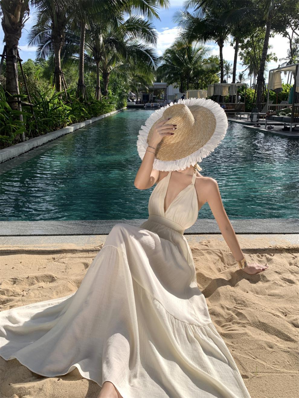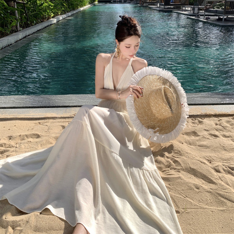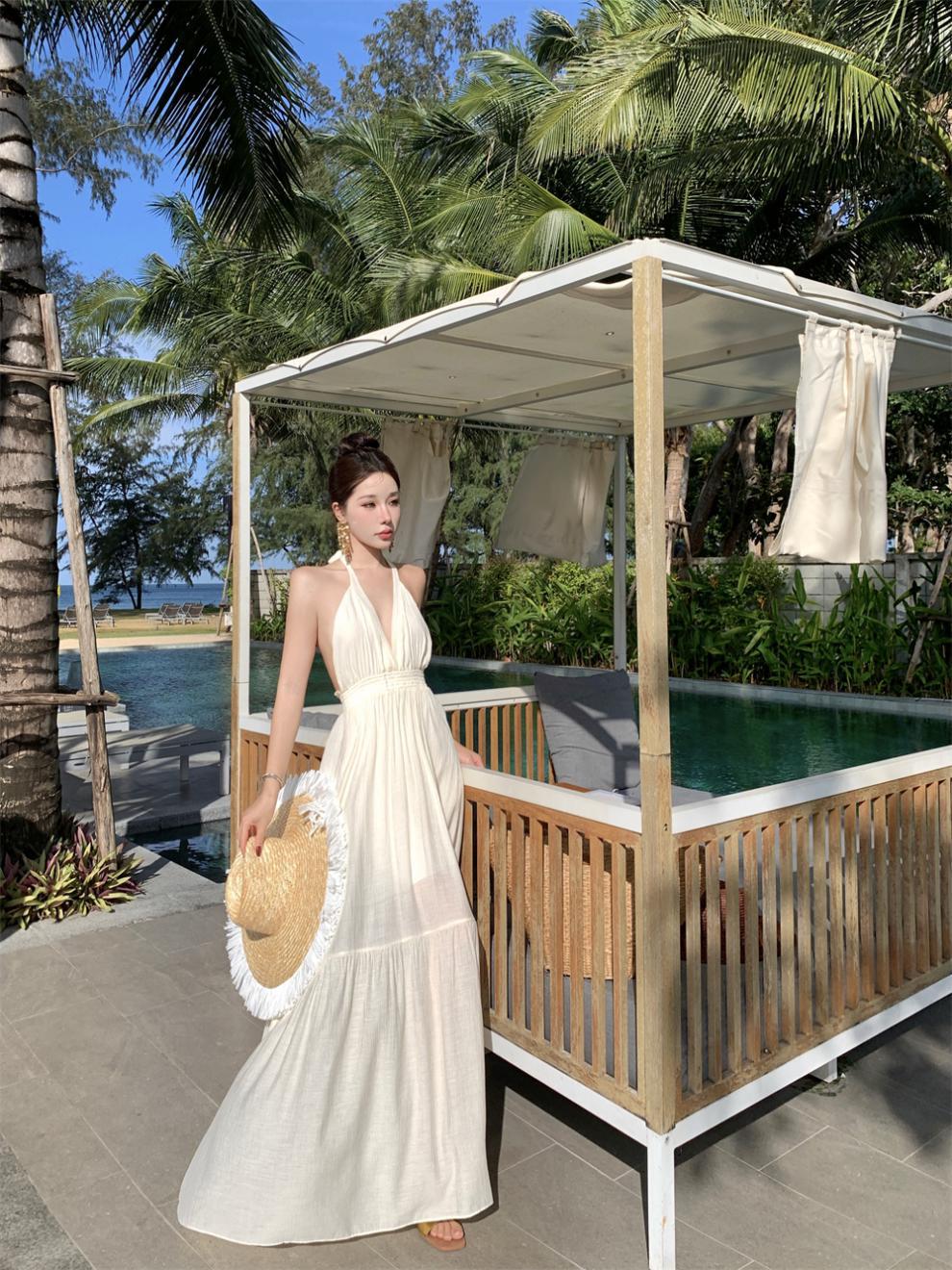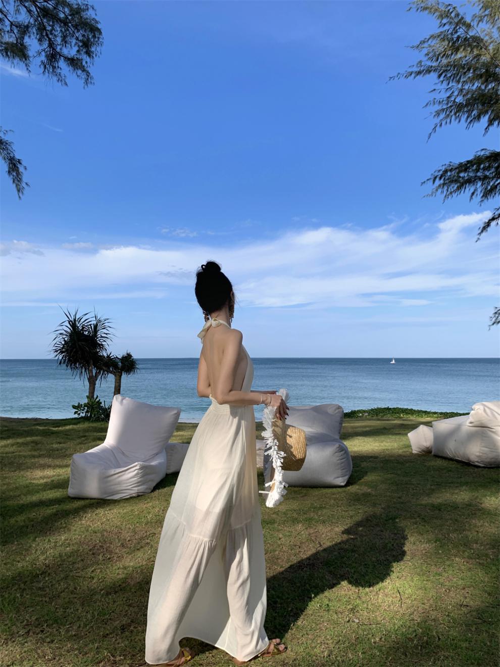 홀리데이 스타일 백리스 스커트 여성 이른 봄 프랑스 스타일 우아한 원피스 해변 원피스 긴 치마