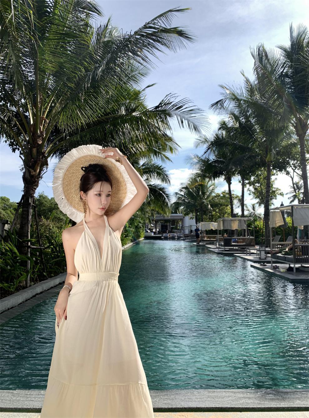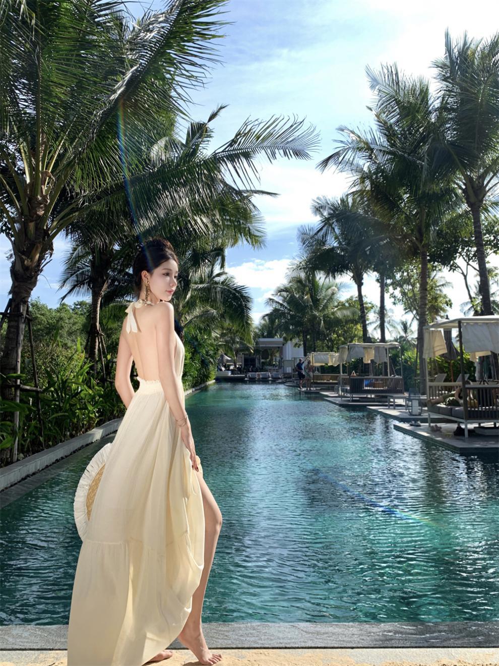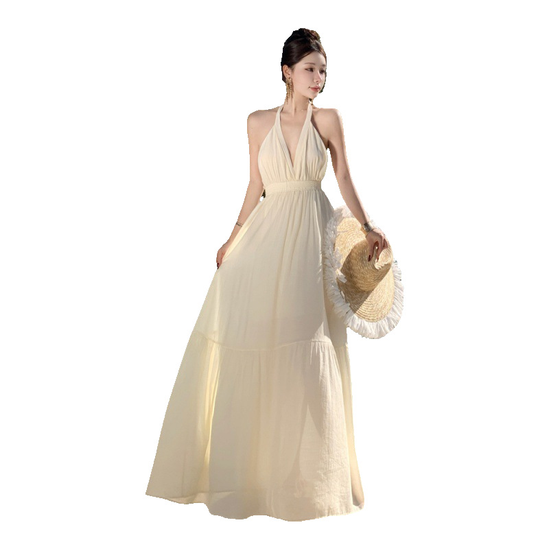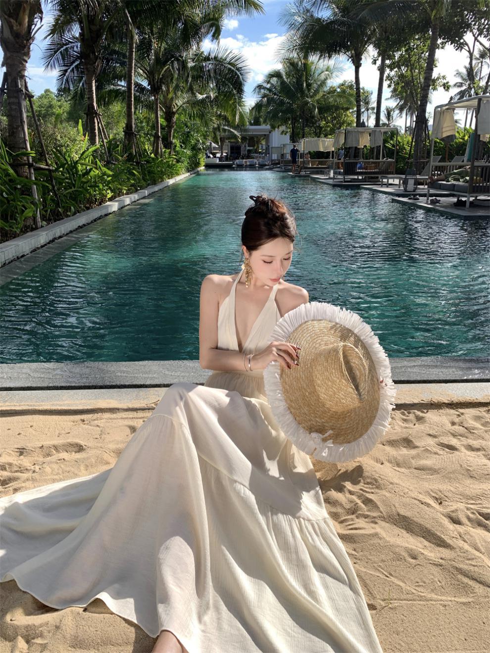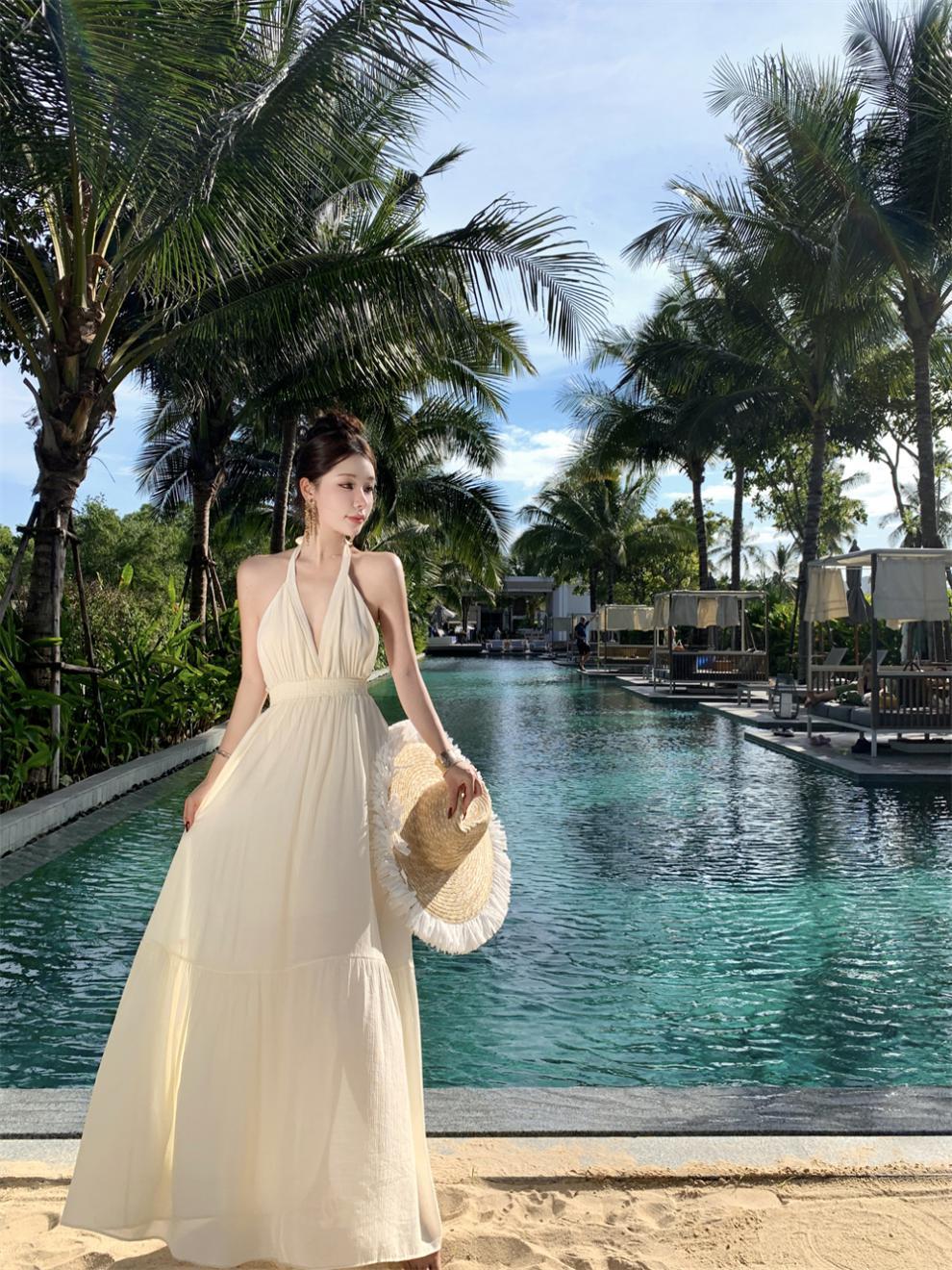 홀리데이 스타일 백리스 스커트 여성 이른 봄 프랑스 스타일 우아한 원피스 해변 원피스 긴 치마