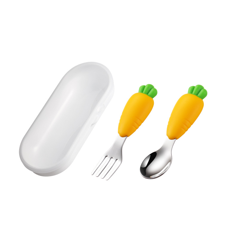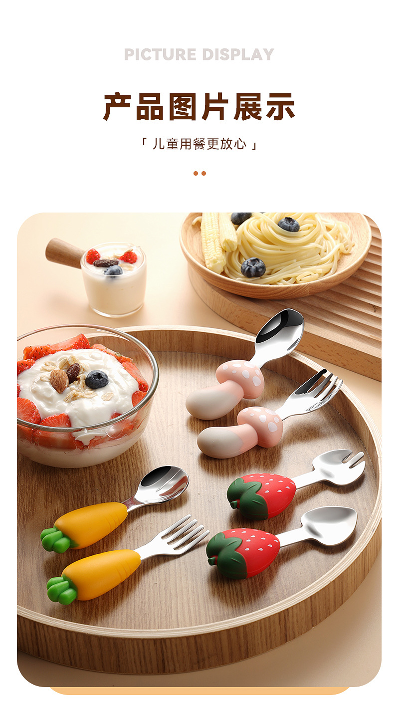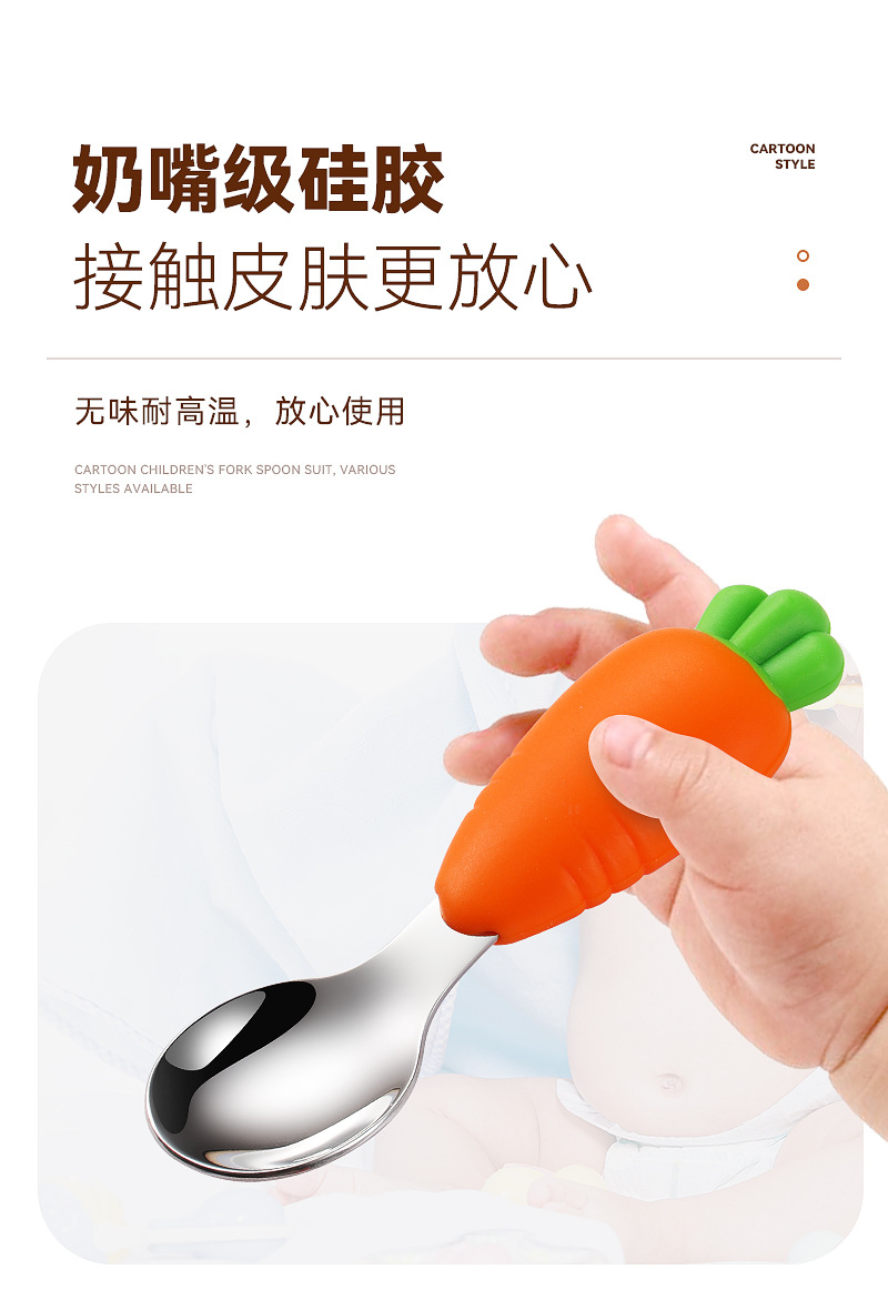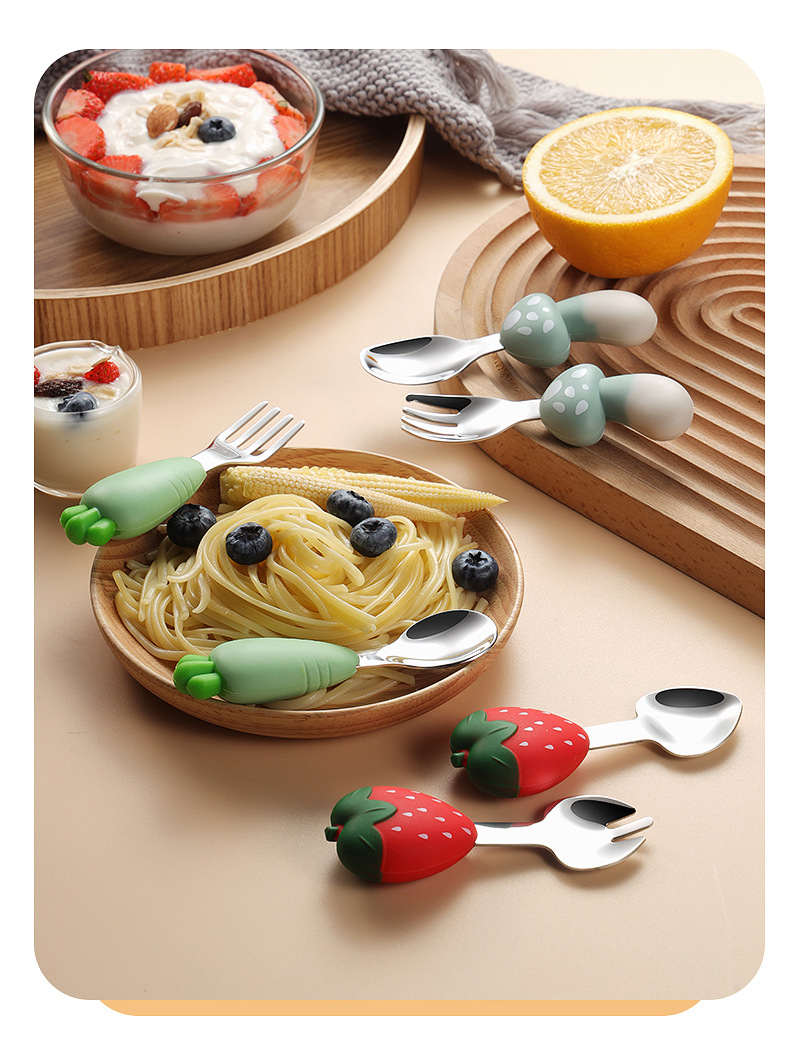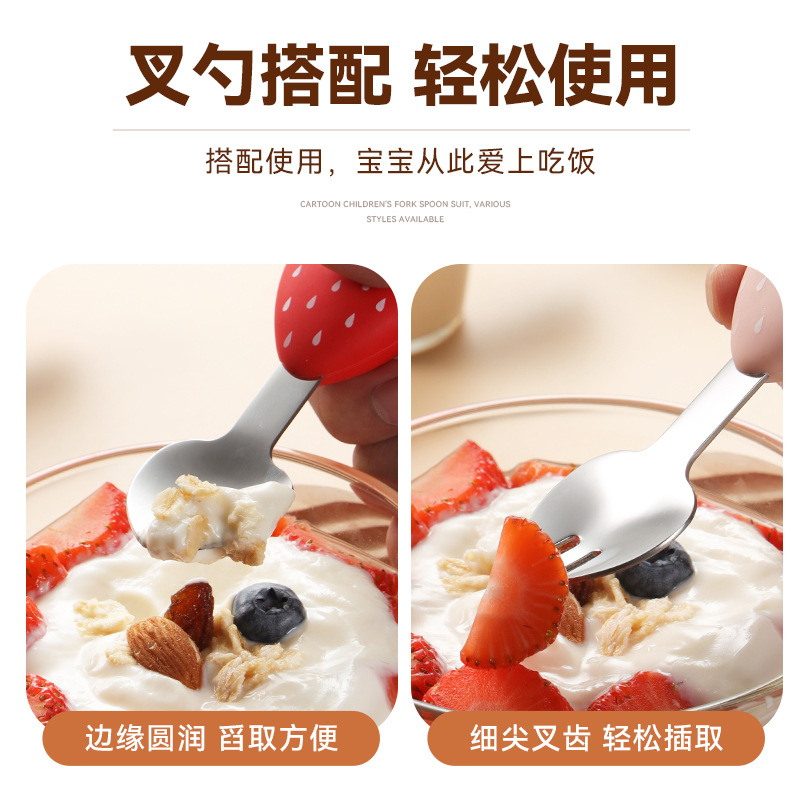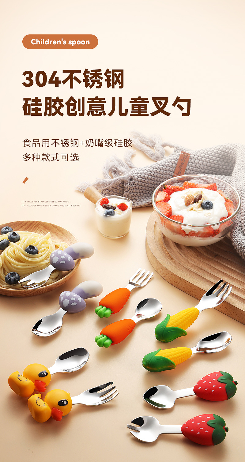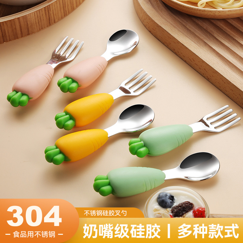 304 스테인레스 스틸 어린이 식기 세트 실리콘 스푼 포크 만화 당근 옥수수 딸기 아기 식기