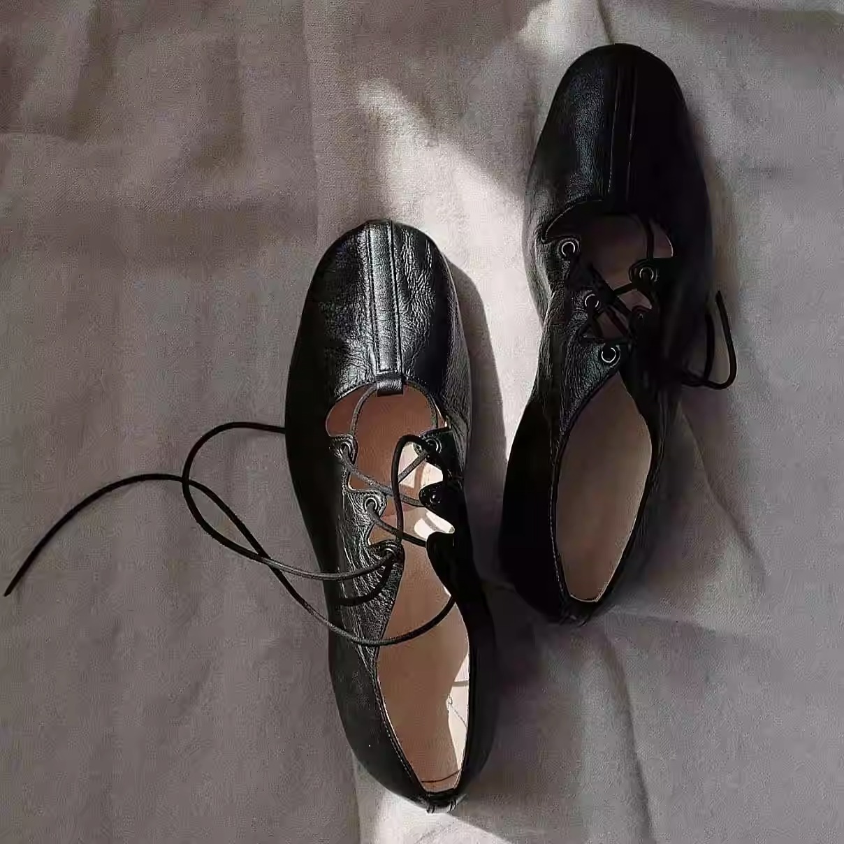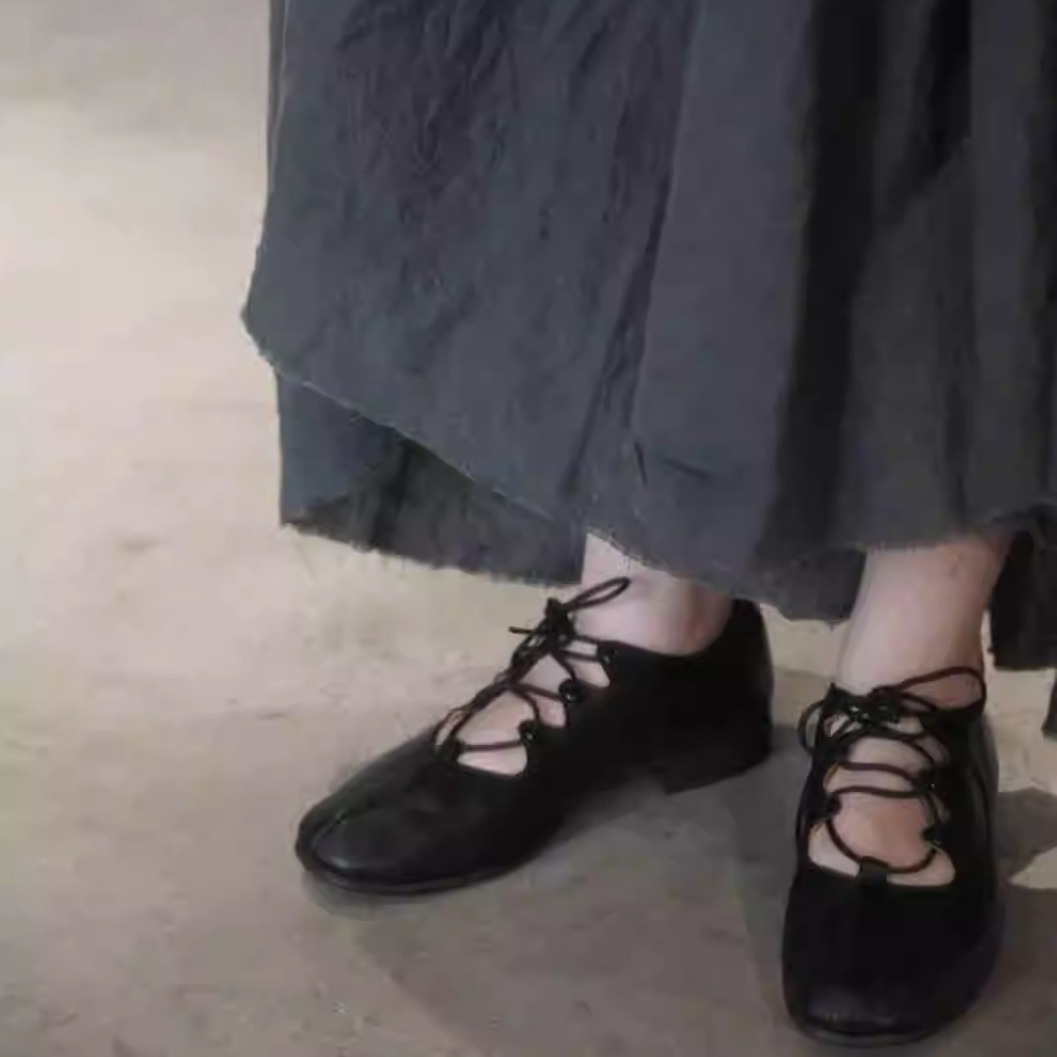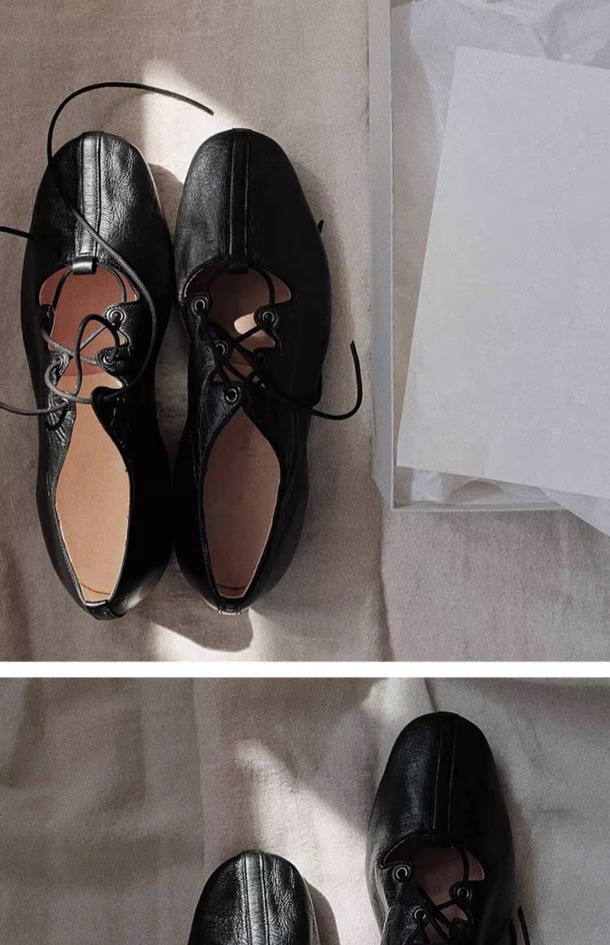 발레 슈즈 여성의 2023 봄과 가을 새로운 작은 가죽 신발 둥근 발가락 레이스 업 할로우 신발 얕은 입 플랫 메리 제인 신발