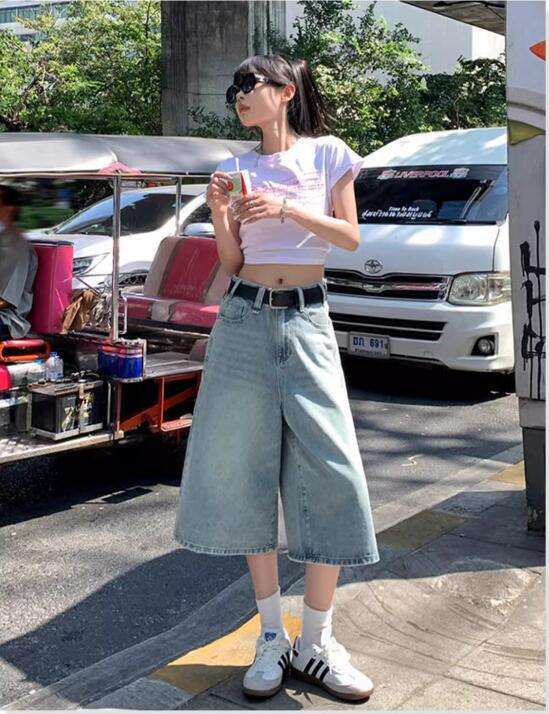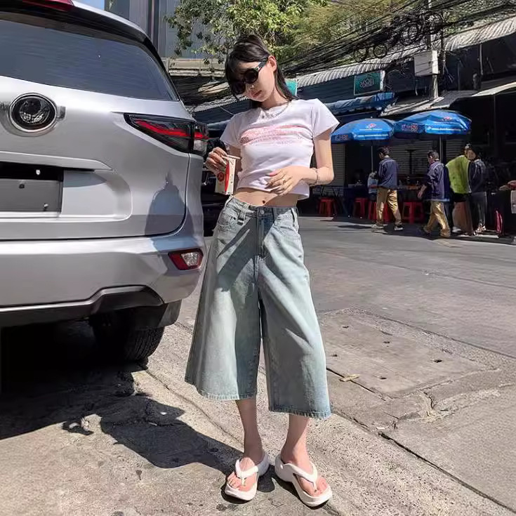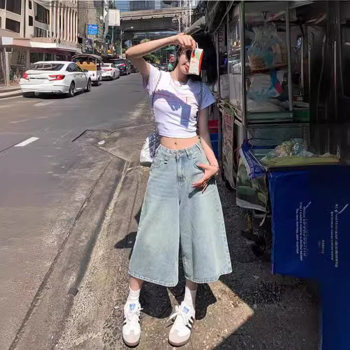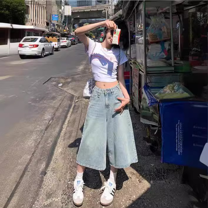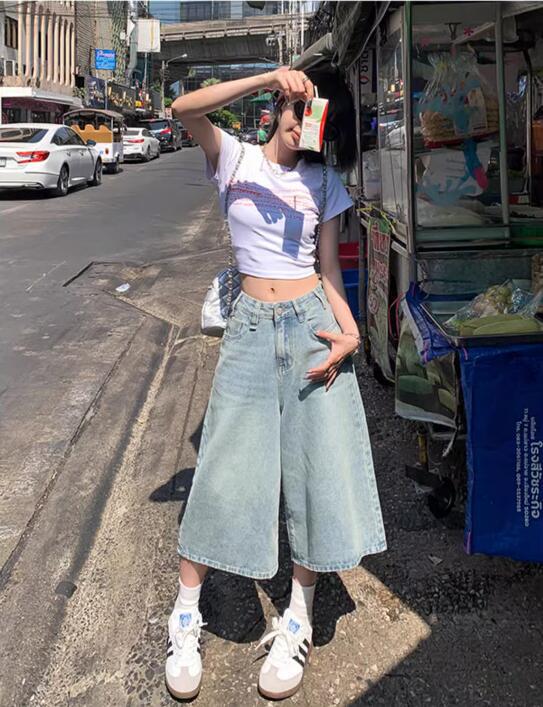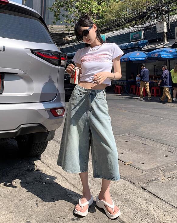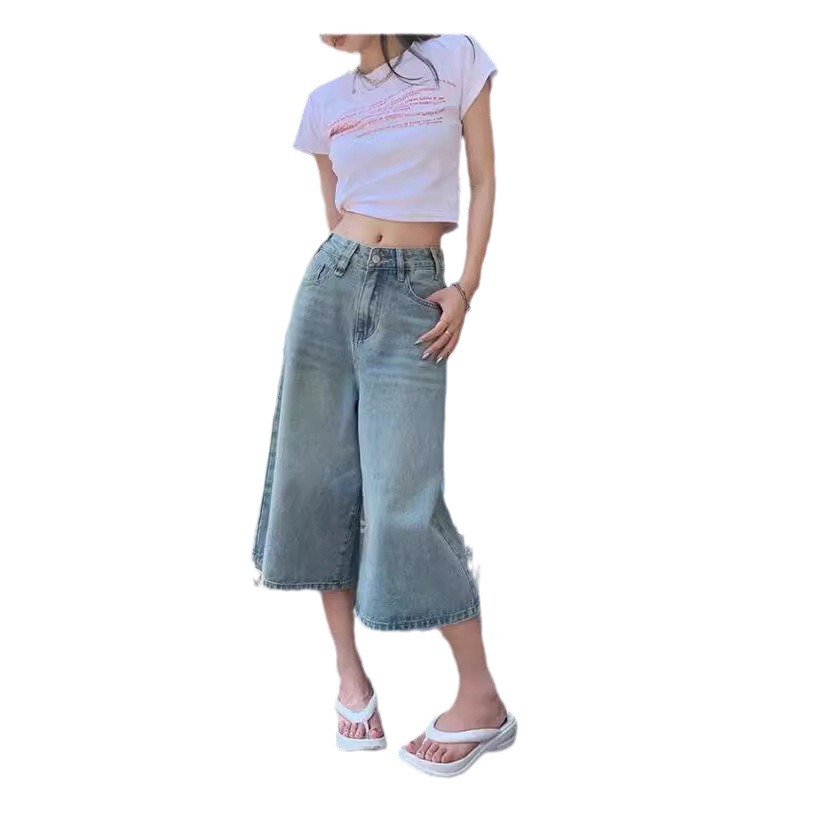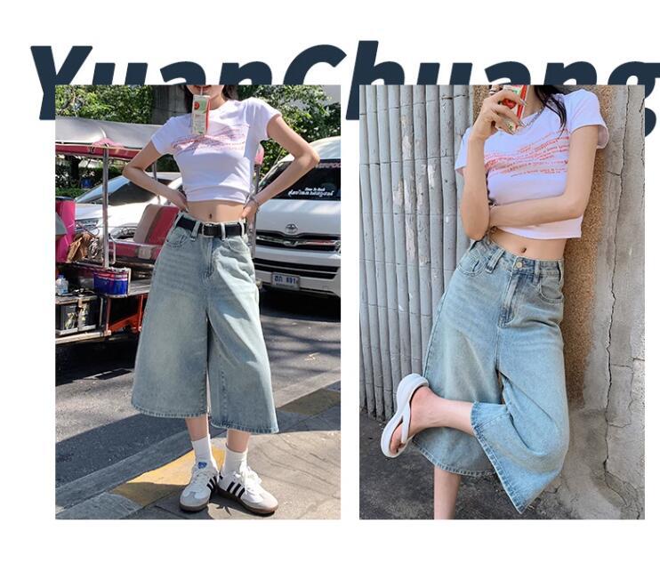 여름 청바지 신상 레트로 워싱 디스트레스드 7부 데님 팬츠 하이웨이스트 루즈핏 와이드 팬츠 여성 유니섹스 스타일
