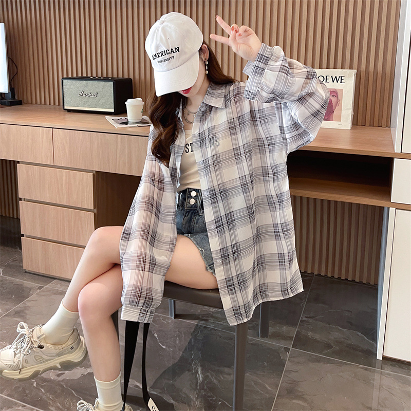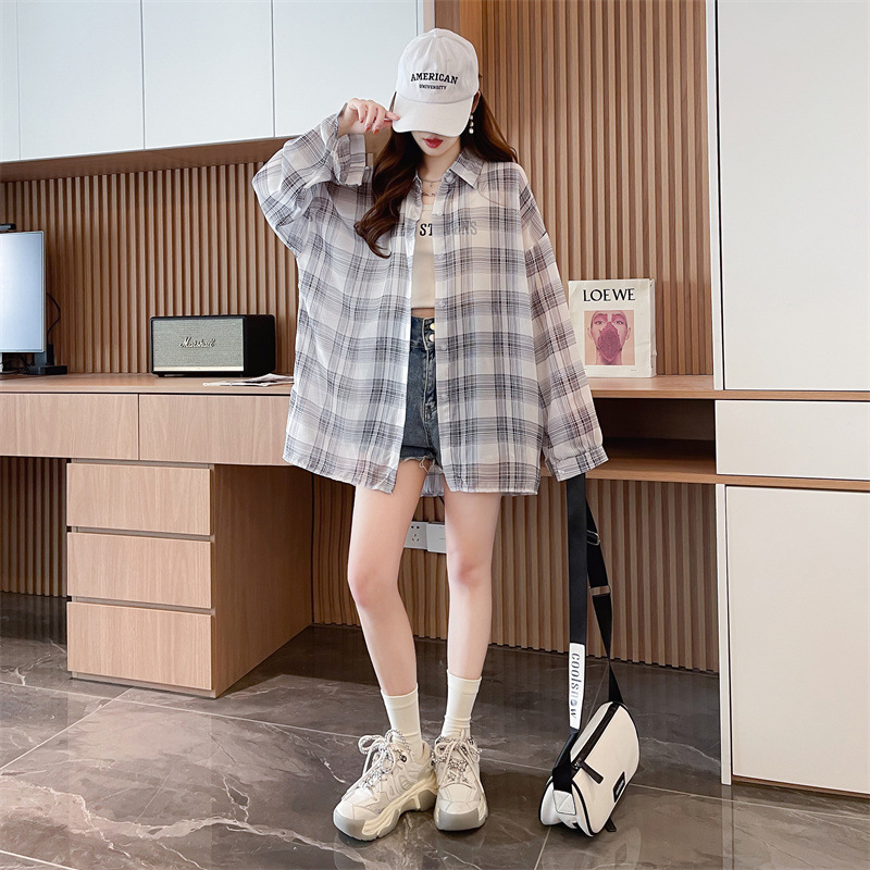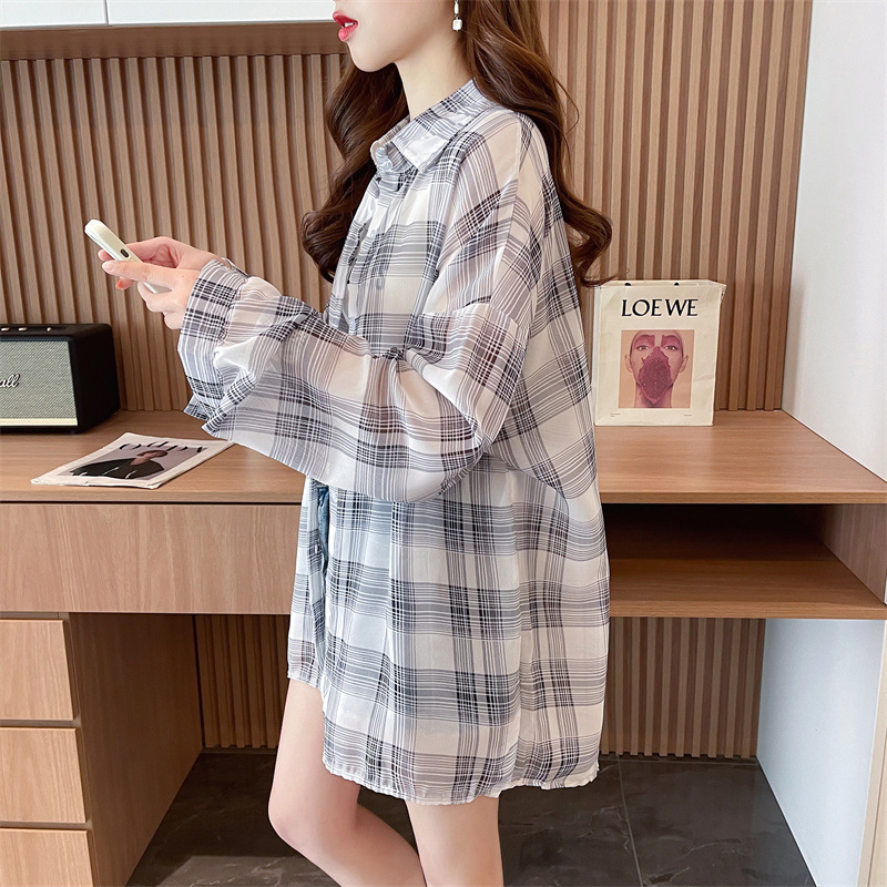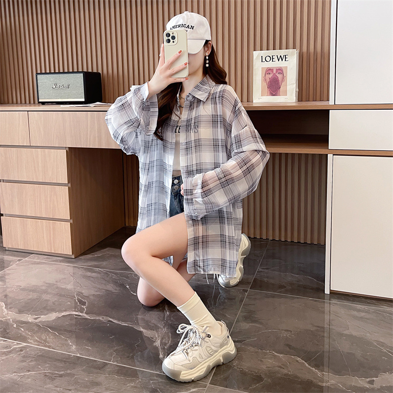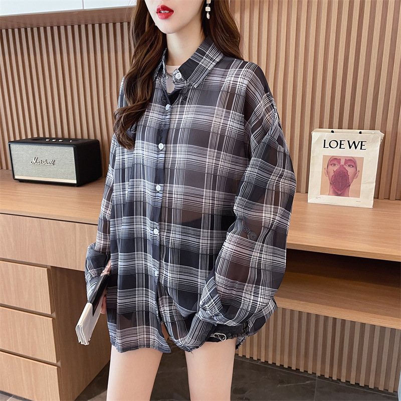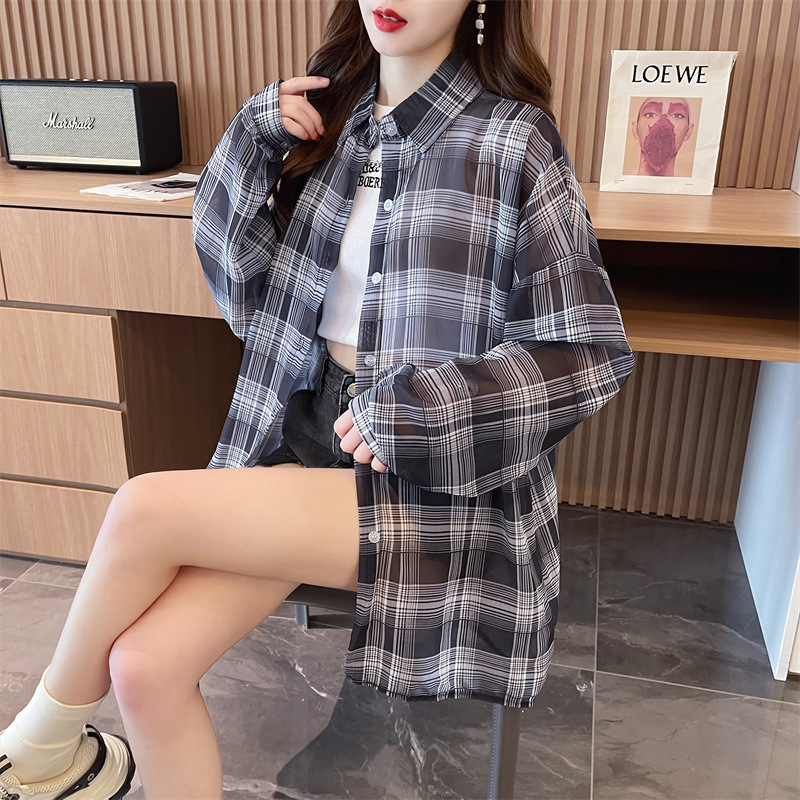캐주얼 다목적 격자 무늬 쉬폰 셔츠 재킷 여성의 새로운 여름 서양 스타일 디자인 센스 선 스크린 얇은 탑 옷