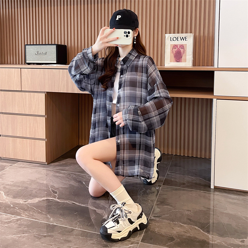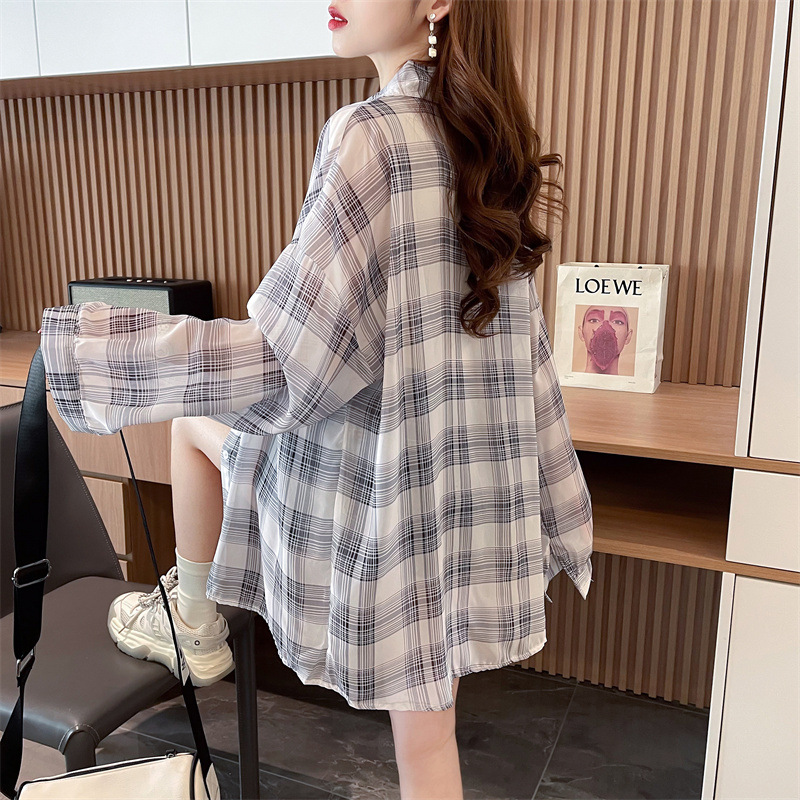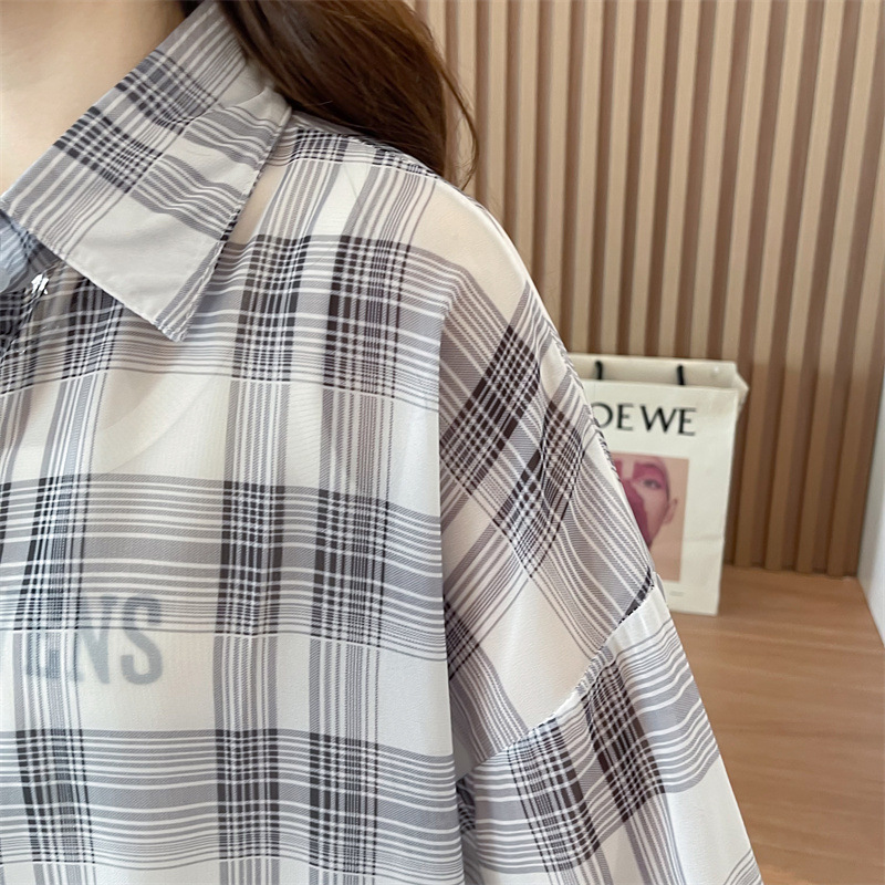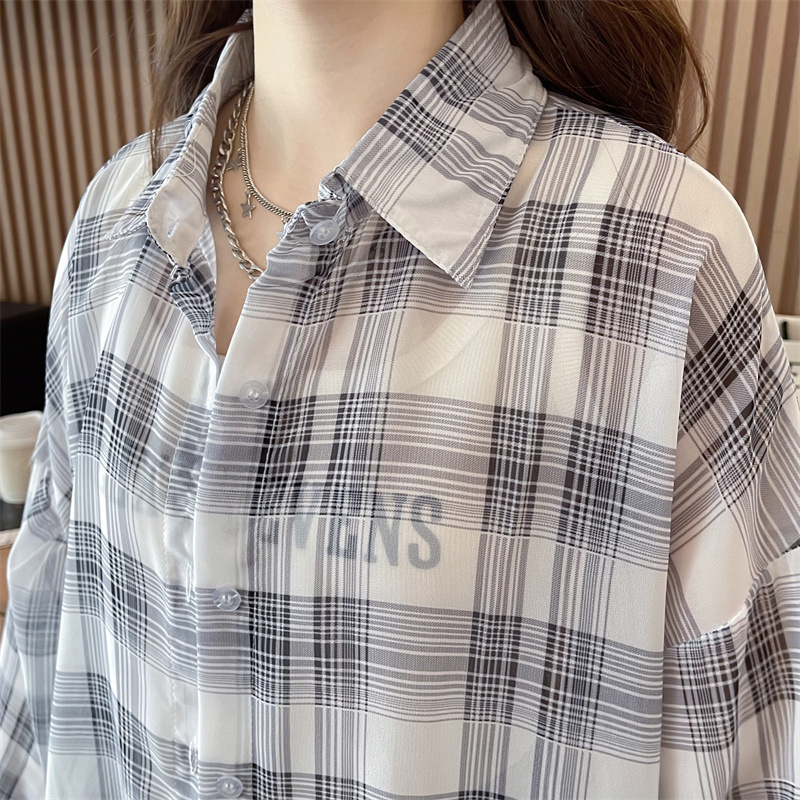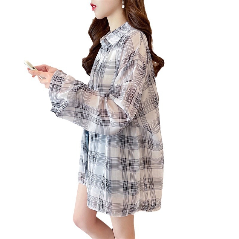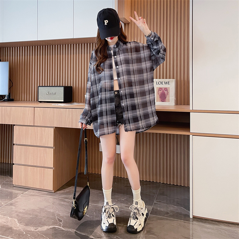 캐주얼 다목적 격자 무늬 쉬폰 셔츠 재킷 여성의 새로운 여름 서양 스타일 디자인 센스 선 스크린 얇은 탑 옷