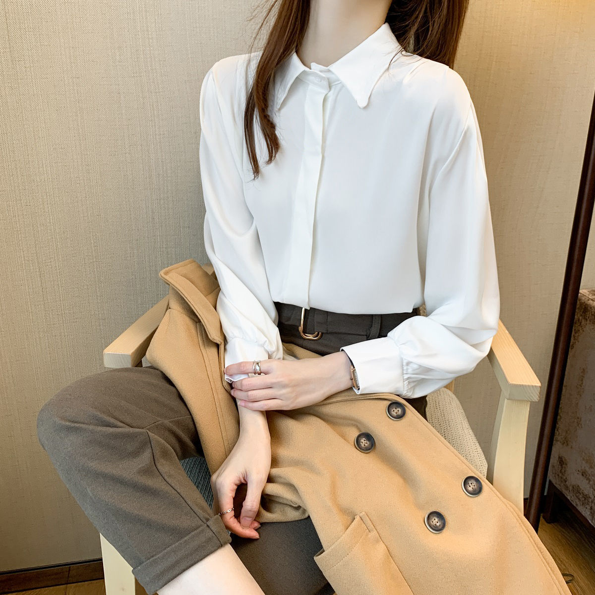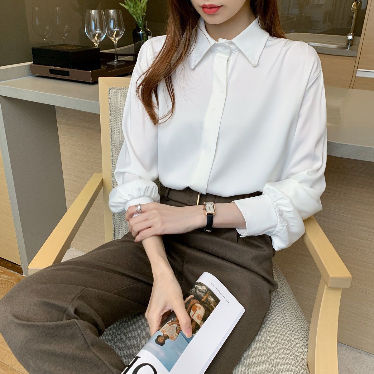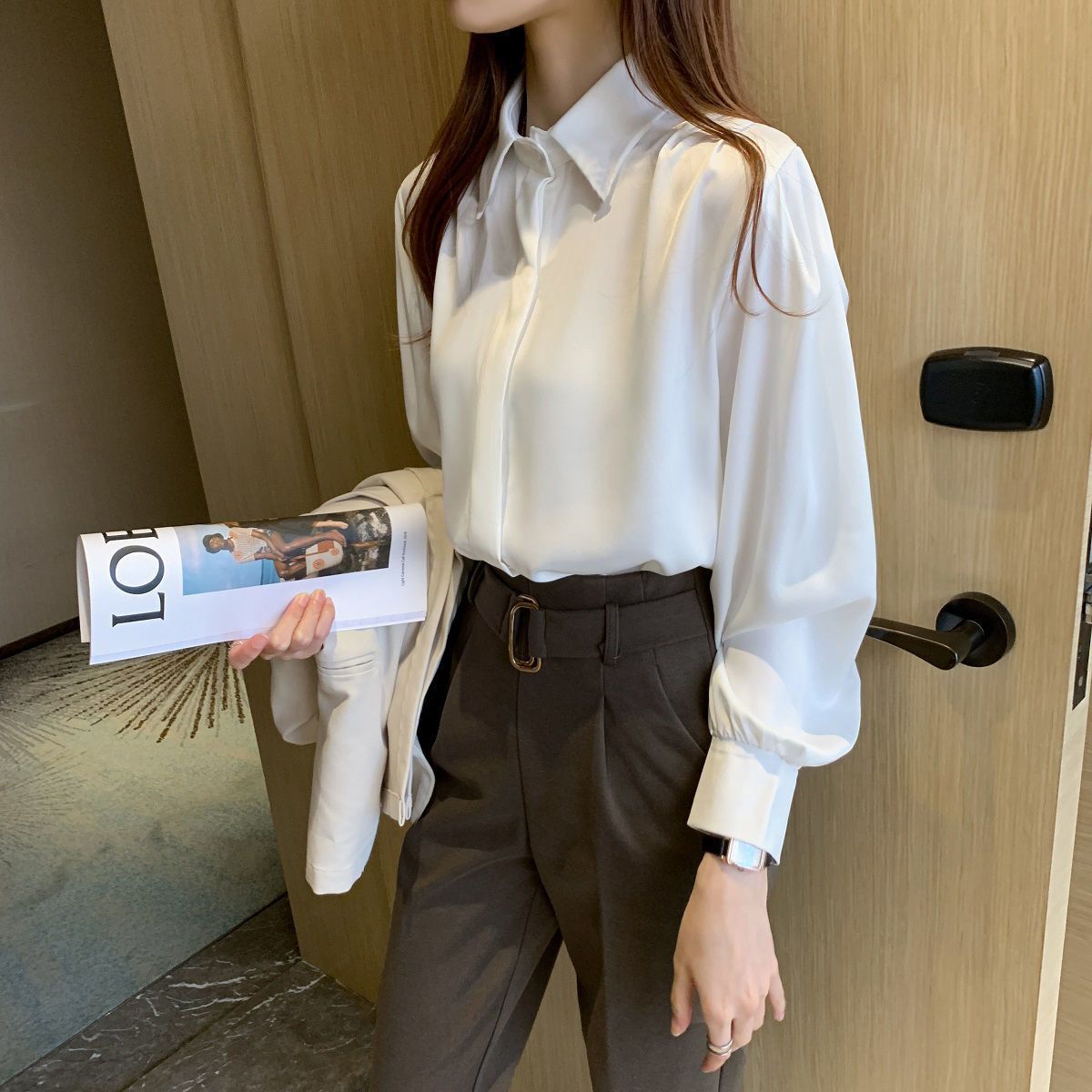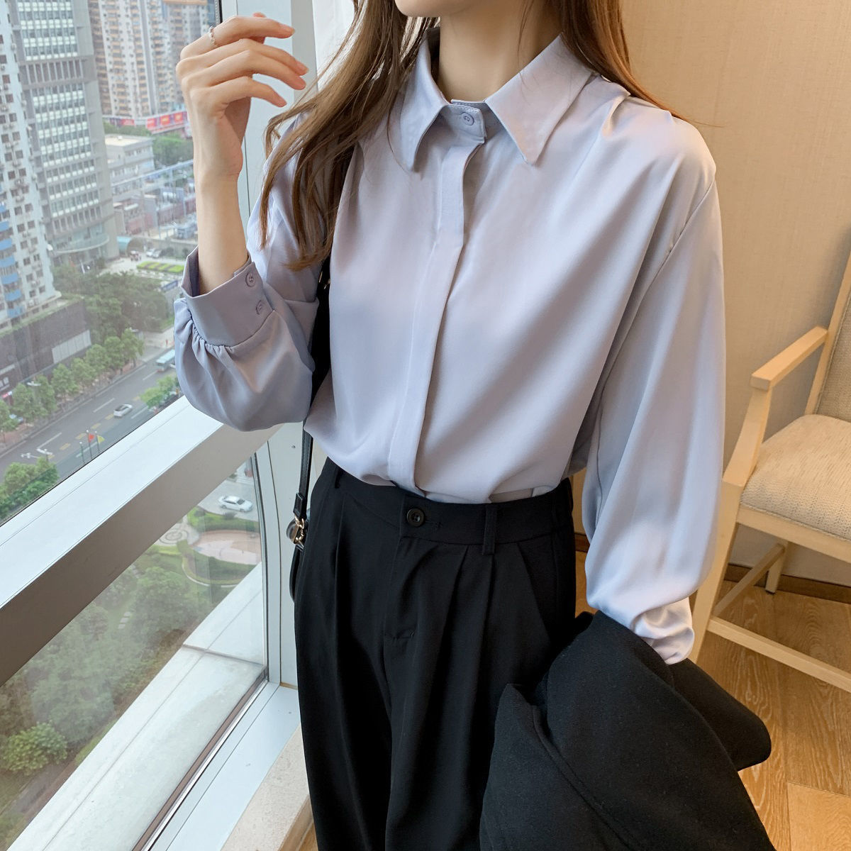 화이트 쉬폰 셔츠 2024 신작 한국식 슬림핏 긴팔 올매치 톱 전문직 여성복베이스 셔츠