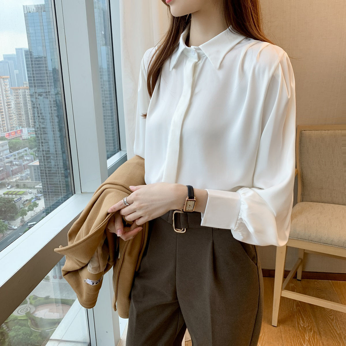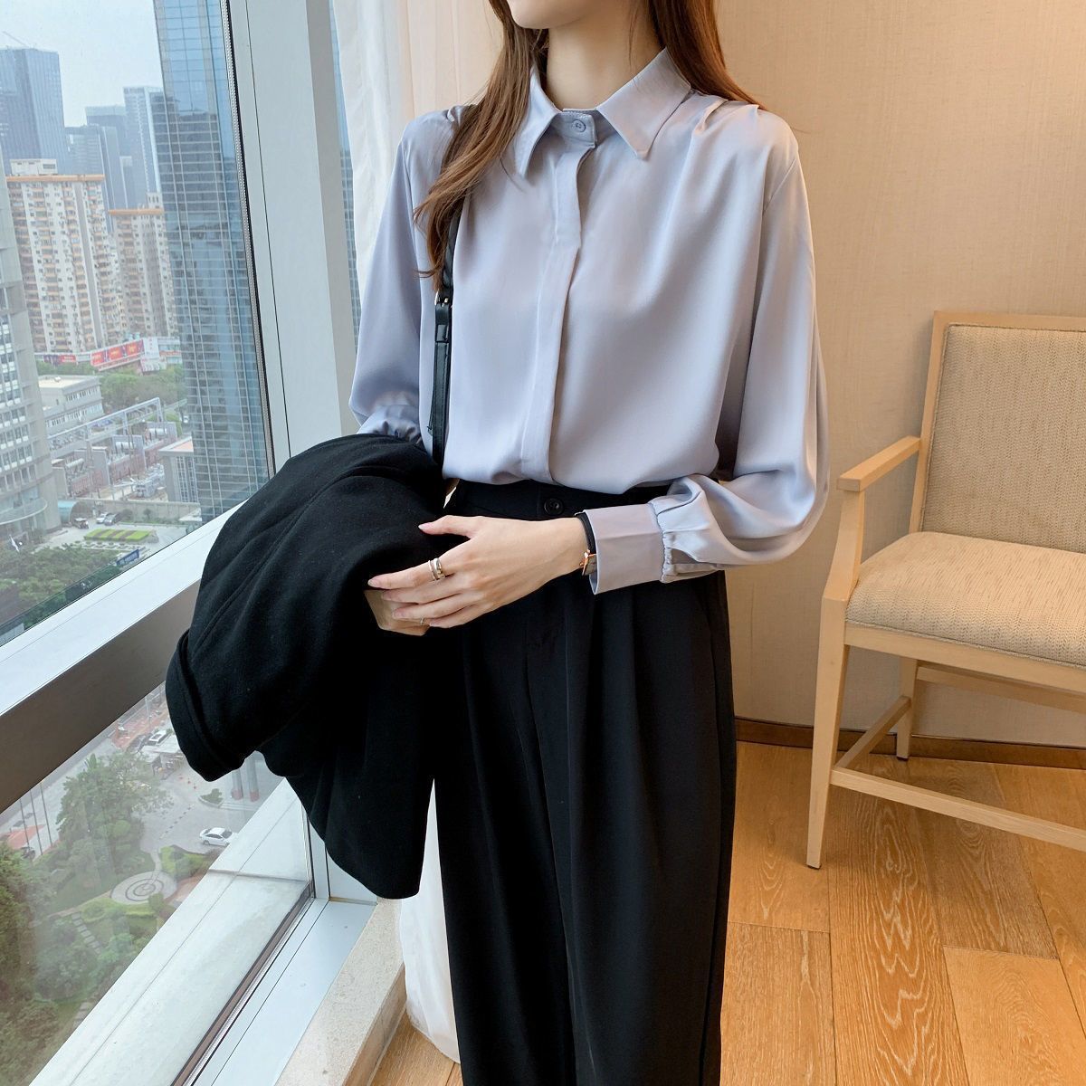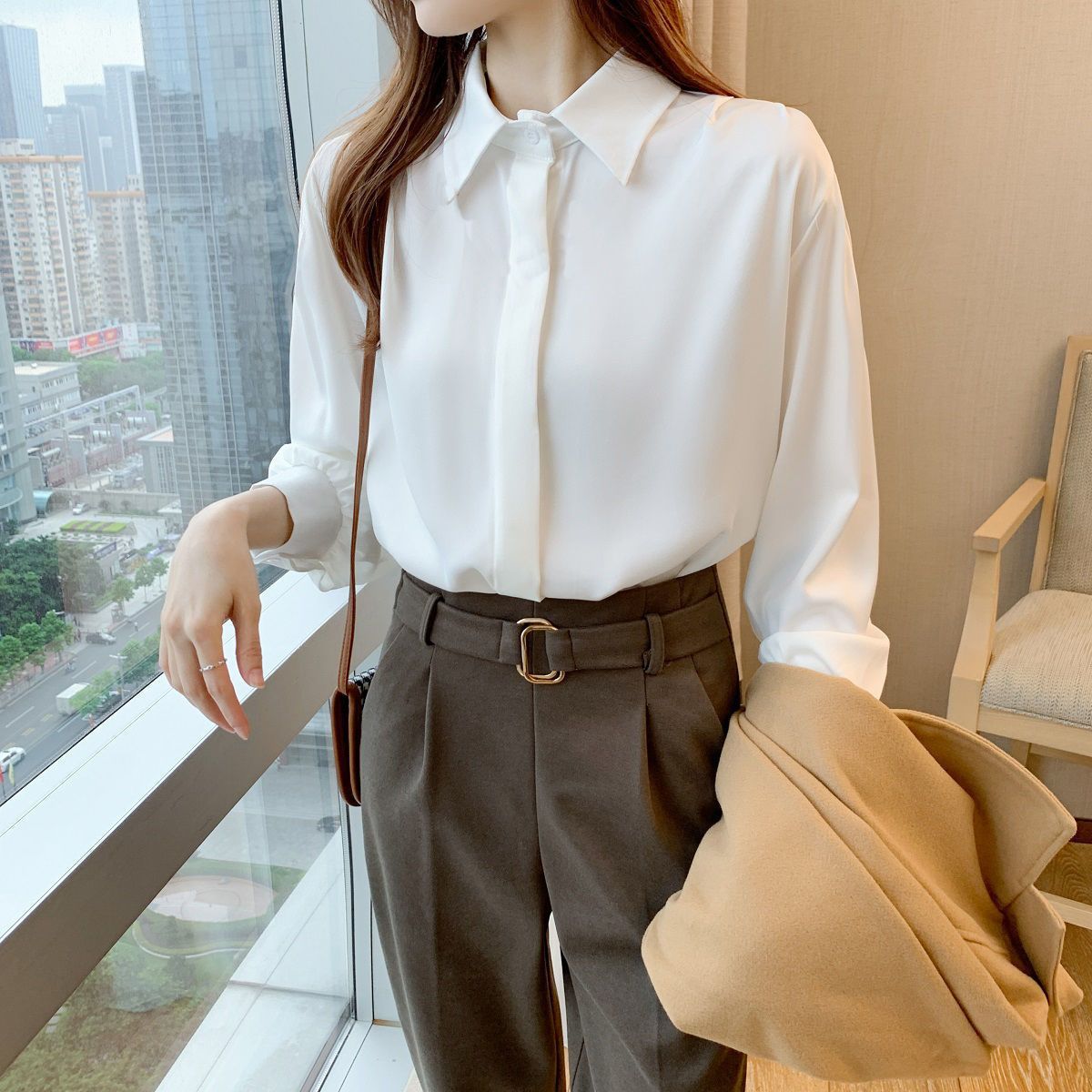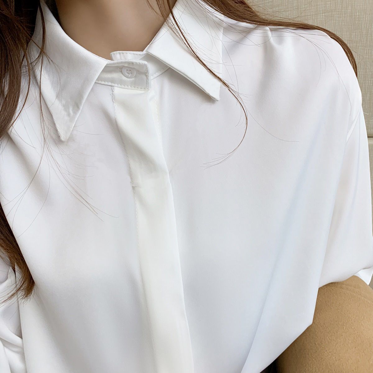 화이트 쉬폰 셔츠 2024 신작 한국식 슬림핏 긴팔 올매치 톱 전문직 여성복베이스 셔츠