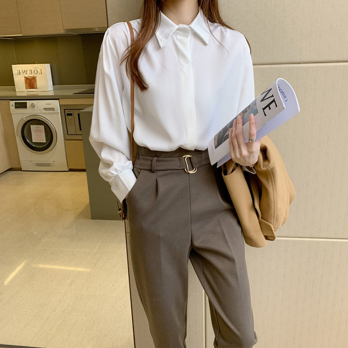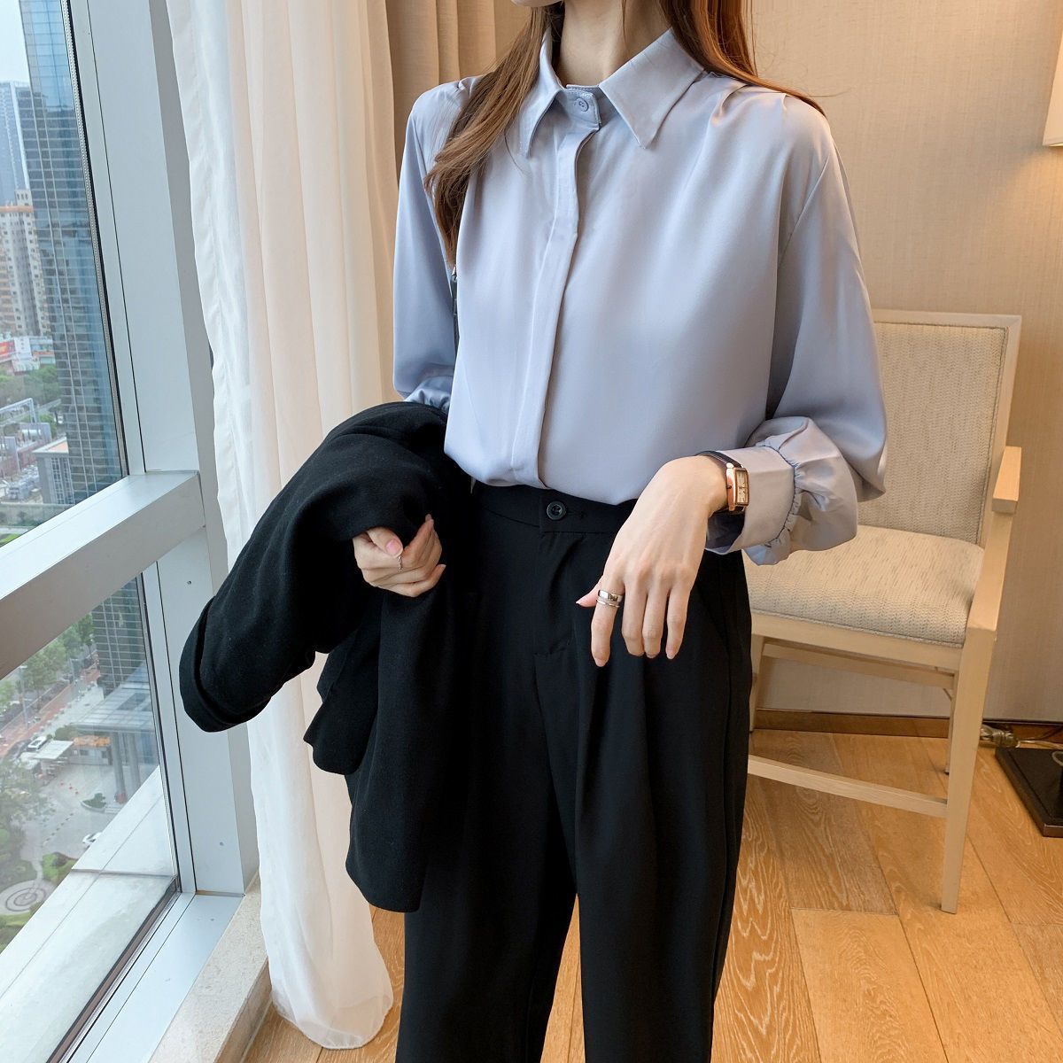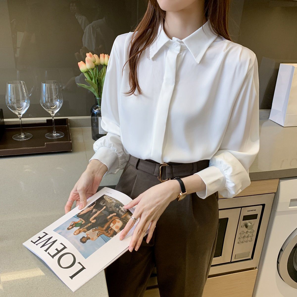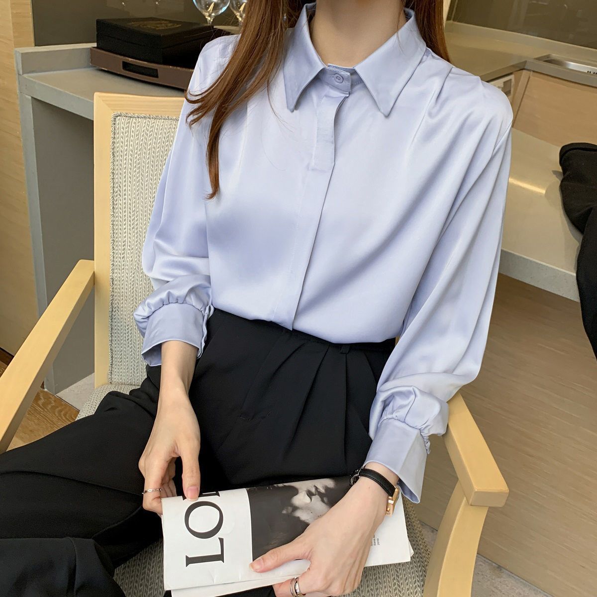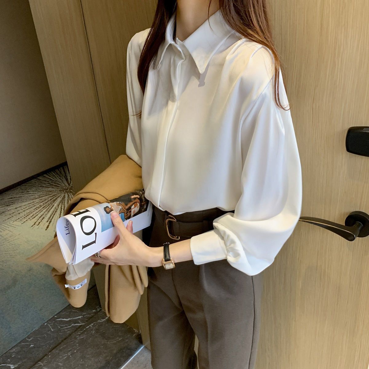 화이트 쉬폰 셔츠 2024 신작 한국식 슬림핏 긴팔 올매치 톱 전문직 여성복베이스 셔츠