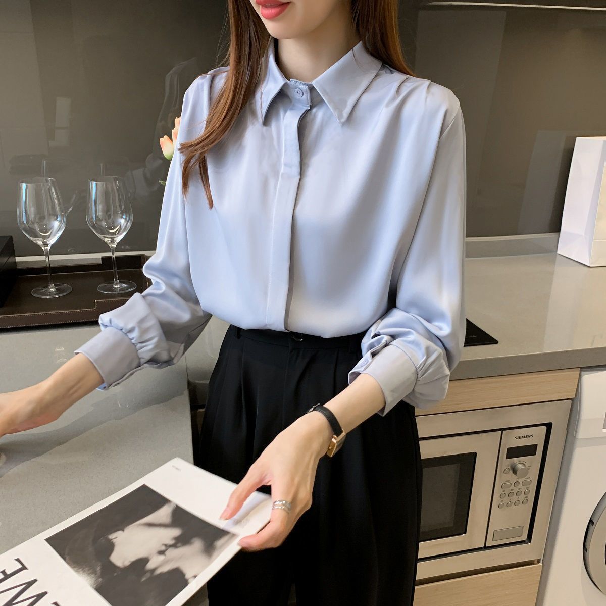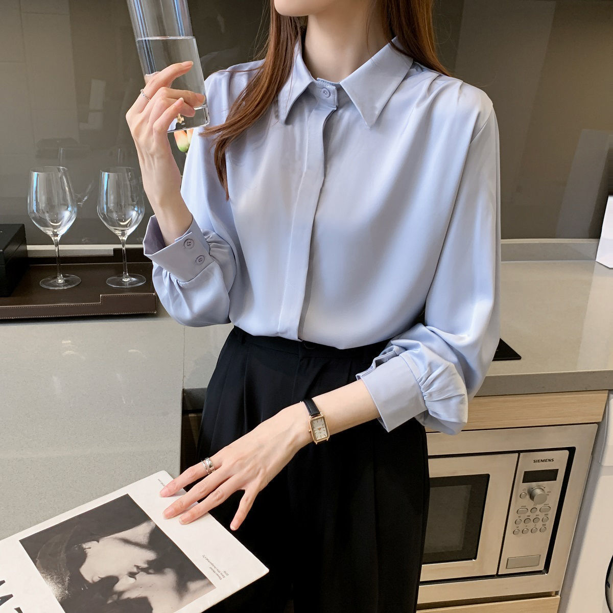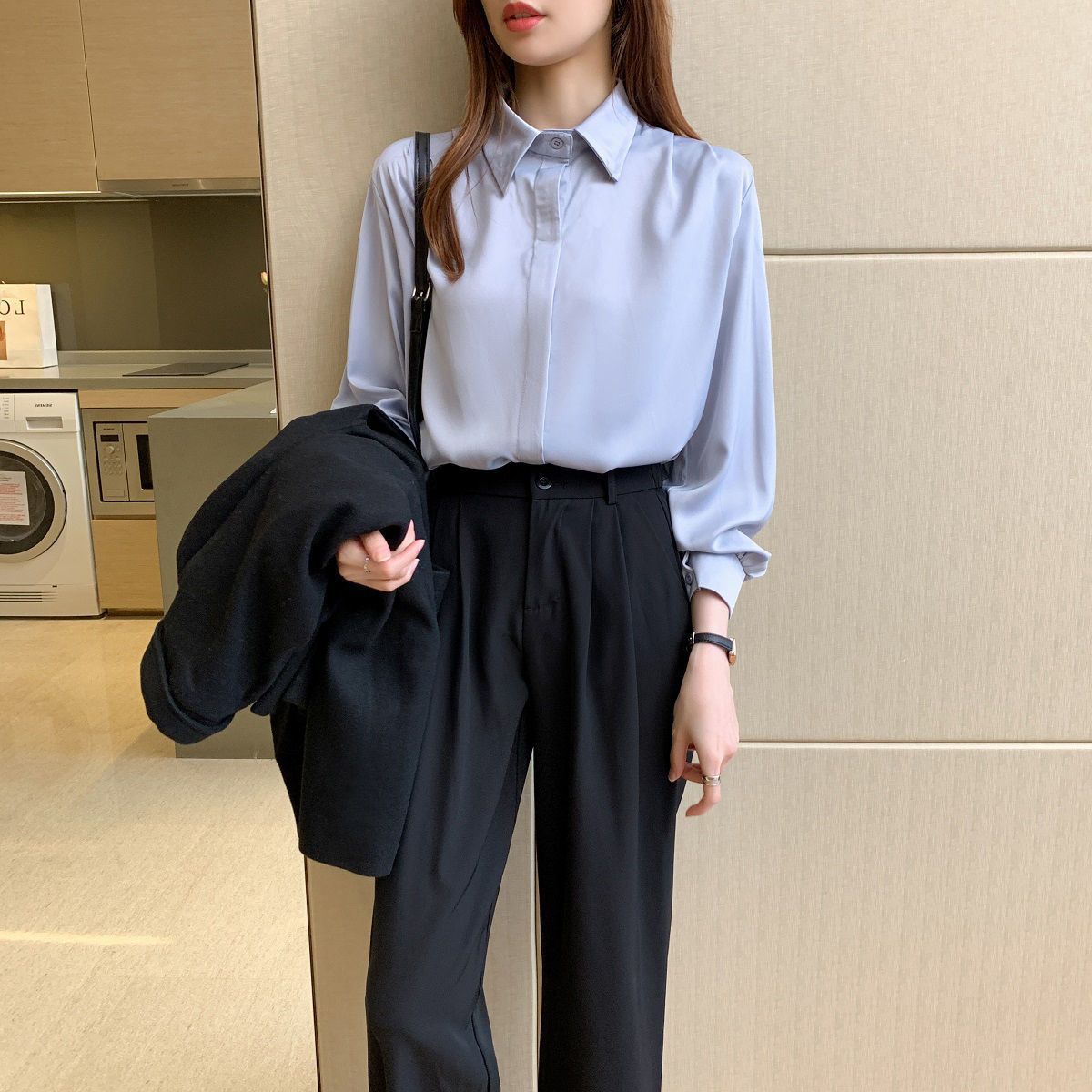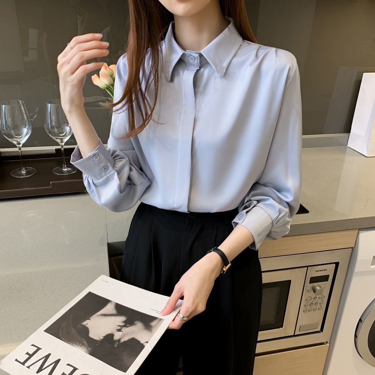 화이트 쉬폰 셔츠 2024 신작 한국식 슬림핏 긴팔 올매치 톱 전문직 여성복베이스 셔츠