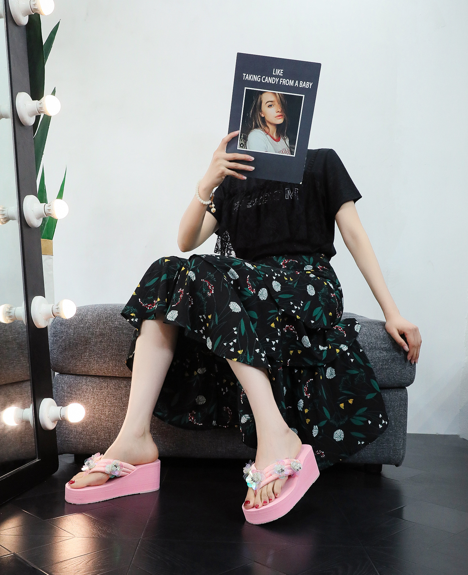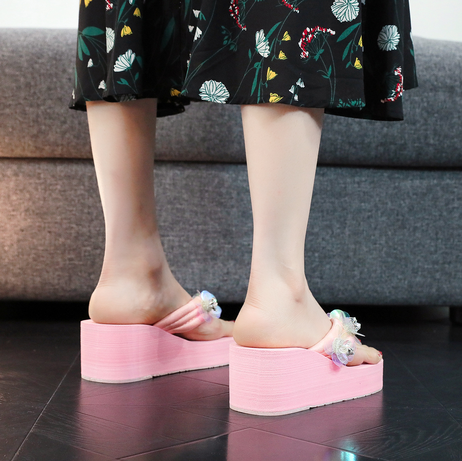 여성용 여름 패션 슬리퍼, 새로운 스타일의 웨지힐 두꺼운 밑창 플립플랍, 해변 꽃무늬 비치 슬리퍼