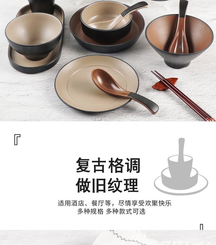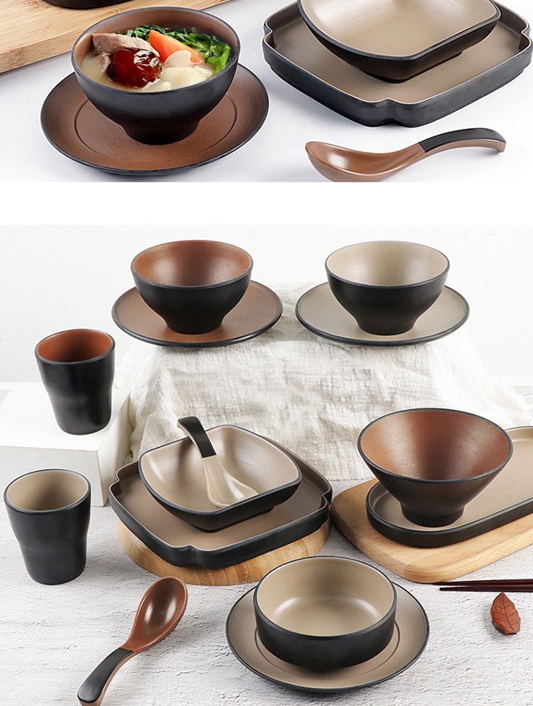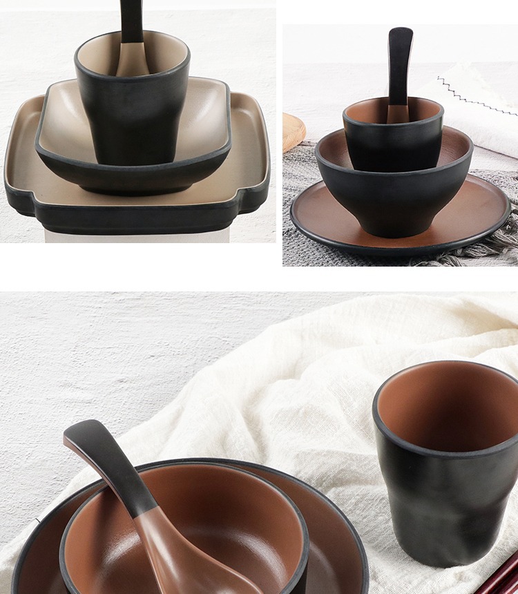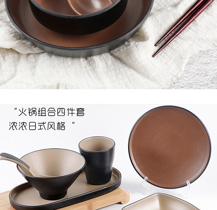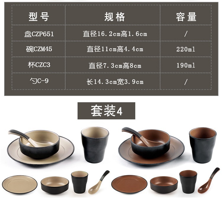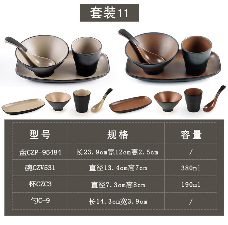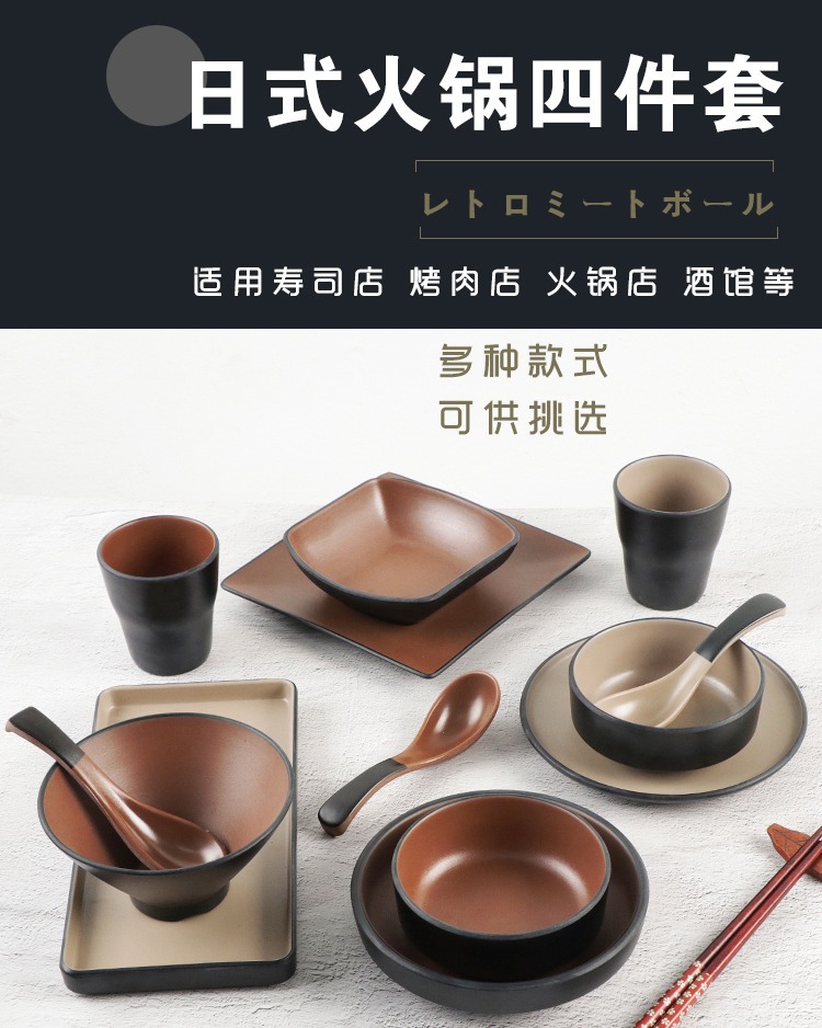 레트로 일본식 4 피스 세트 레스토랑 핫팟 식기 멜라민 모방 도자기 플레이트 보울 컵 스푼 세트 상업