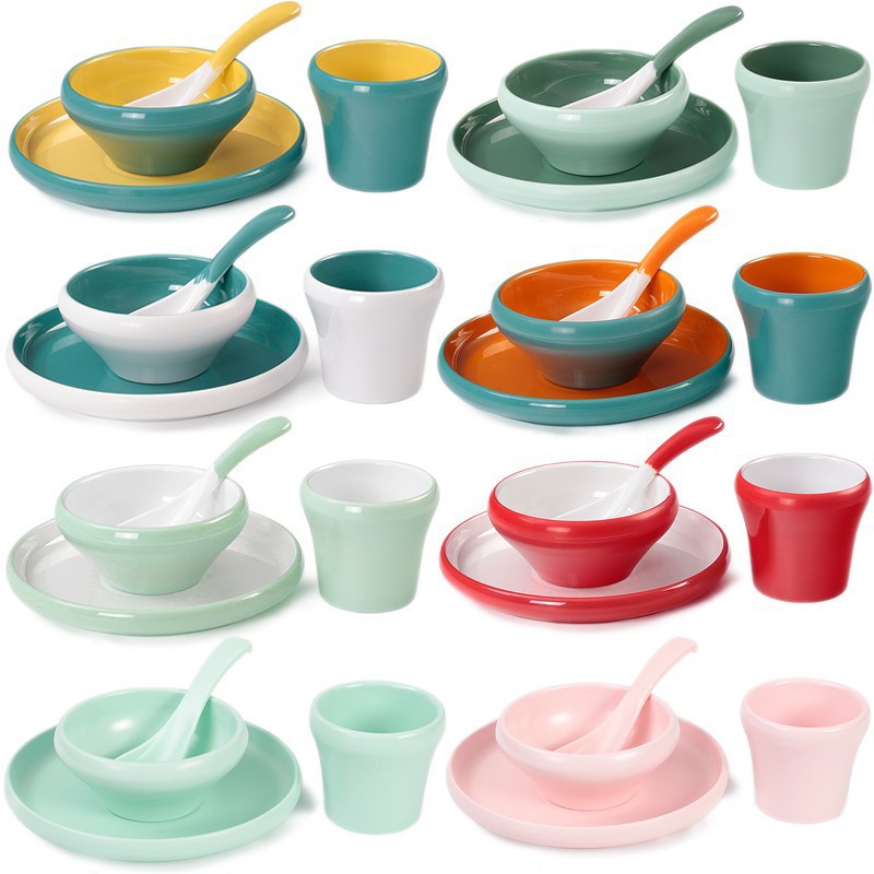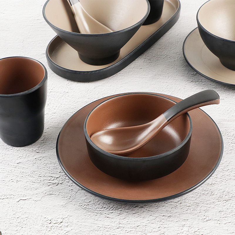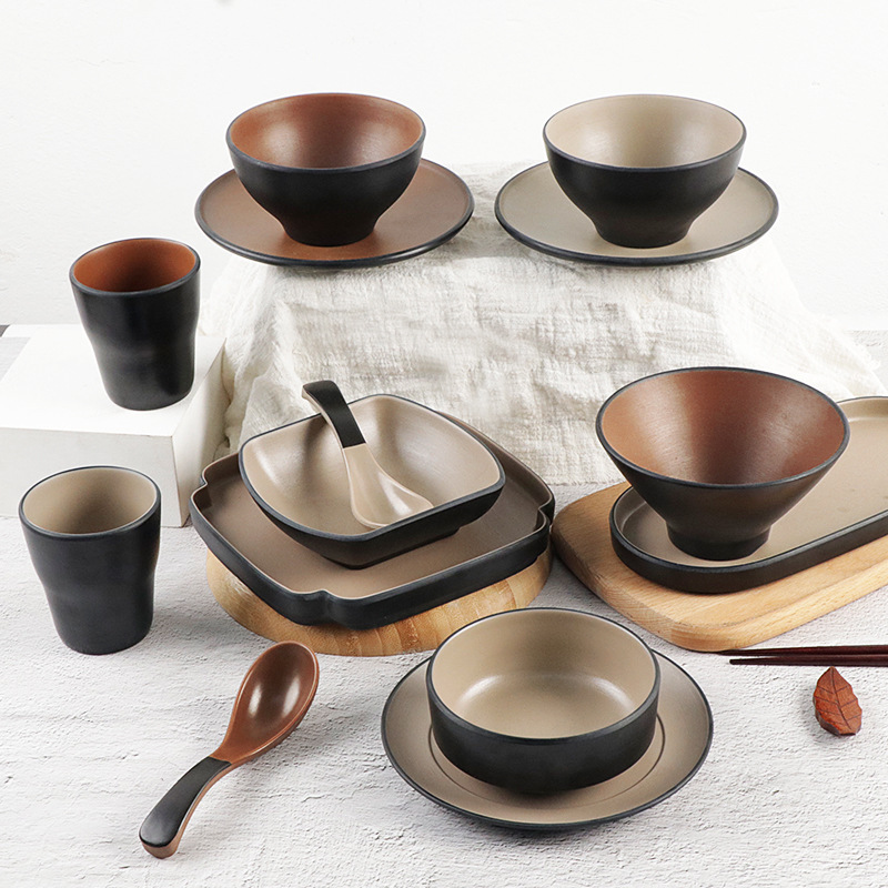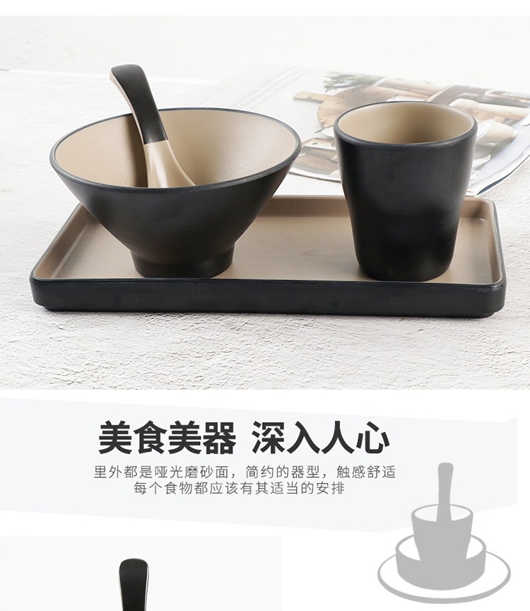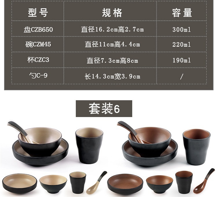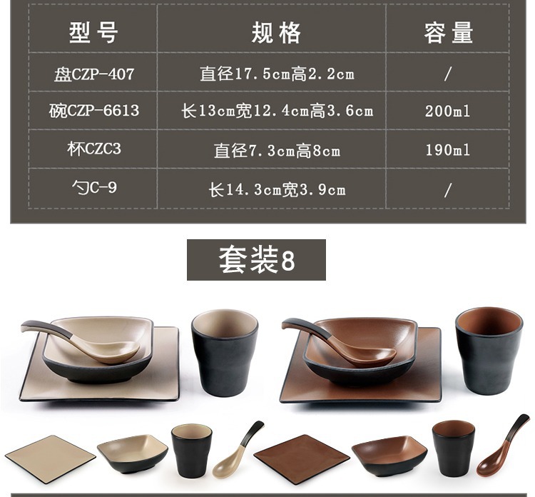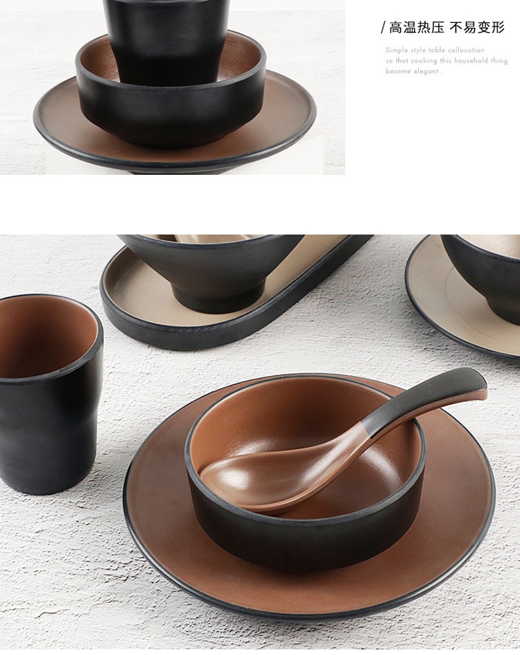 레트로 일본식 4 피스 세트 레스토랑 핫팟 식기 멜라민 모방 도자기 플레이트 보울 컵 스푼 세트 상업