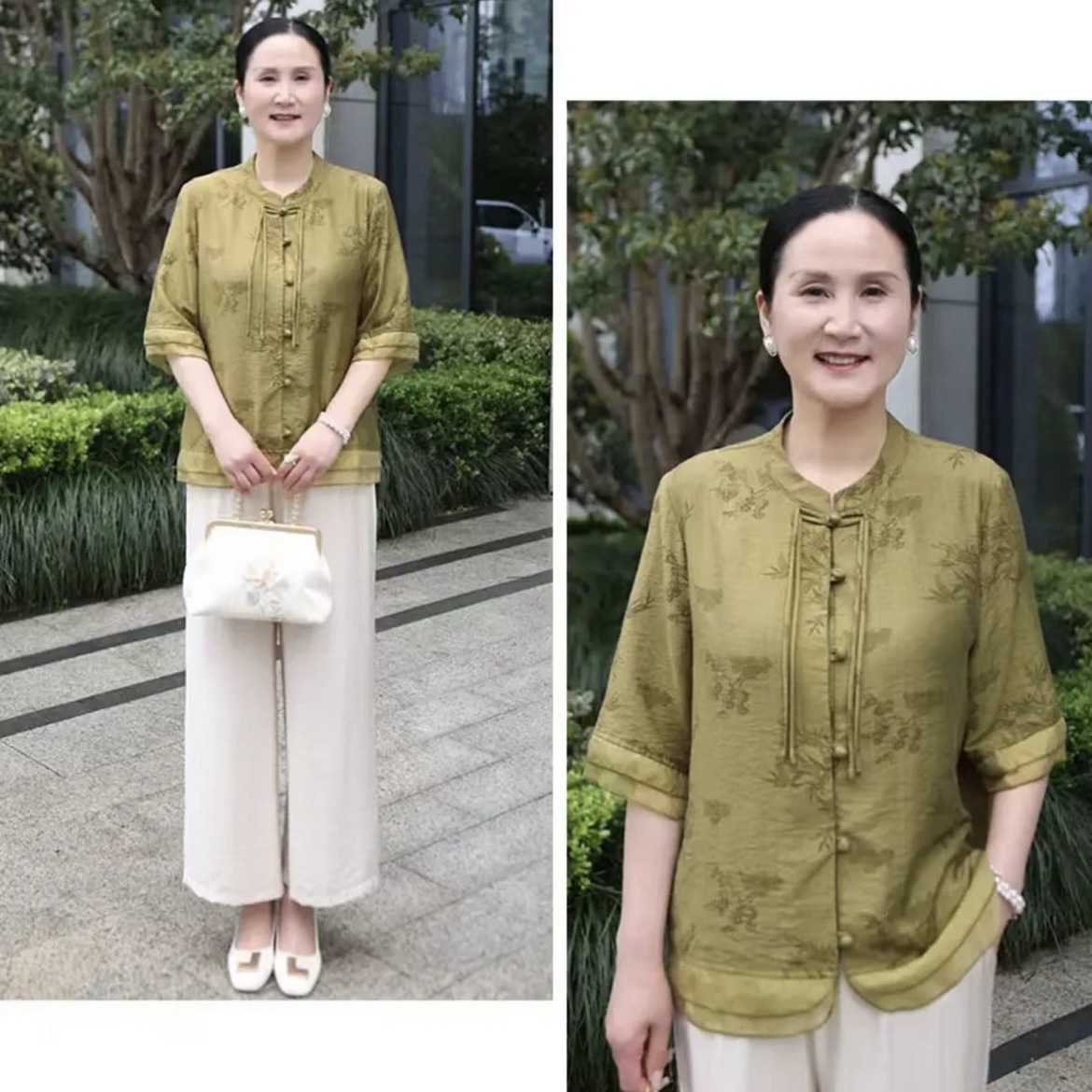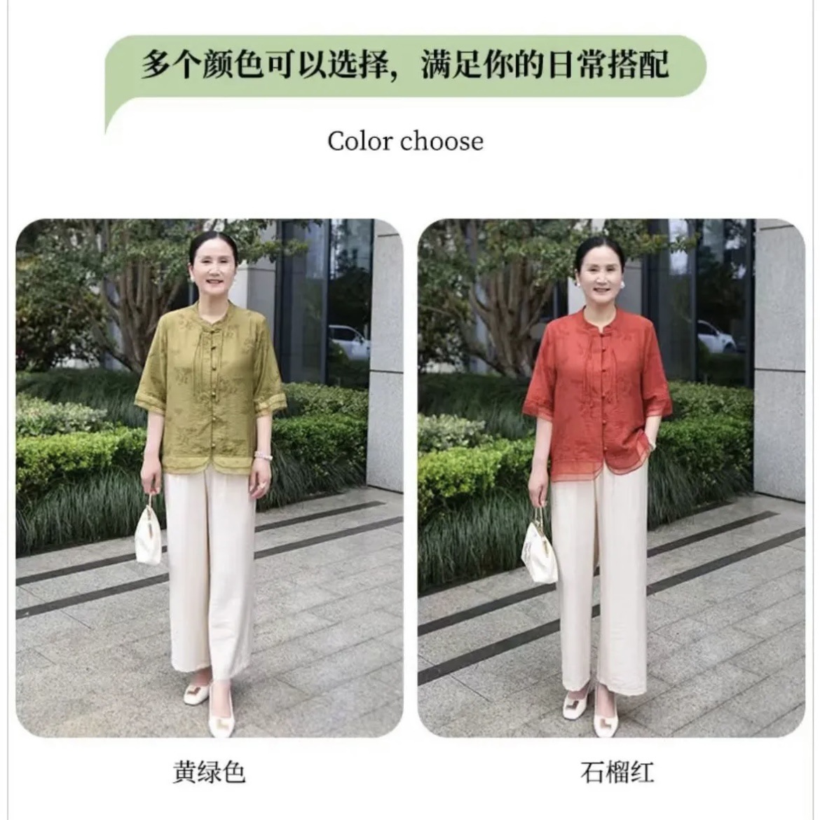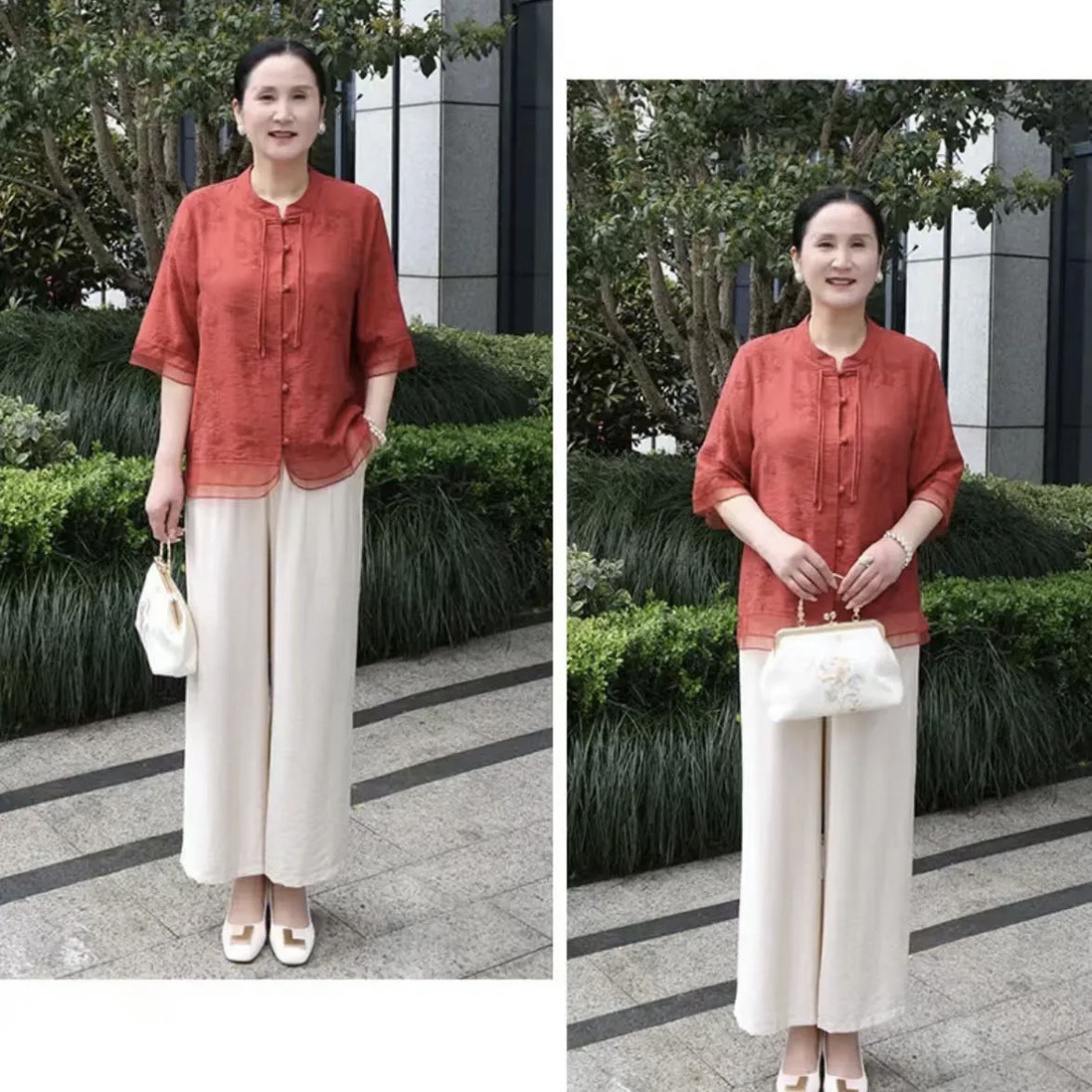 중년 어머니 새로운 중국 짧은 소매 국가 스타일 세트 2024 새로운 어머니 여름 소매 셔츠면 및 린넨 투피스 세트