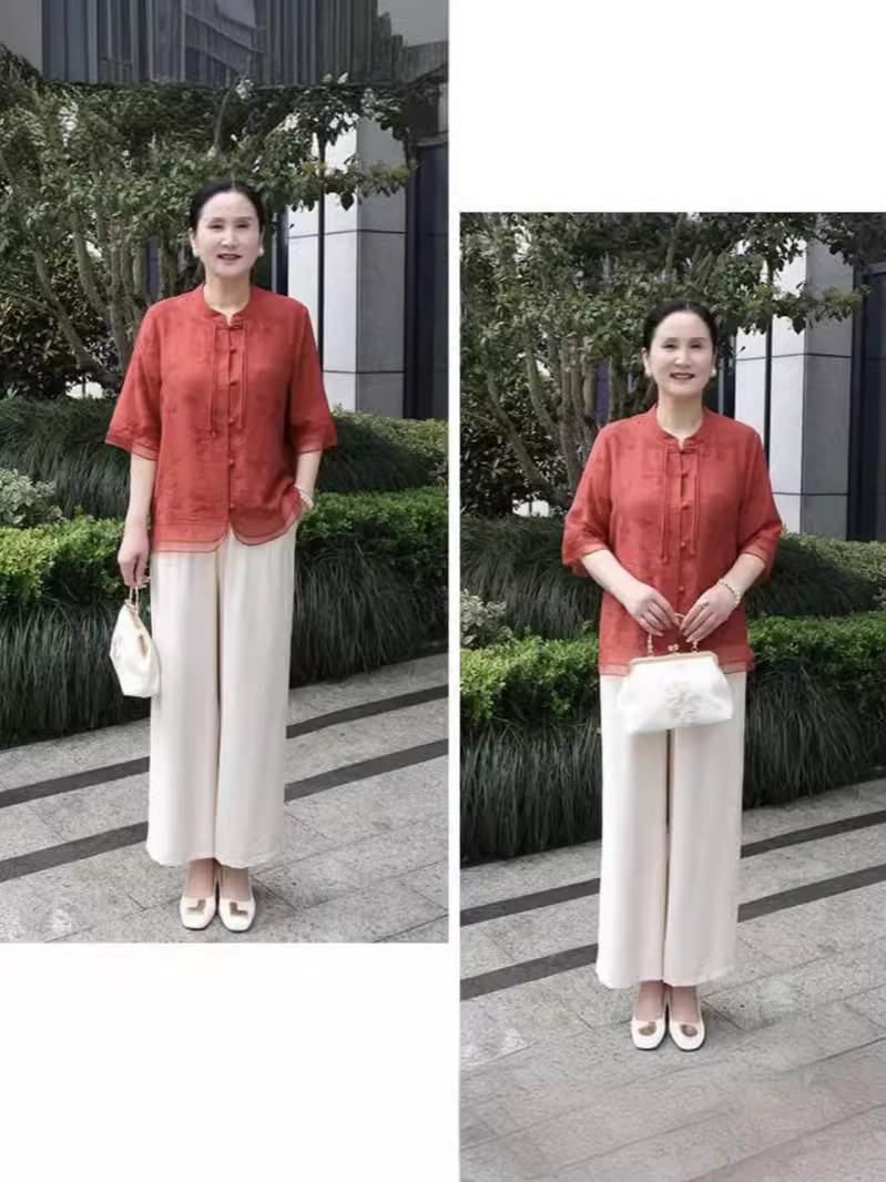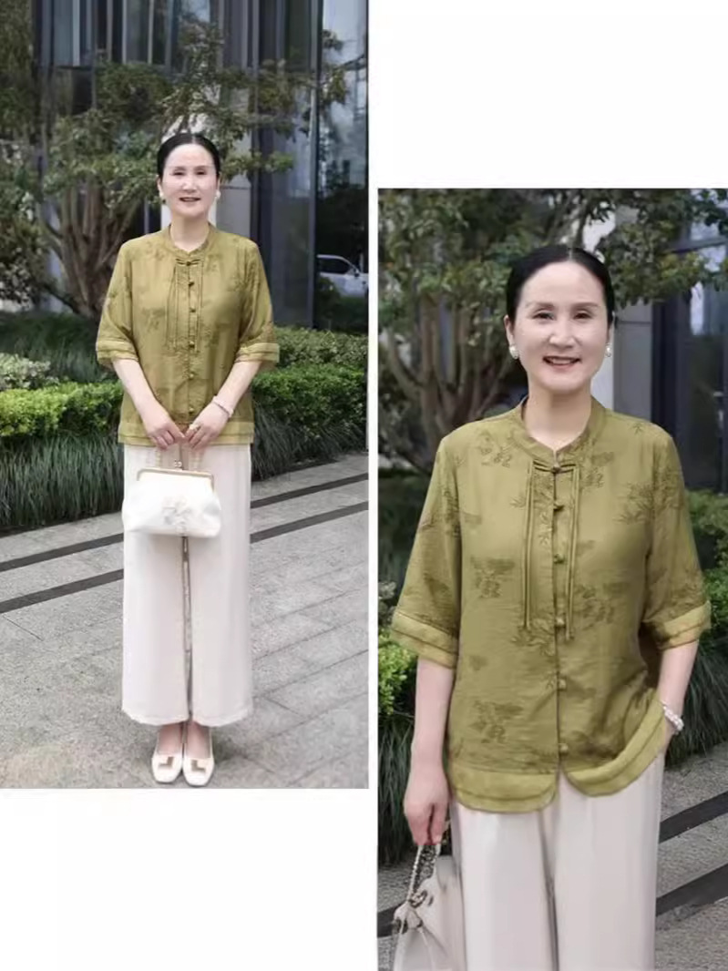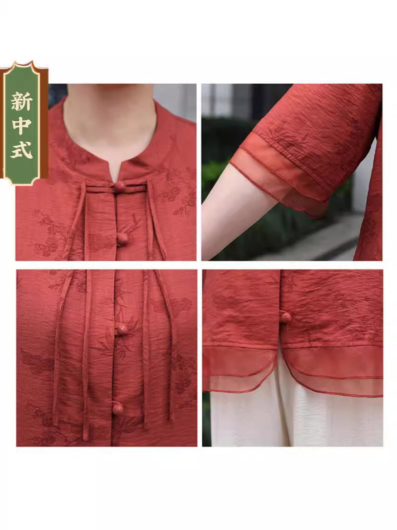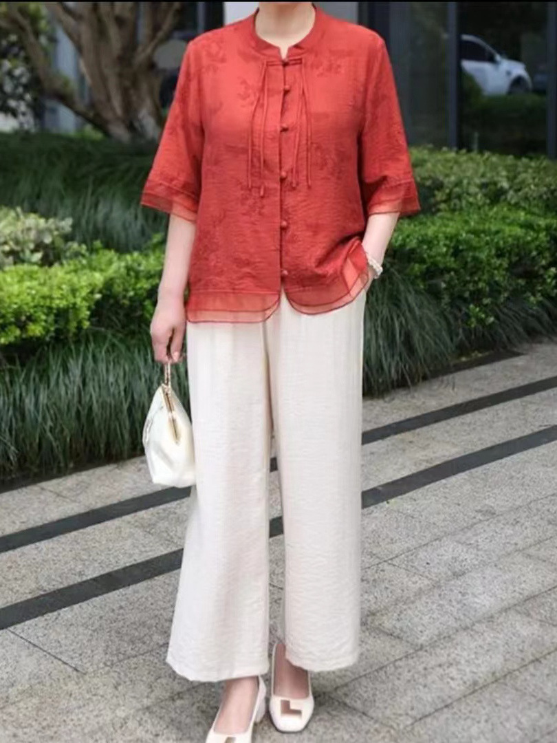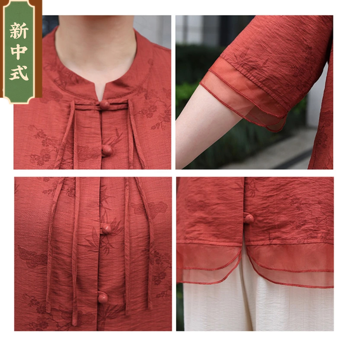 중년 어머니 새로운 중국 짧은 소매 국가 스타일 세트 2024 새로운 어머니 여름 소매 셔츠면 및 린넨 투피스 세트